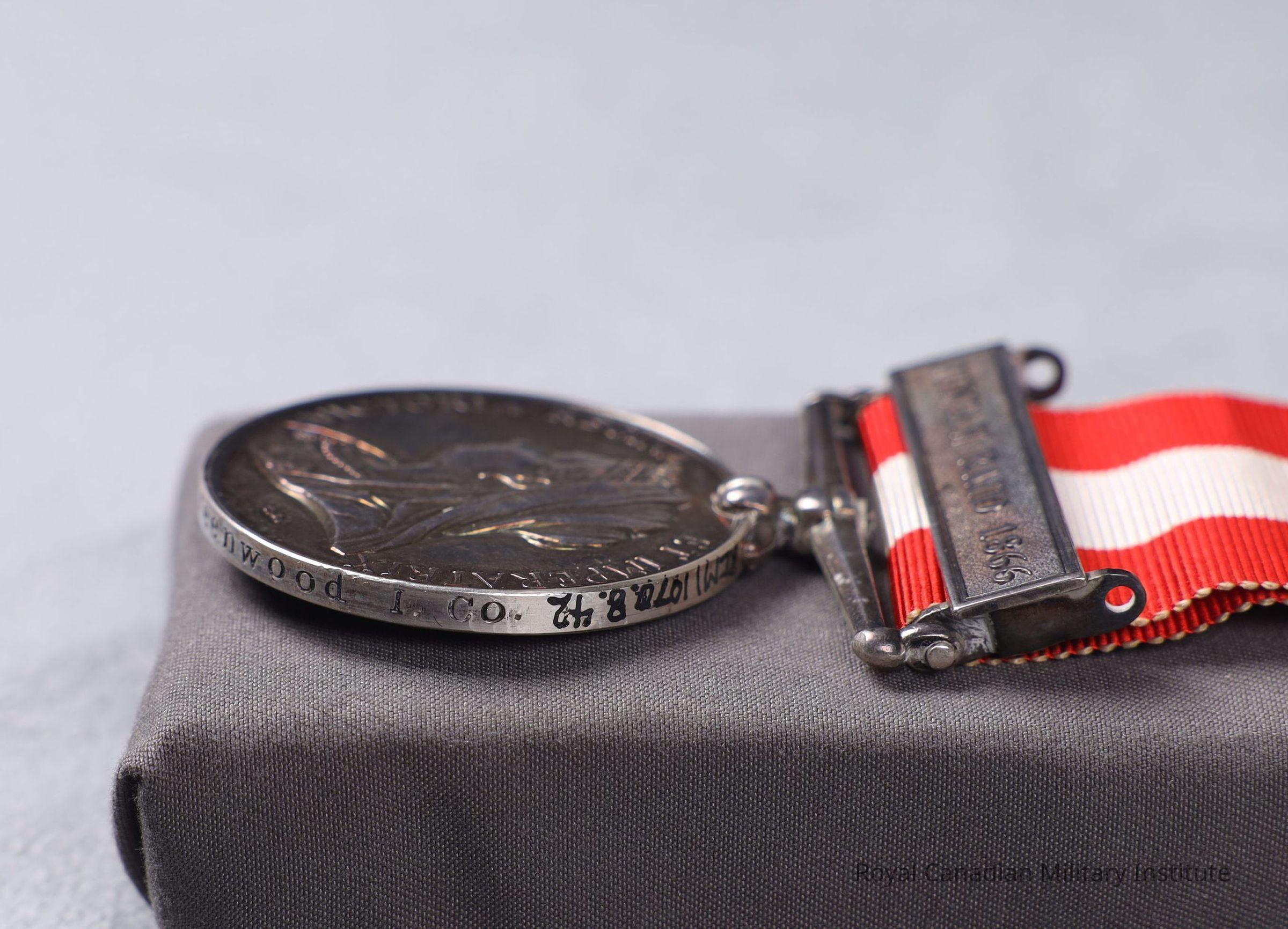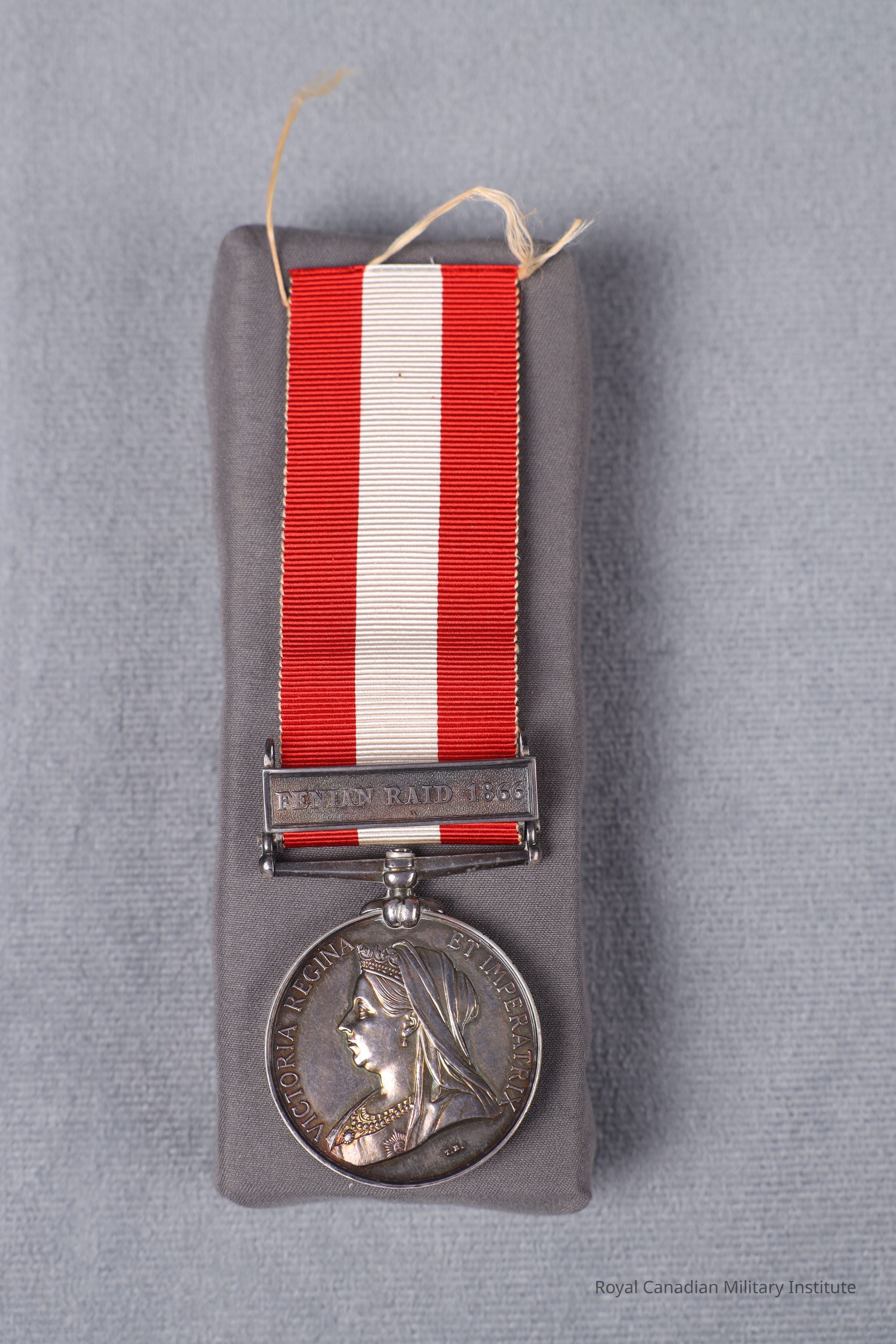 title "Victoria Regina Et Imperatrix". Reverse Canadian Red Ensign surrounded by a maple leaf wreath. "Canada" at top. Suspender plain straight swivelling with double toe claw, with rectangular bar "Fenian Raid 1866" Ribbon is red, white, red, 3.2 x 8 cm.Made/Created