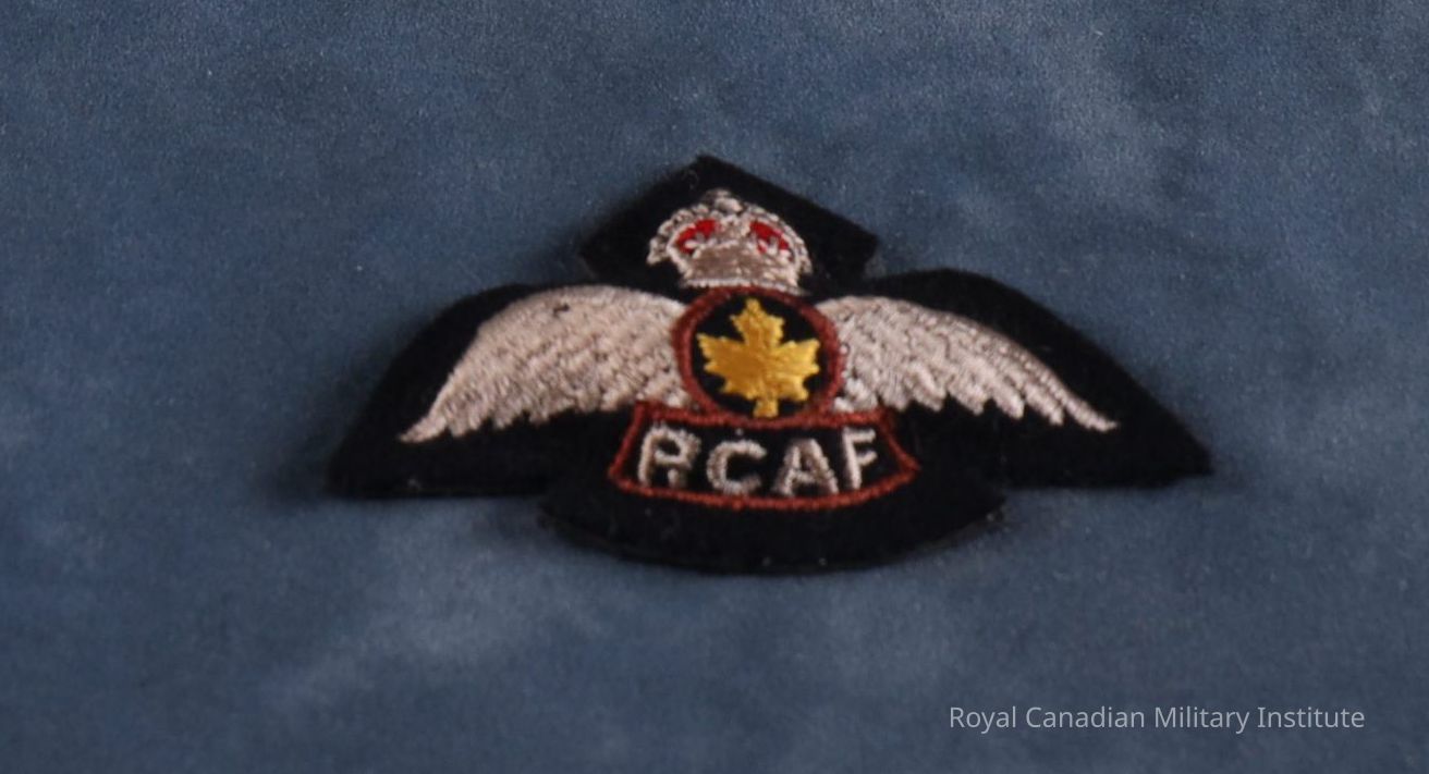 1947-1953 North Atlantic Treaty Organization Aircrew wing qualification badge. Red/white cotton thread King's crown atop yellow cotton thread maple leaf in brown circle. Feathered double wings. At bottom is white cotton thread "RCAF" in brown cotton thread outline. Black wool base. Padded. Black linen backing.Made/Created