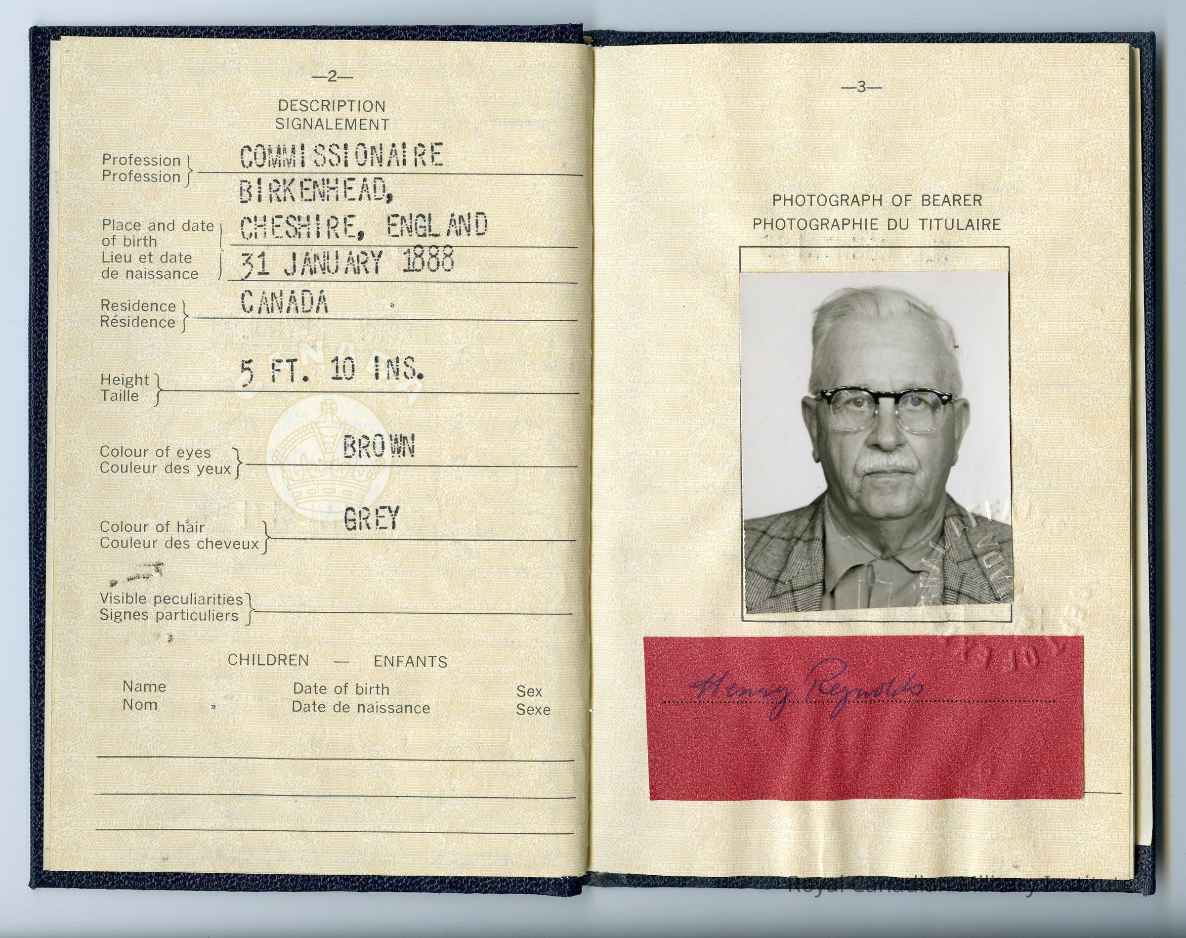 1958 Canadian Passport "4-757900 Mr. Henry Reynolds Canadian Citizen Section 9-1-B." Rectangular, hard-bound blue cardboard covers. Embossed front in gilt "Passport/Passeport Canada" (and Canadian coat of arms). 31 pages. Contains information: birthplace, date, height, eye/hair colour, photograph, signature. Rear page addition of notice concerning travel to Communist countries.Made/Created