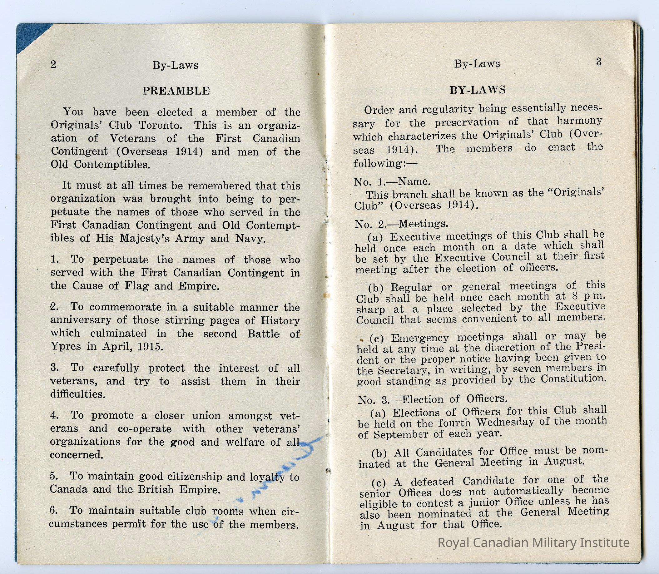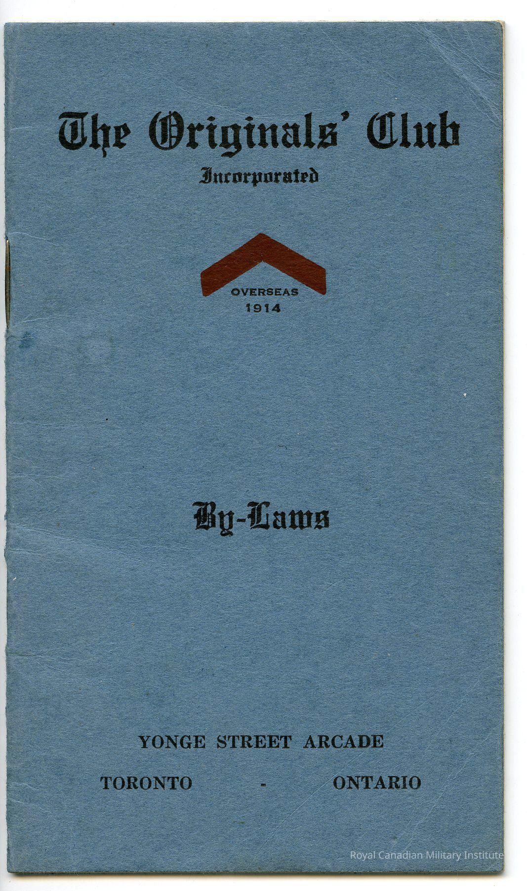 1934-1966 British/Canadian war veterans' "Originals' Club", By-Laws booklet. Rectangular, mid-blue card covers. Front cover with title in dark blue italic script: "The Originals' Club By-Laws" Eighteen pages, with information on Obligations, Preamble, By-Laws, Order of Business, Amendments.Dimensions