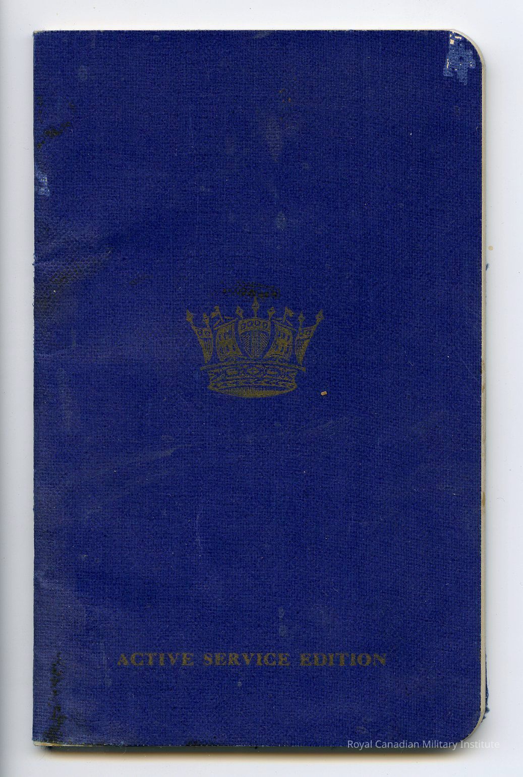 1939 British Naval & Military Bible Society Bible. Rectangular, dark blue card softcover. Embossed on front with dull gilt naval crown and title "Active Service Edition" 74 pages. Contains: message from King George VI, the Gospel of St. John, hymns and notation for "Rock of Ages" and "Abide With Me", suggested daily readings.Inscription/Signature/Marks