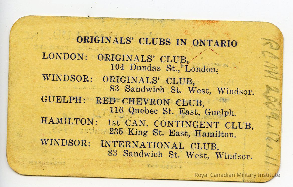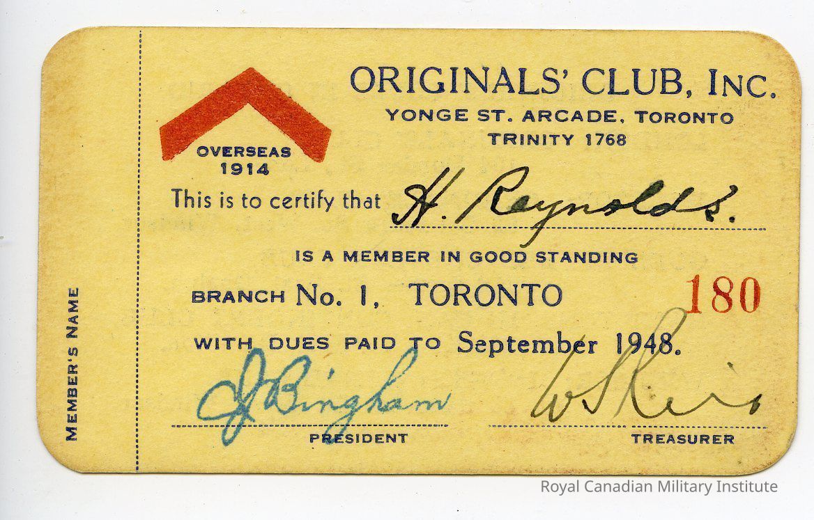 1948 Canadian war veteran's "Originals' Club Inc." membership card. Rectangular yellow card. Title of red chevron and blue "Overseas 1914" and "Originals' Club, Inc." Signed by "H. Reynolds" number 180 of Branch No.1, Toronto. Reverse printed with addresses of Ontario Originals' Clubs in London, Windsor, Guelph, Hamilton, Windsor.Dimensions