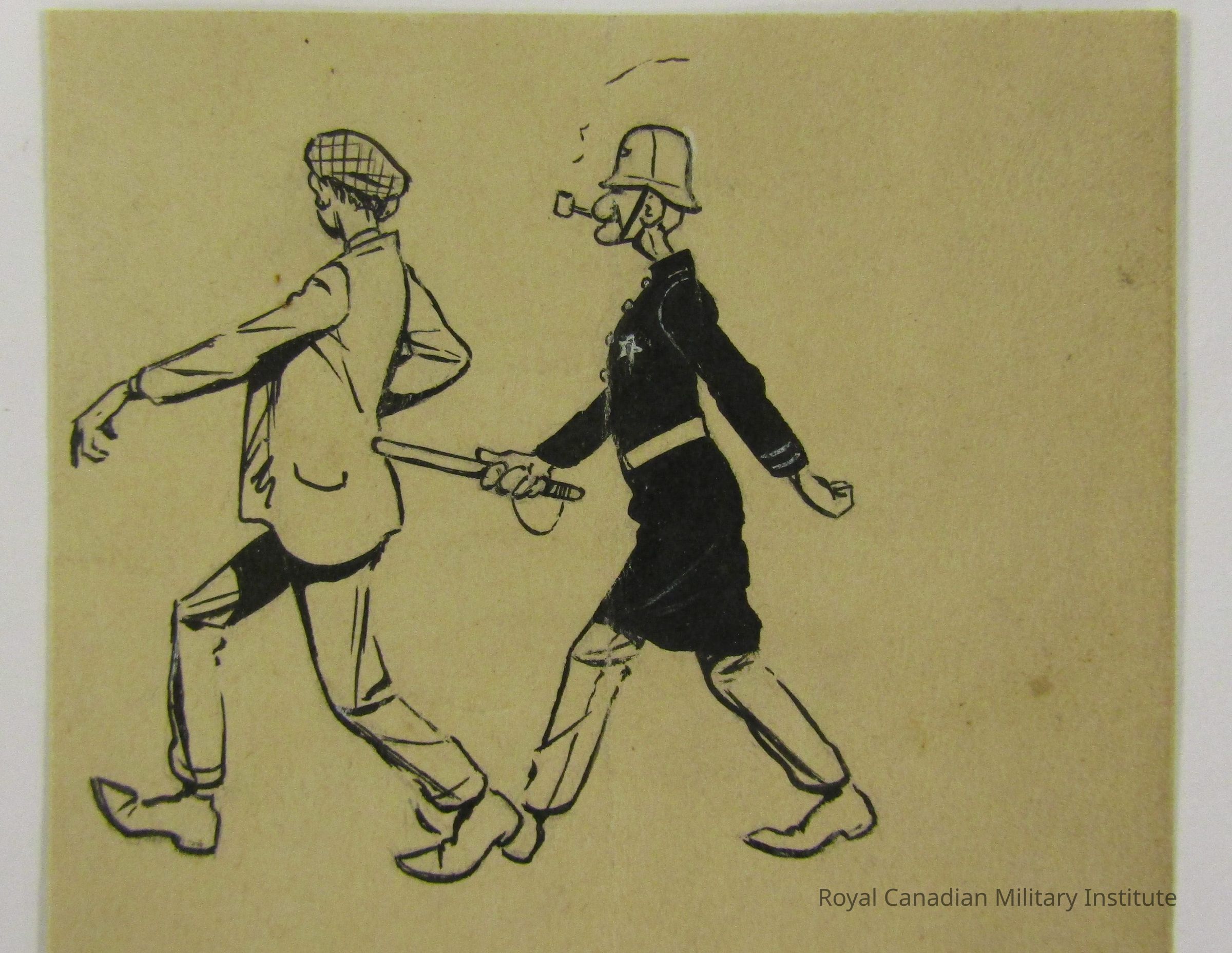 Winslow Mortimer pen/ink cartoon entitled "Pickpocket Out Of Work." This cartoon shows a man being prodded in the back with a policeman's baton. The man, perhaps a pickpocket, is wearing a jacket and plaid cap. He is turned away from the viewer so we cannot see his face. The policeman is walking behind him urging him forward. The policeman is wearing a tall helmet, long dark coat with a star on the breast, and is smoking a pipe.Made/Created