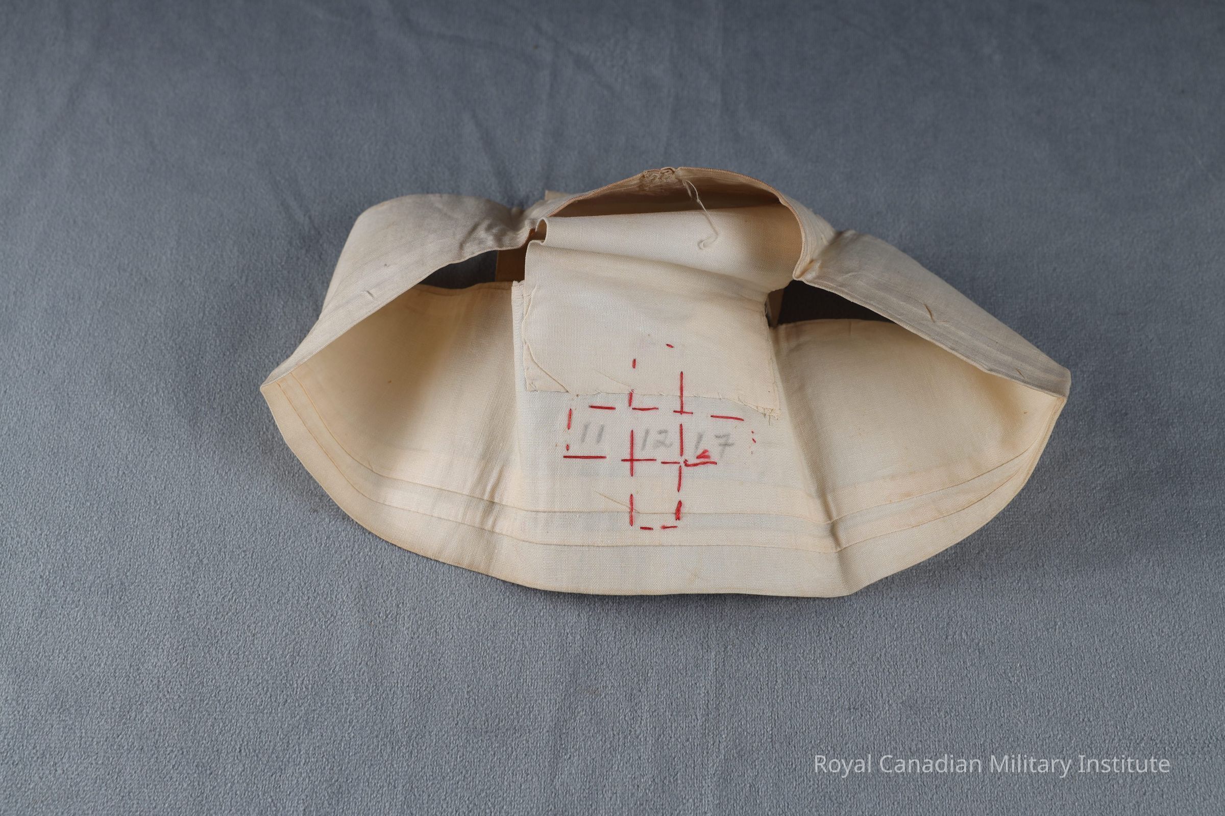 1914-1918 BEF/CEF Medical Corps arm/headband. A Great War medical corps armband made from cloth. It has a stitched red cross in the center. The interior of the armband is dated 11. 12. 17.Context