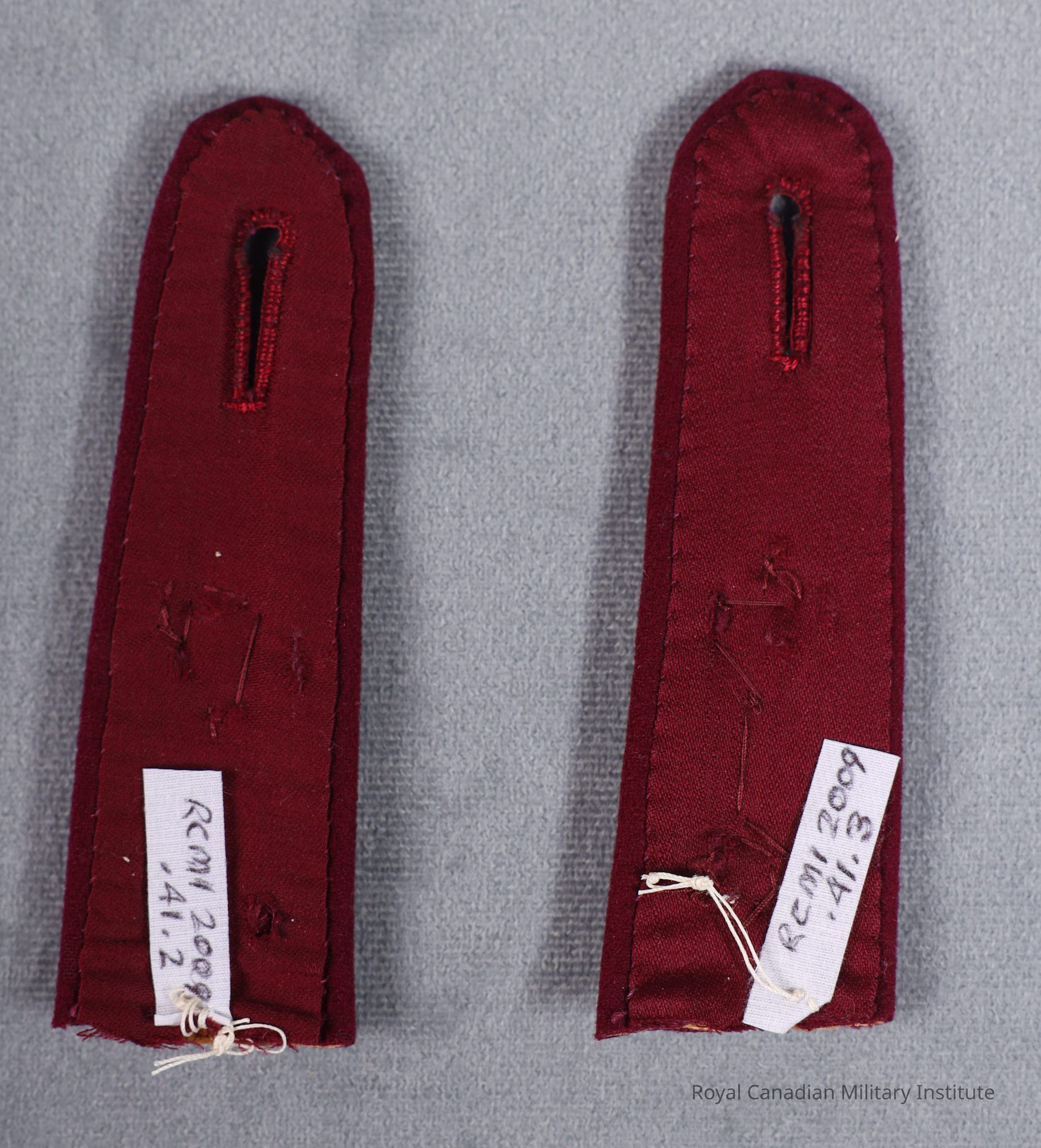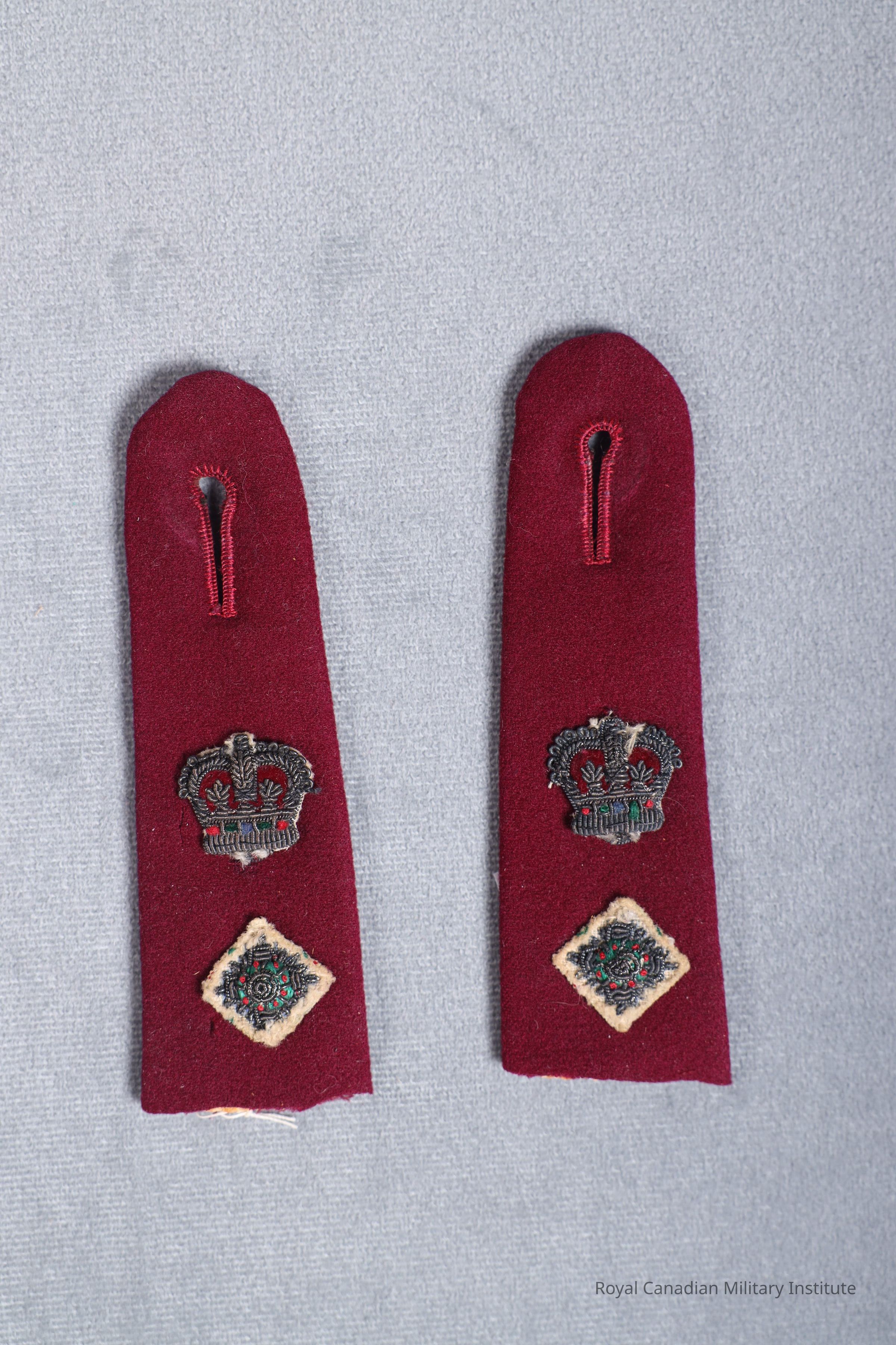 1960s Royal Canadian Army Medical Corps mess dress jacket shoulder strap. Tapered rectangular burgundy wool wrapped/stitched around fiber base. Rounded end has buttonhole slit. Rank insignia of silver bullion wire/burgundy velvet/red-green-blue cotton or polyester thread Queen's Crown and "pip", both on white wool backing.Made/Created