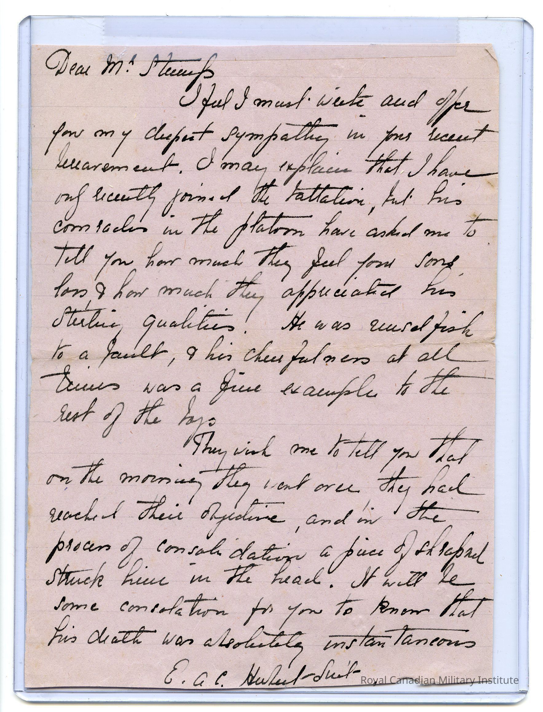 Letter “ON Sympathy for Loss of Sgt. Leonard E. Stump 31st Batt’n CEF Killed at Passchendaele Nov 6 1917”Entry/Object ID