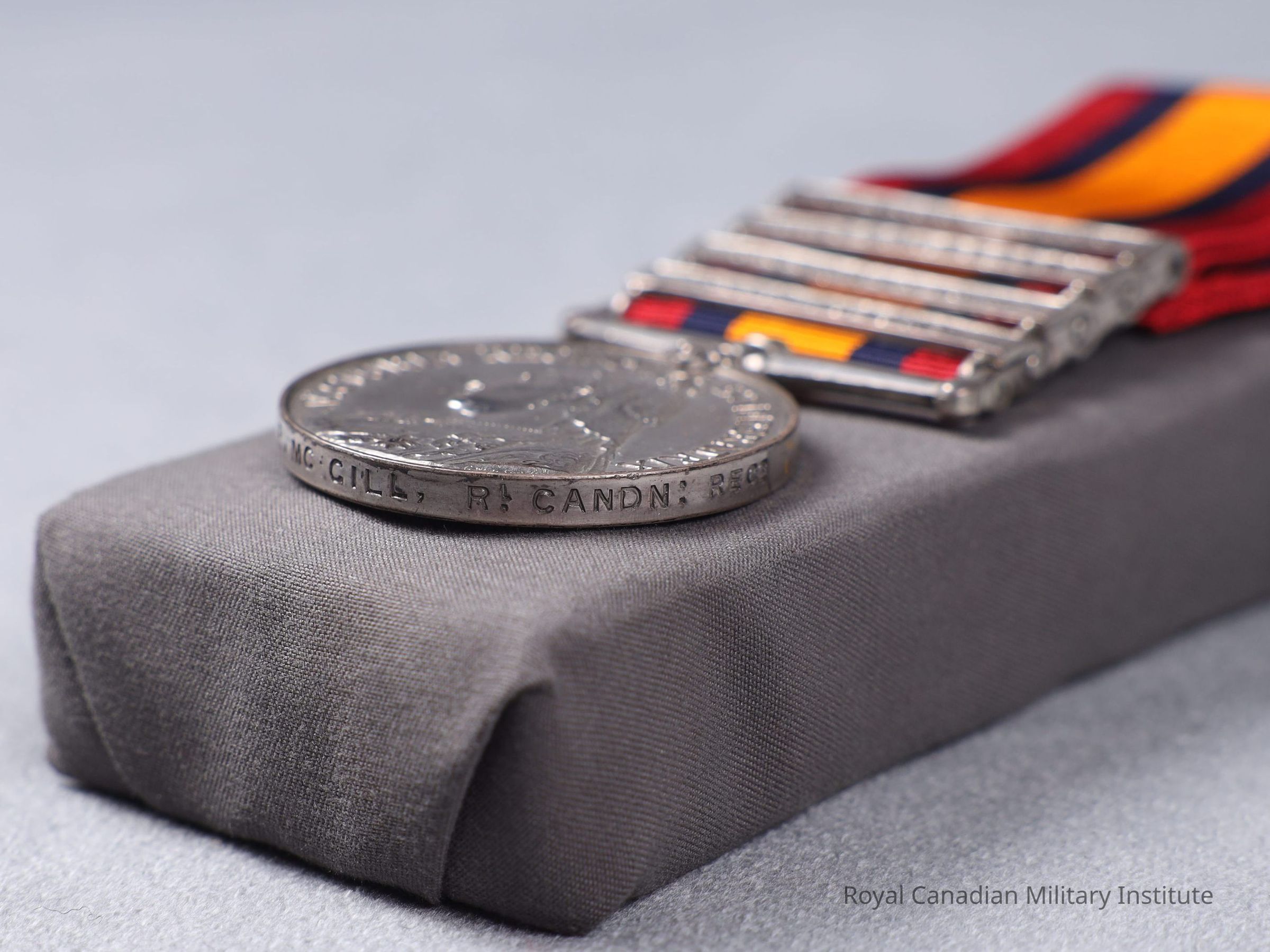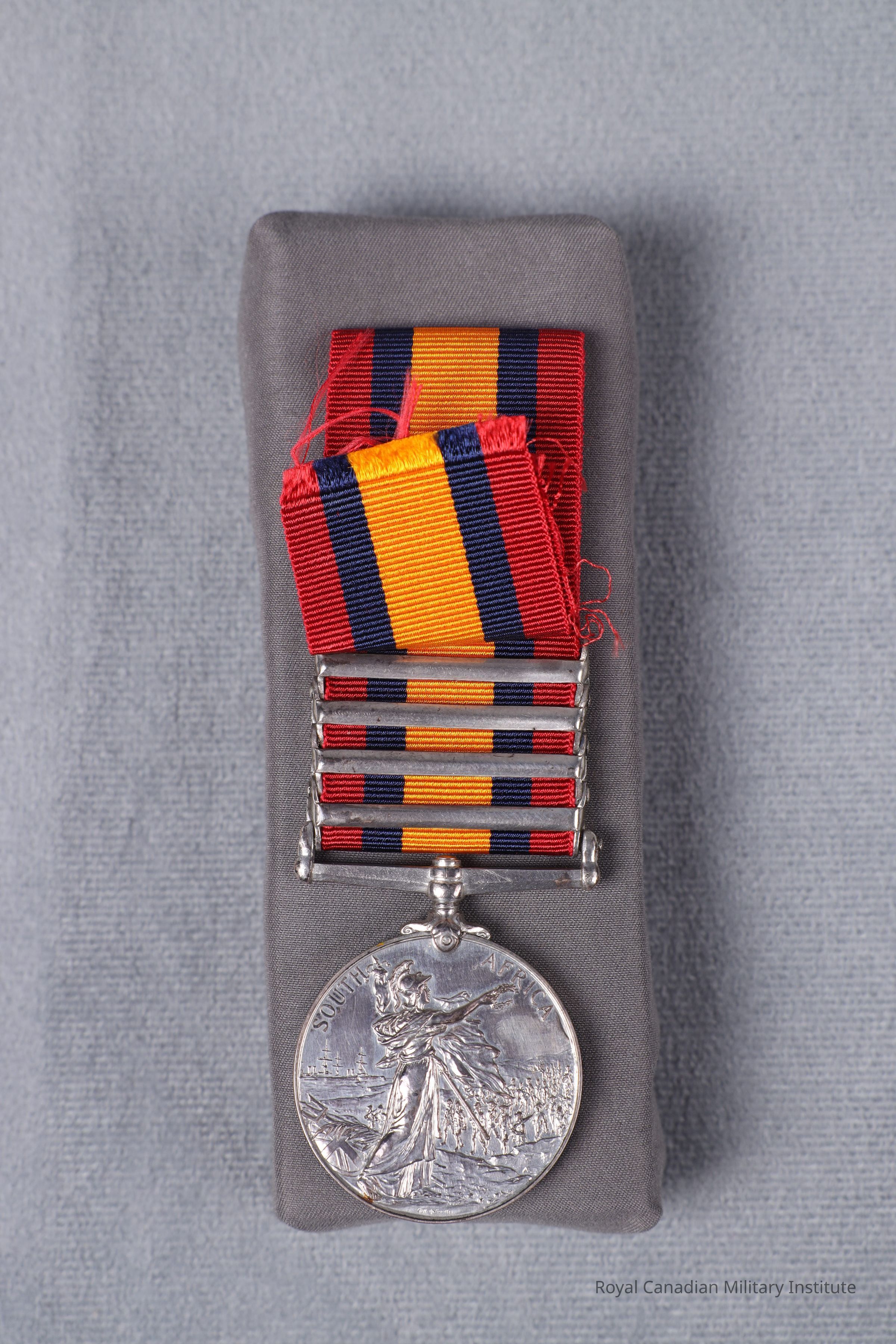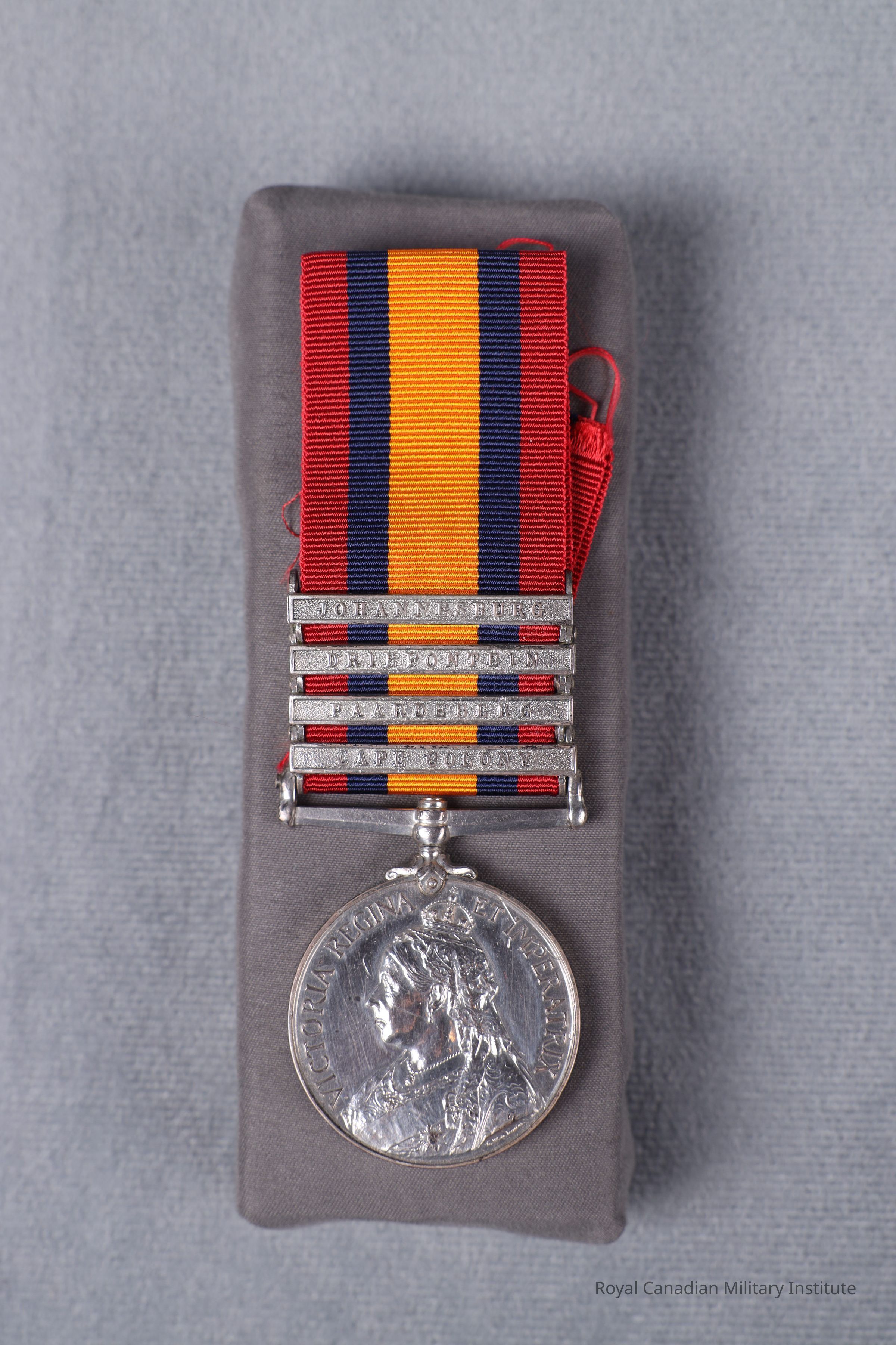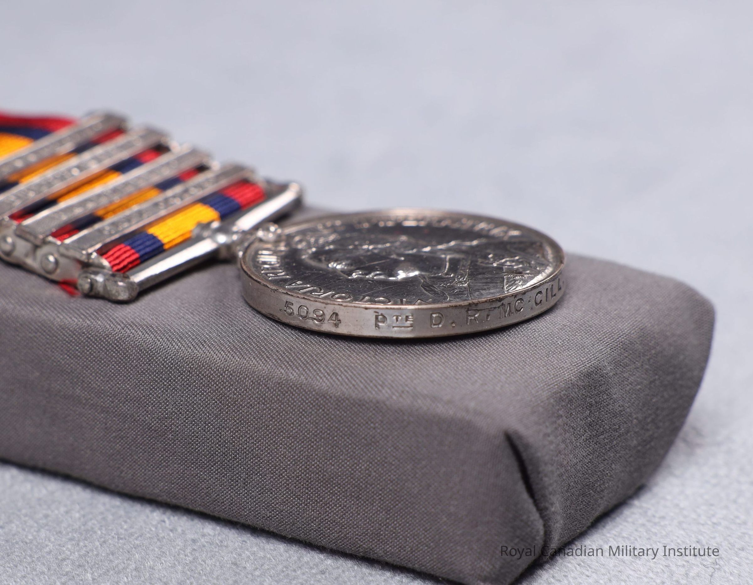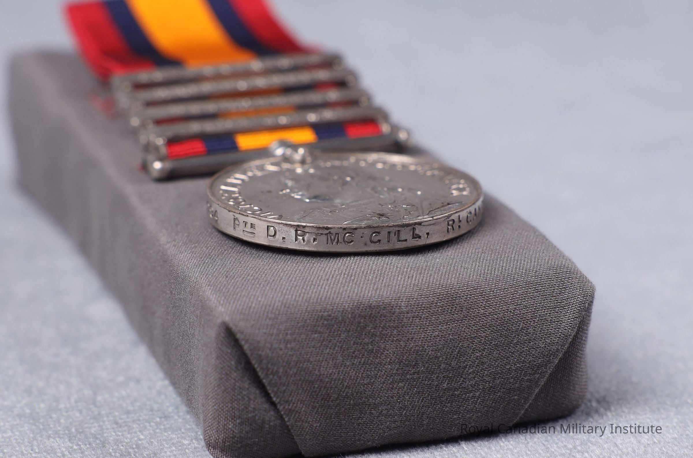 1899-1900 Queen's South Africa Medal, to 5094 Private D.R. McGill, Royal Canadian Regiment. Circular, silver. Obverse crowned bust Queen Victoria with title "Victoria Regina Et Imperatrix." Reverse helmeted Britannia extending wreath to marching soldiers. Titles "South Africa" (erased dates). Fixed, swivelling suspender with four bars "Cape Colony", "Paardeburg", "Driefontein", "Johannesburg." Ribbon (3.4 x 7 cm) is red-blue-yellow-blue-red.Made/Created