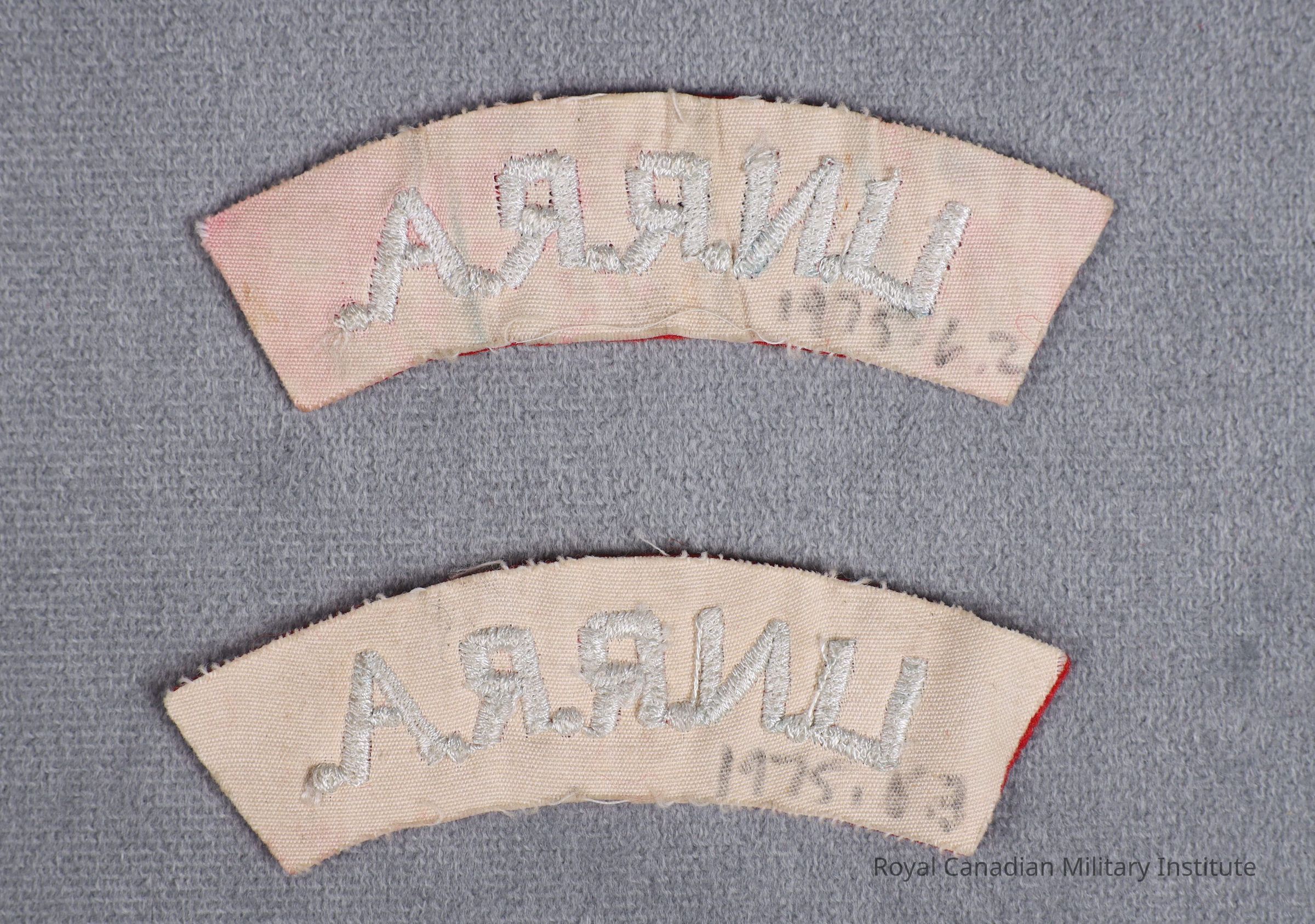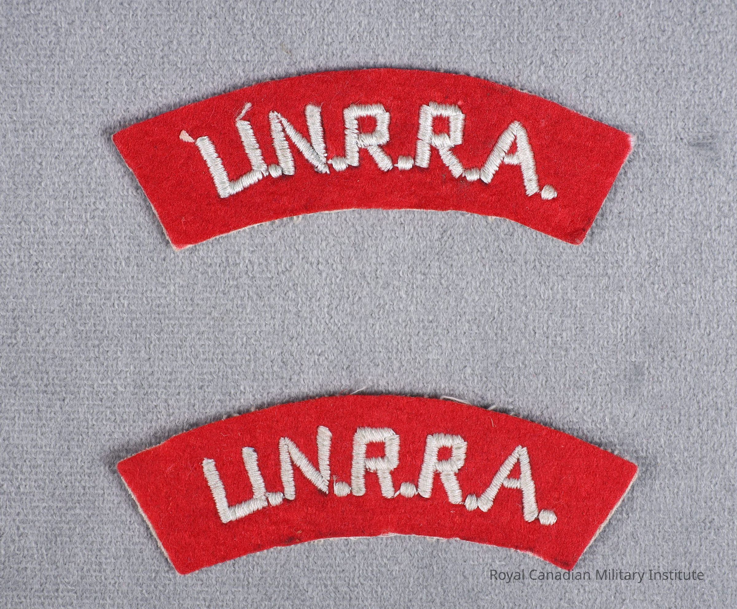 1946 United Nations Relief and Rehabilitation Administration shoulder flash. Curved, rectangular red felt with machine-stitched white cotton letters "U.N.R.R.A." White sateen backing.Made/Created