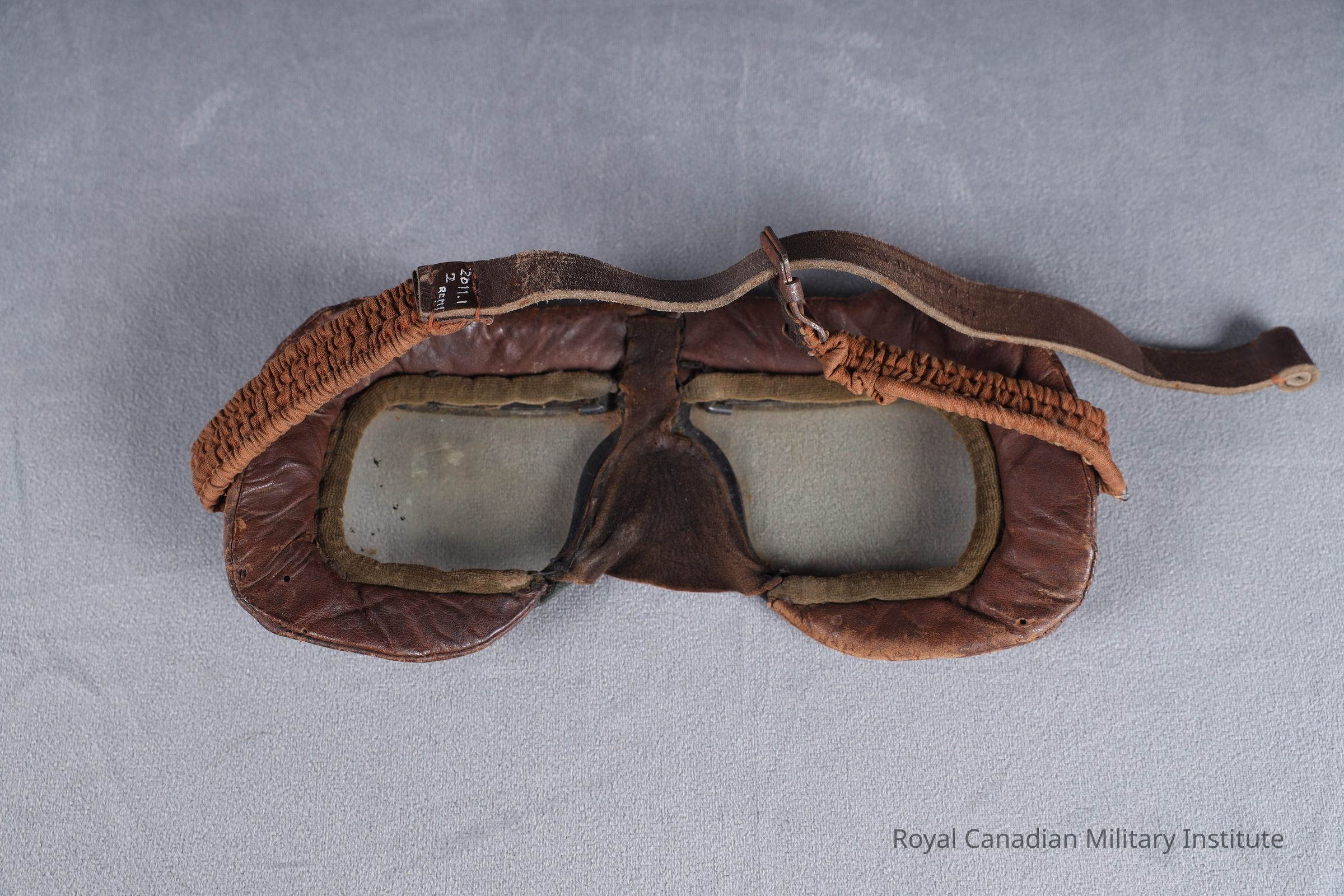 1940 Royal Canadian Air Force Mark III flying goggles. Two 6 x 9 cm. glass lenses set into hinged, black-painted brass frame, screwed and sewn to a padded brown leather liner. inner edge of lenses lined with grey-green chamois leather. Centre triangular nose piece. Stitched to black-painted metal loop on each side is an adjustable strap of brown cotton/steel springs/brown leather: 1.9 x 49 cms.Made/Created