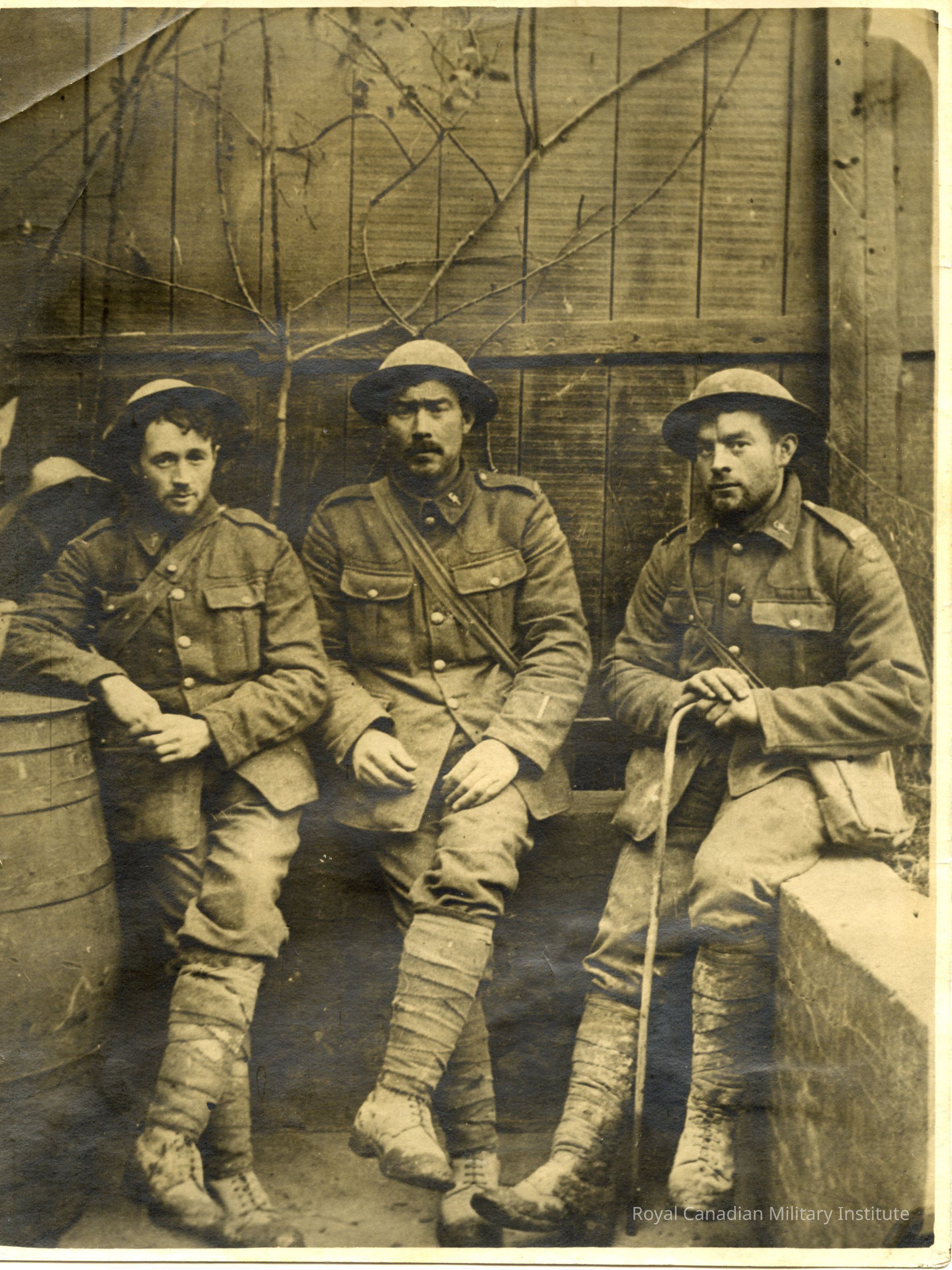 An enlarged period photograph of a postcard showing three Canadian soldiers of the 1st battalion. The three of them are photographed in front of a wooden background. The man on the left is leaning against a barrel. The man in the middle, who has Japanese facial features, is sitting back against the wood. The man on the right is sitting on a low brick wall. Their boots are muddy.