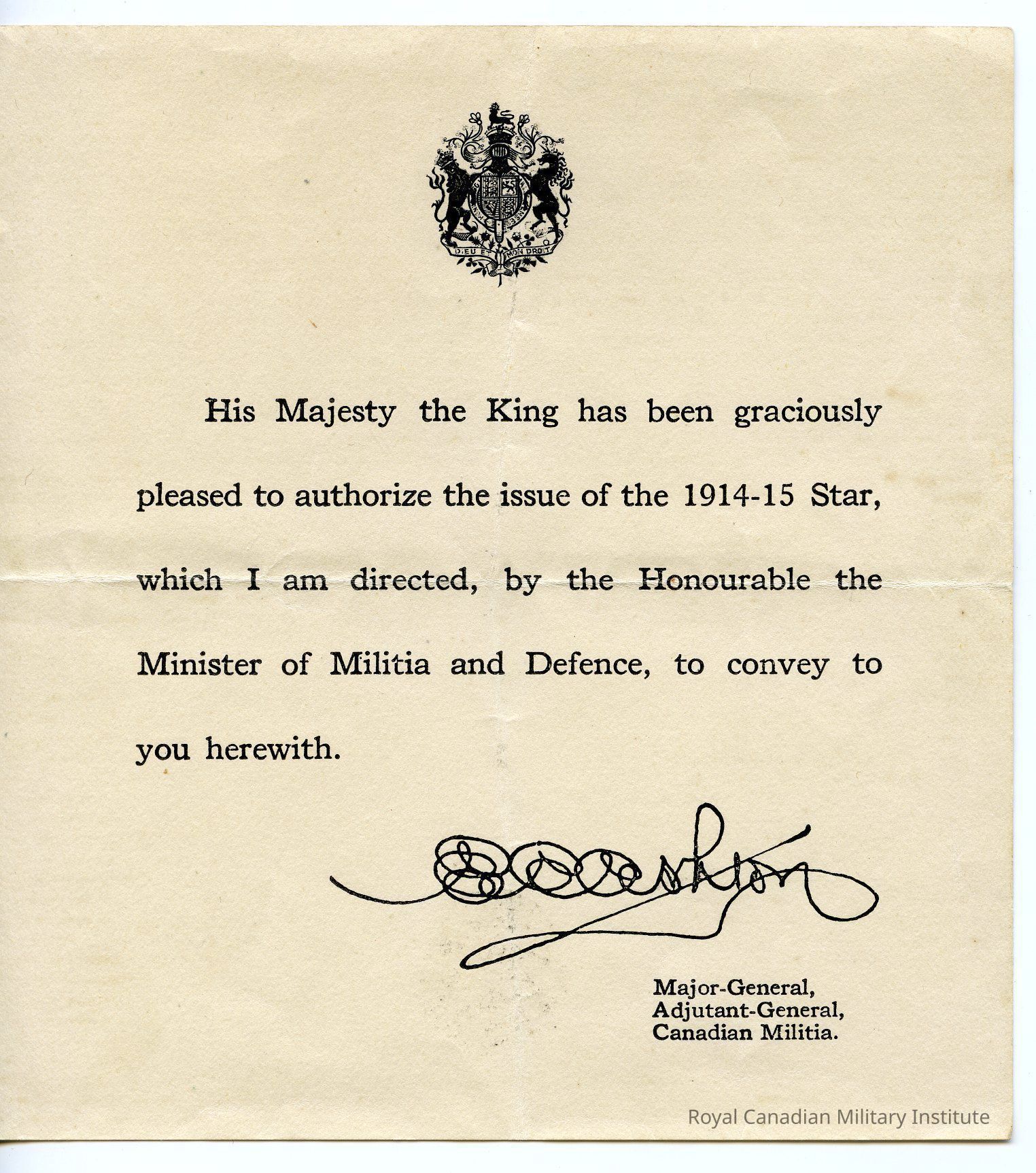 1918-1919 Canadian Militia 1914-15 Star authorization letter, to 413036 Sergeant Cecil Clarence Simmens, 24th Victoria Rifles of Canada, Canadian Expeditionary Force. Embossed with black ink British coat of arms top centre. Reads: "His Majesty the King has been graciously pleased to authorize the issue of the 1914-15 Star..." (signed E.C. Ashton, Adjutant-General, Canadian Militia)Made/Created