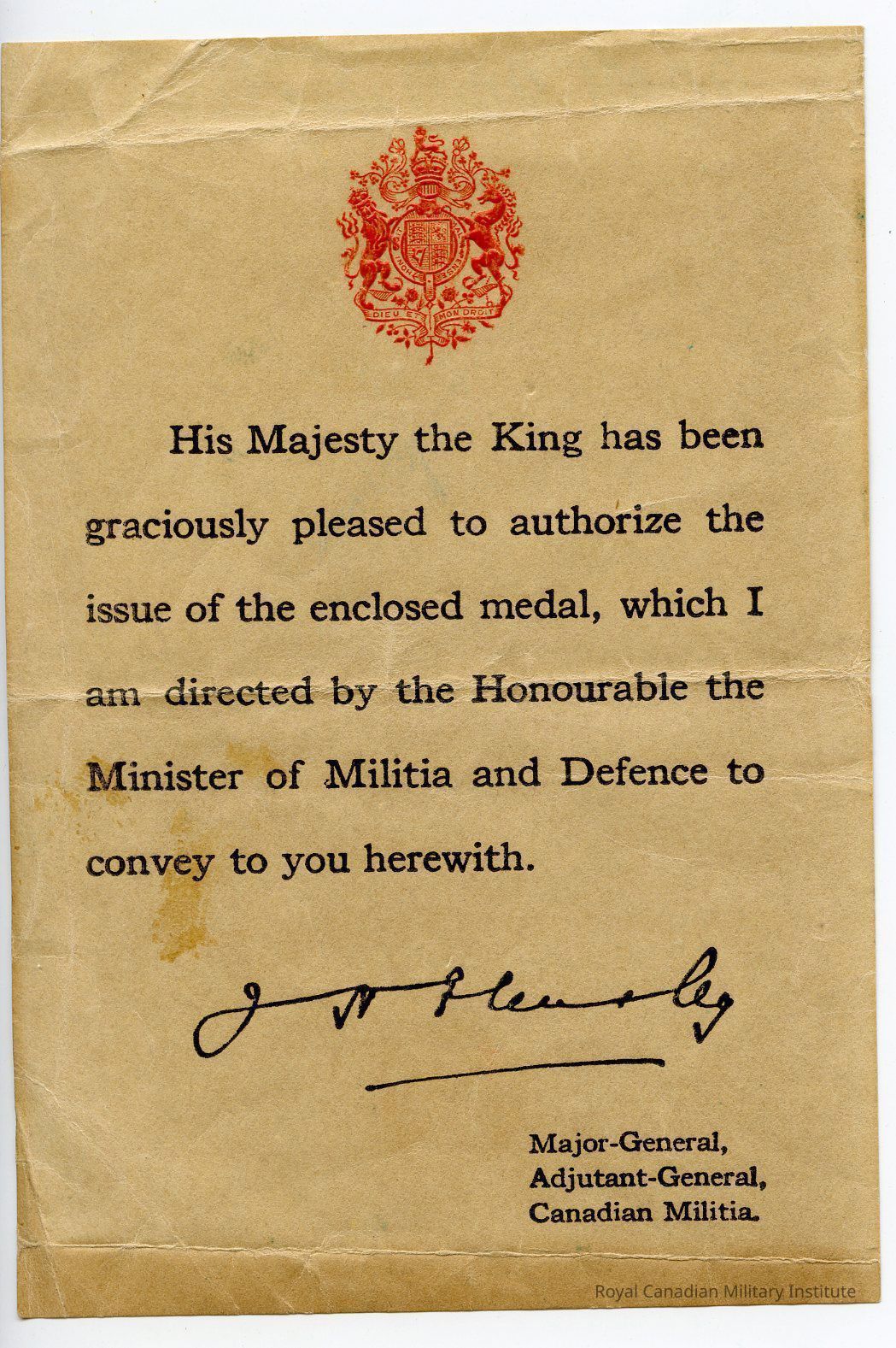1918-1919 Canadian Militia authorization letter for 1914-1920 British War Medal, to 413036 Sergeant Cecil Clarence Simmens, 24th Victoria Rifles of Canada, Canadian Infantry Battalion. Rectangular tan (now yellowed) paper. Embossed at top with red British Coat of Arms. "His Majesty the King has been graciously pleased to authorize the issue of the enclosed medal..."Made/Created