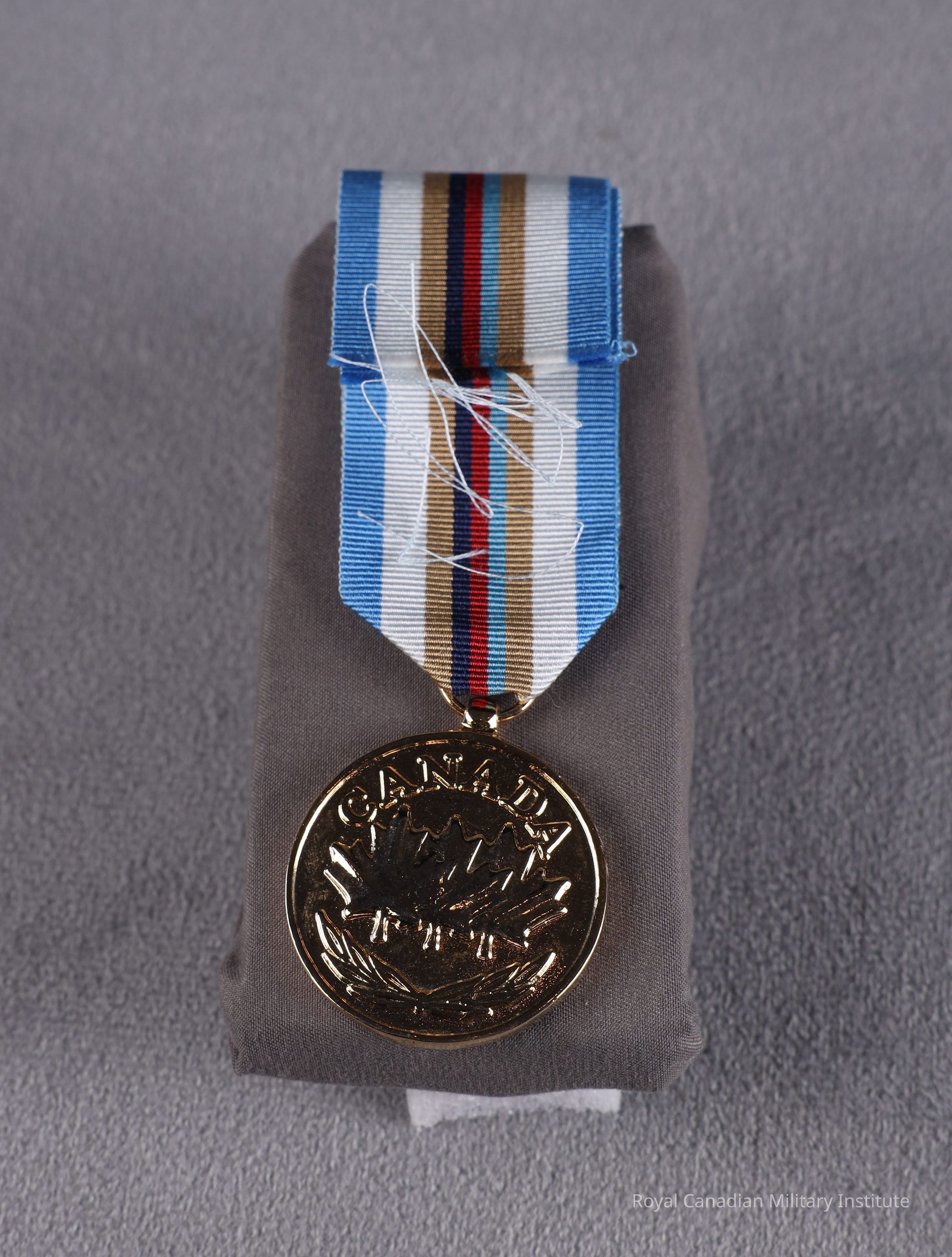 1992-1993 Canadian Forces Somalia Medal, copy. Circular, gold coloured alloy. Obverse shows title "Canada" above three maple leaves and laurel wreath at base. Reverse shows title "Somalia. Somalie. 1992-93." In centre is Royal crown and cypher "EIIR" suspender is fixed hole at top with loose ring, ribbon is light blue, white, sand, dark blue, red, light blue, sand, white, light blue, 3.5 x 6.5 cm.Made/Created
