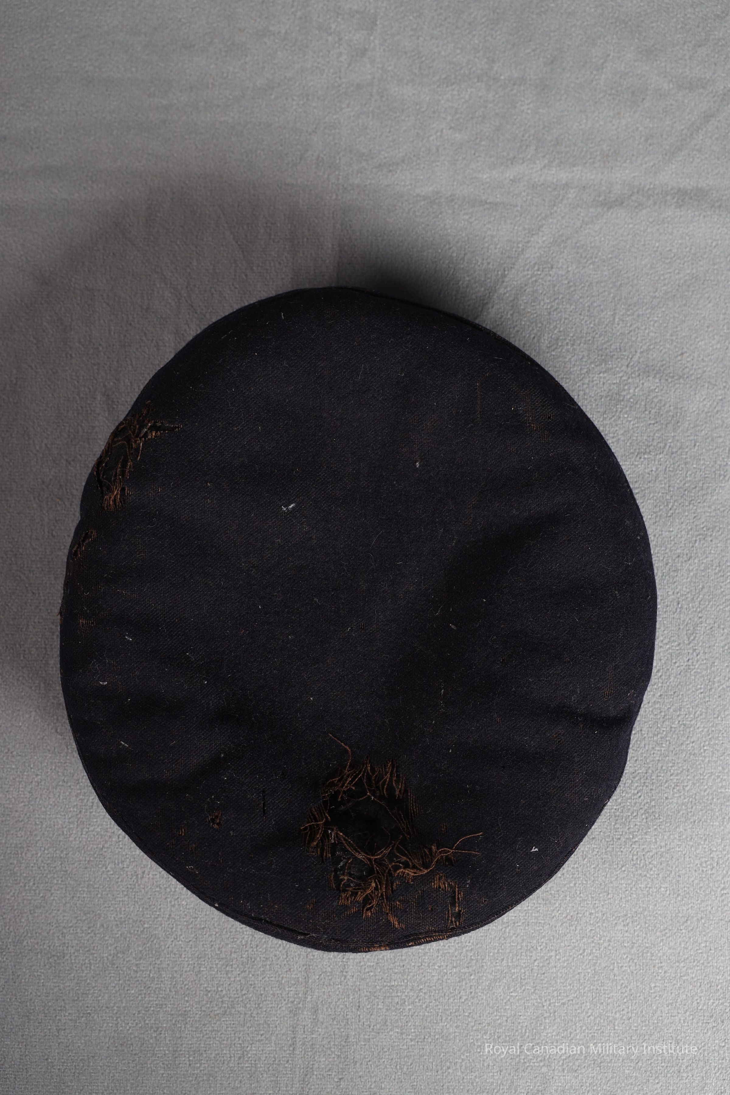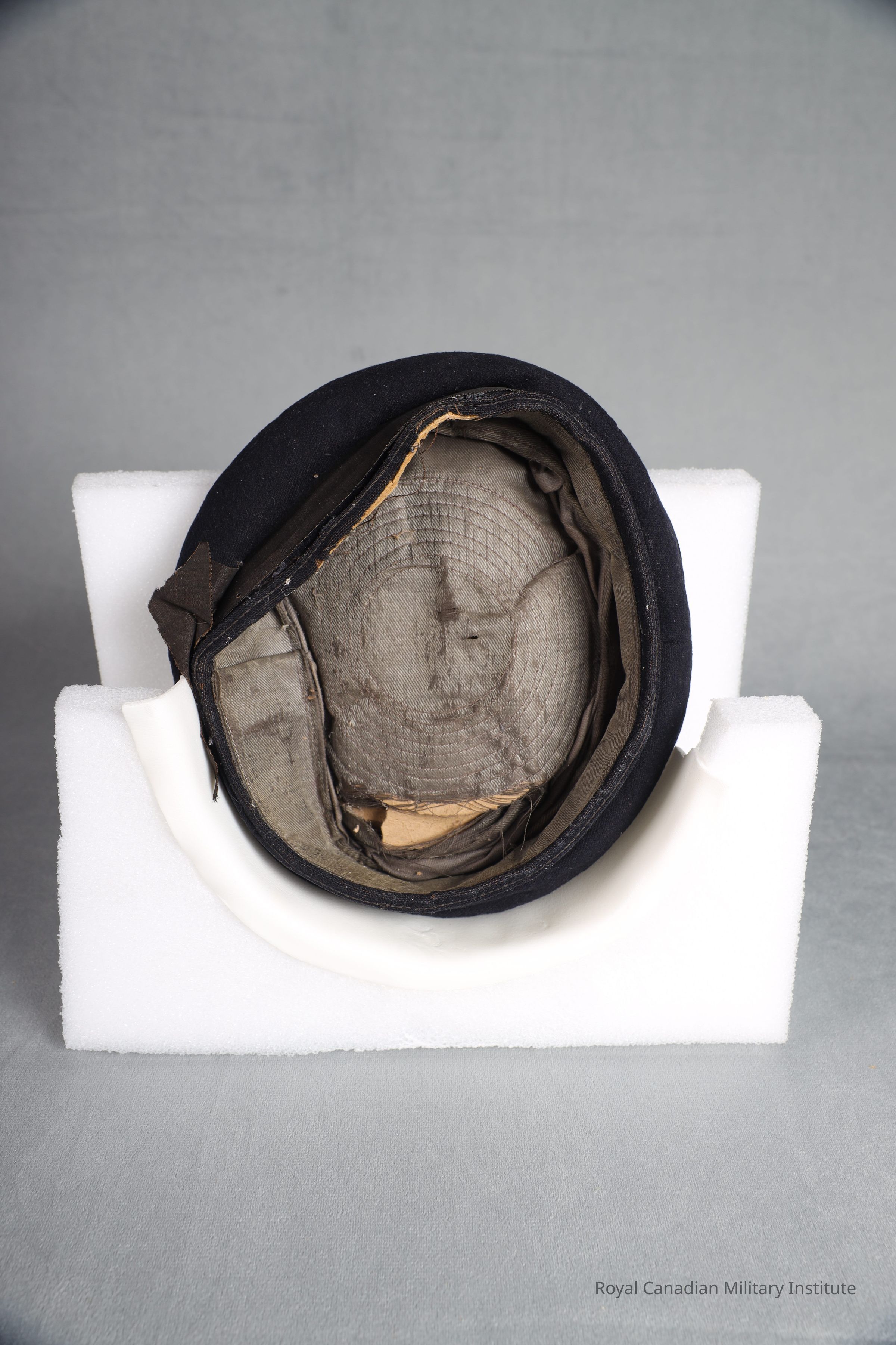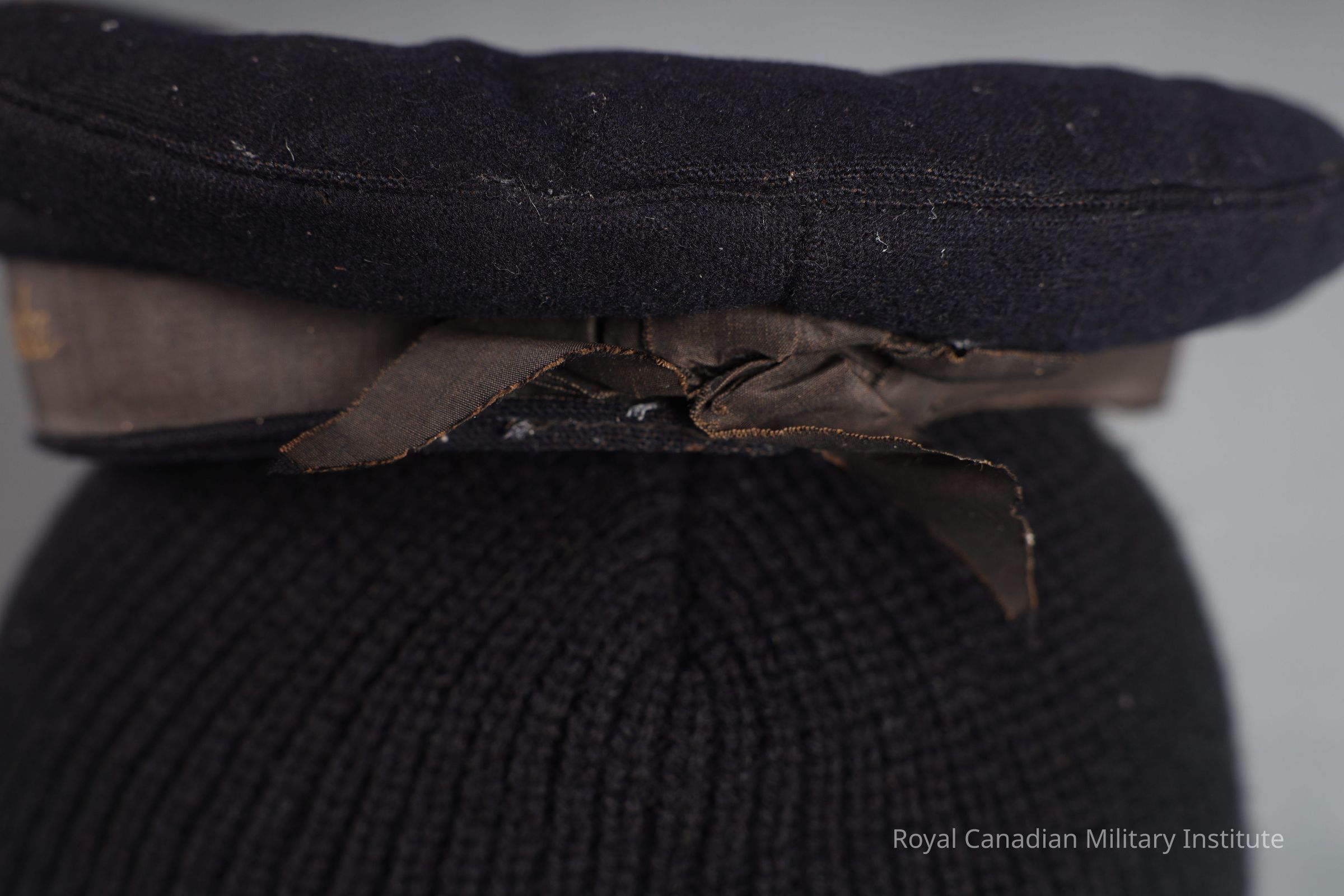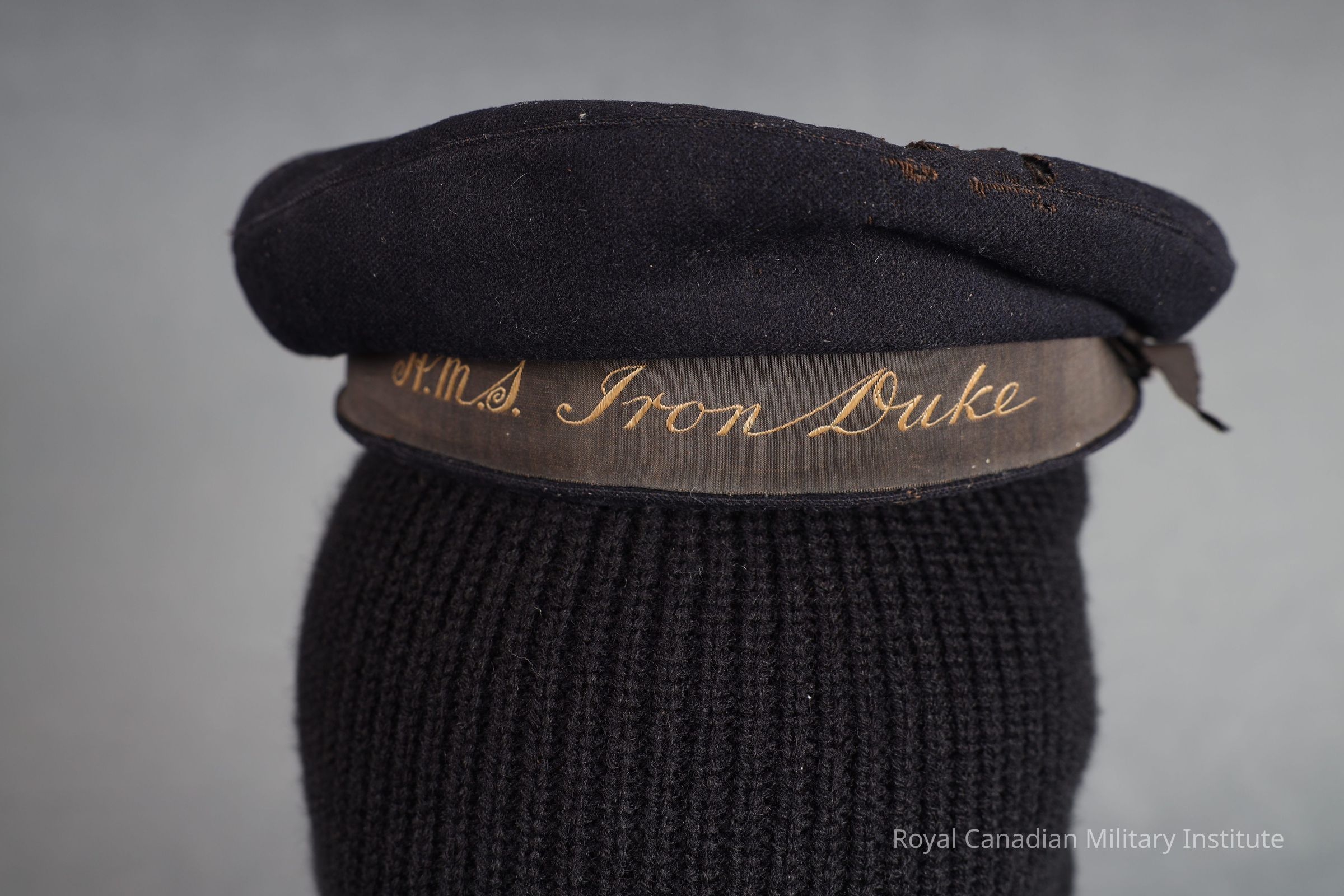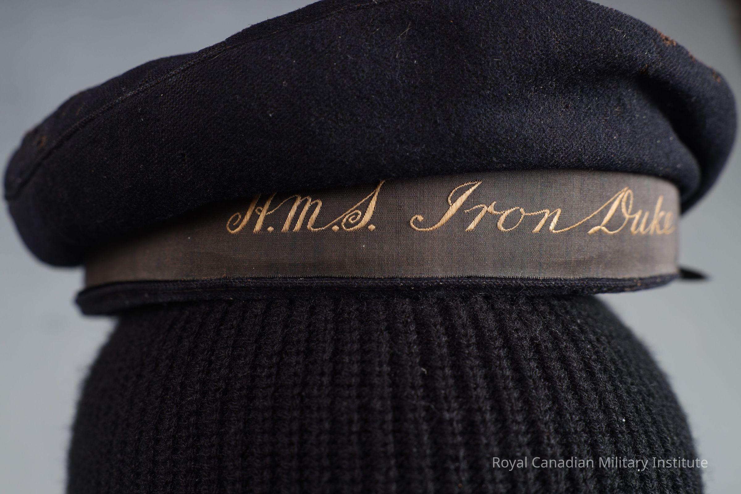 A Royal Navy flattened cap made from blue cloth. It was always worn with a cap ribbon. Based on instructions, the cap was worn on the center of the head with the ribbon front centered. On the ribbon is the name "R.M.S. Iron Duke." The interior of the cap is made from a cloth chinstay, supposed to contain the name of the maker, and the lining is stitched in a circular pattern.Context