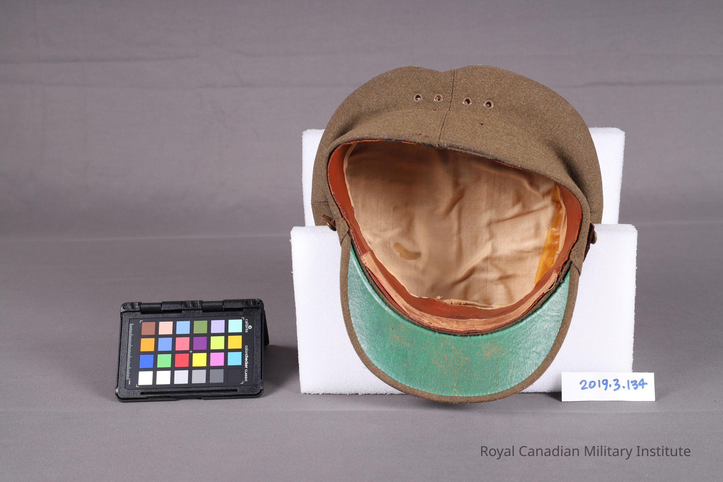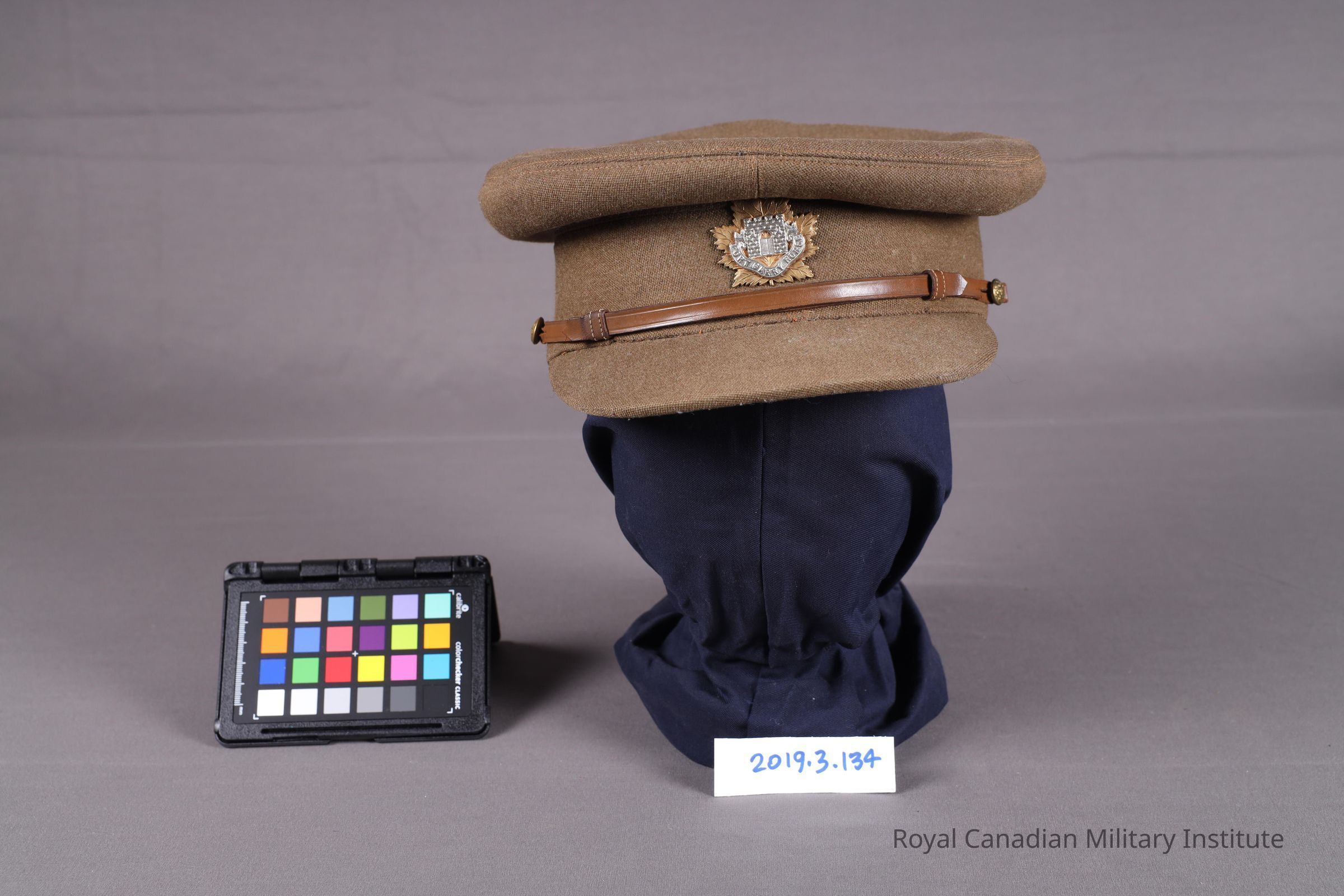 A Great War service khaki cap made from drab wool material. The top is flattened and has a front visor. Attached is an adjustable leather chinstrap connected to two chinstrap buttons on either side of the cap. In the center is the Fort Garry Horse cap badge. It is a bronzed maple leaf badge with a white metal fort-gate house in the center. The words "Fort Garry Horse" are inscribed at the bottom of the fort. The interior contains a marigold sweatband and lining.Context