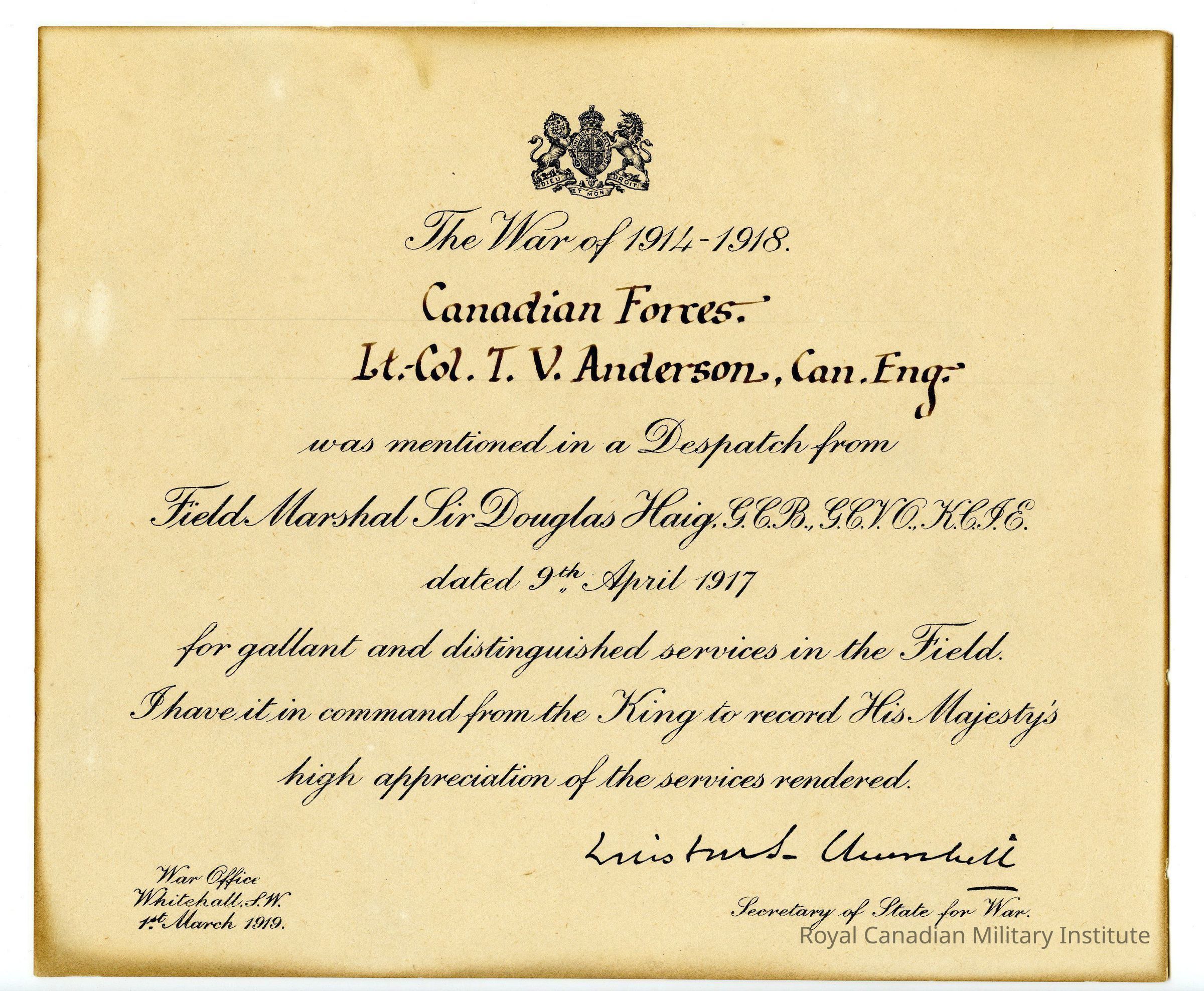 1917 Canadian Forces "Mentioned in Despatches" certificate/scroll, to Lieutenant-Colonel T. V. Anderson, Canadian Engineers. Centre top embossed in black with British coat of arms. Title "The War of 1914-1918" Hand-lettered calligraphic title "Canadian Forces Lt.Col. T.V. Anderson, Can.Eng." signed at bottom "Winston S. Churchill"Made/Created