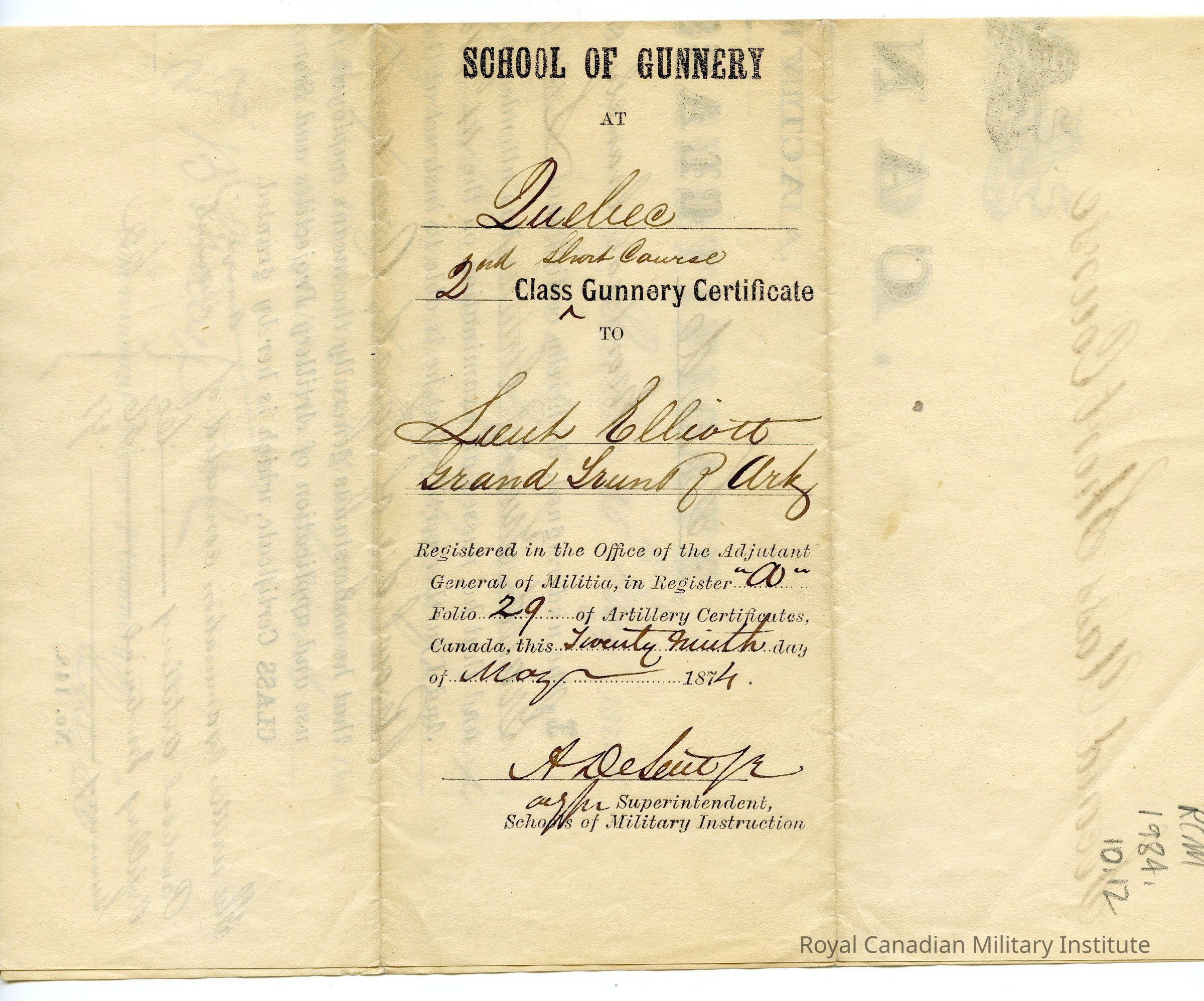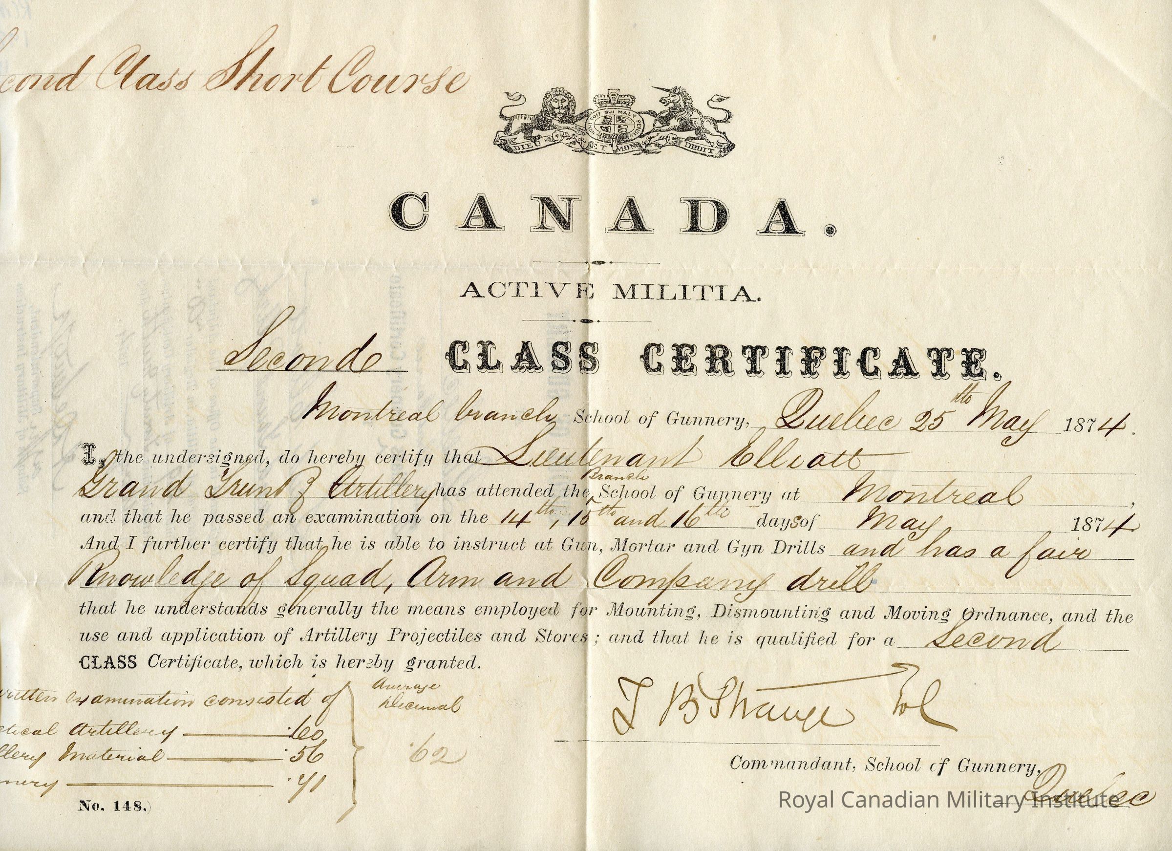 1874 dated Quebec School of Gunnery, 2nd Class Short Course Gunnery Certificate "Lieutenant Elliott, Grand Trunk of Artillery." Rectangular, tan-white paper. At top is Canadian coat of arms, title "Canada Active Militia Second Class Certificate" Partial text "certify that Lieutenant Elliott has attended the School of Gunnery at Montreal...has passed an examination...and is able to instruct at Gun, Mortar, and Gyn Drills and has a fair knowledge of Squad, Arm, and Company Drill..."