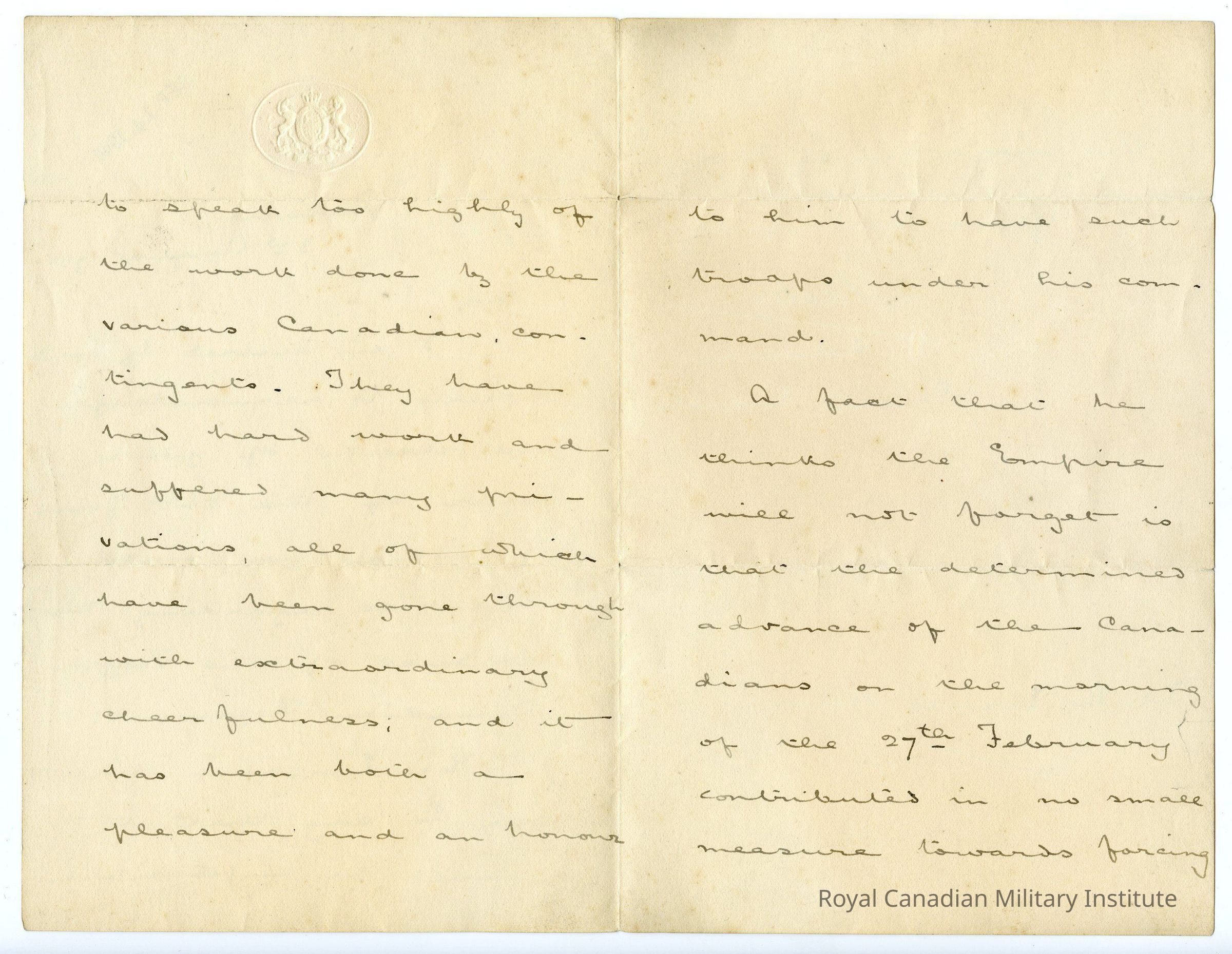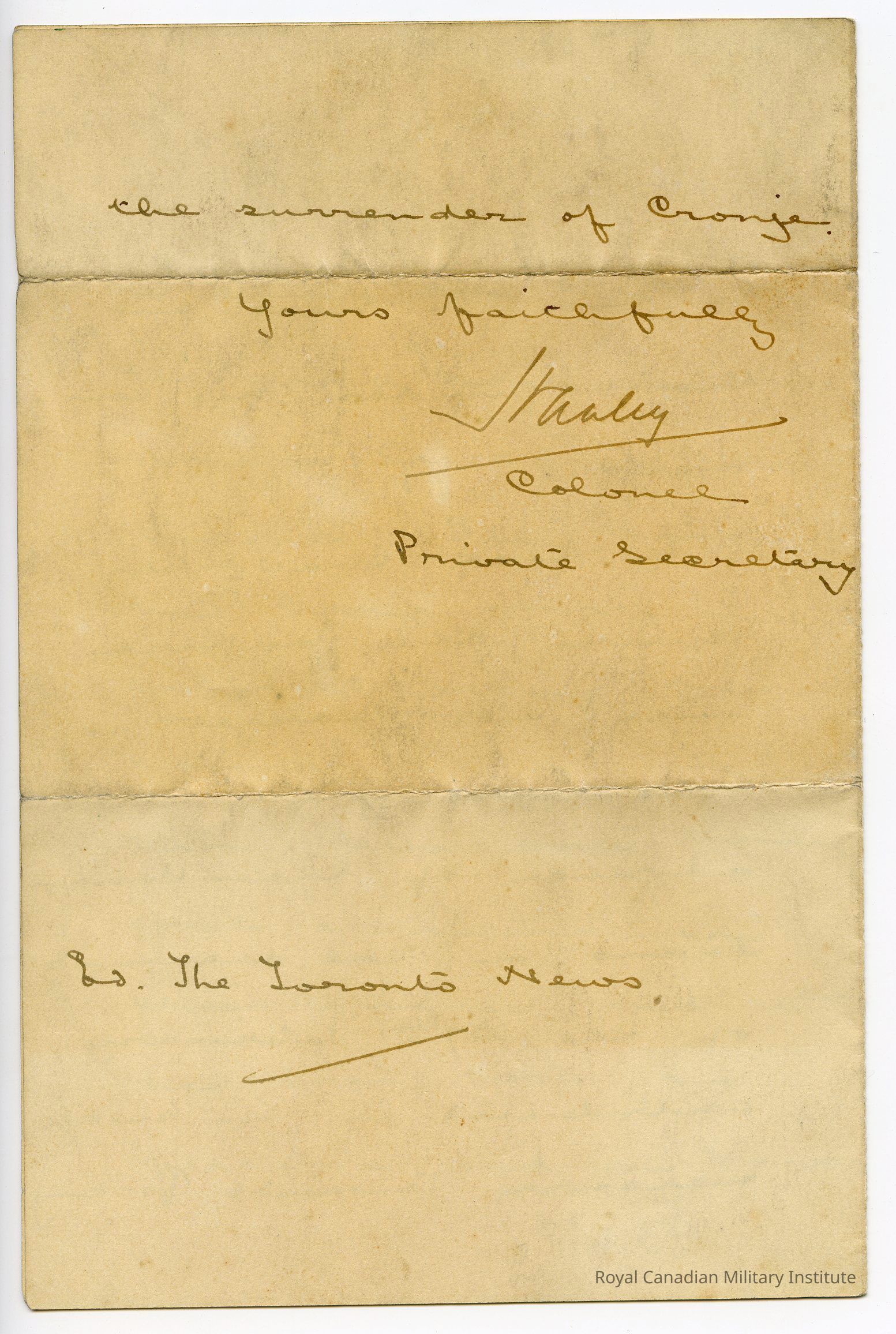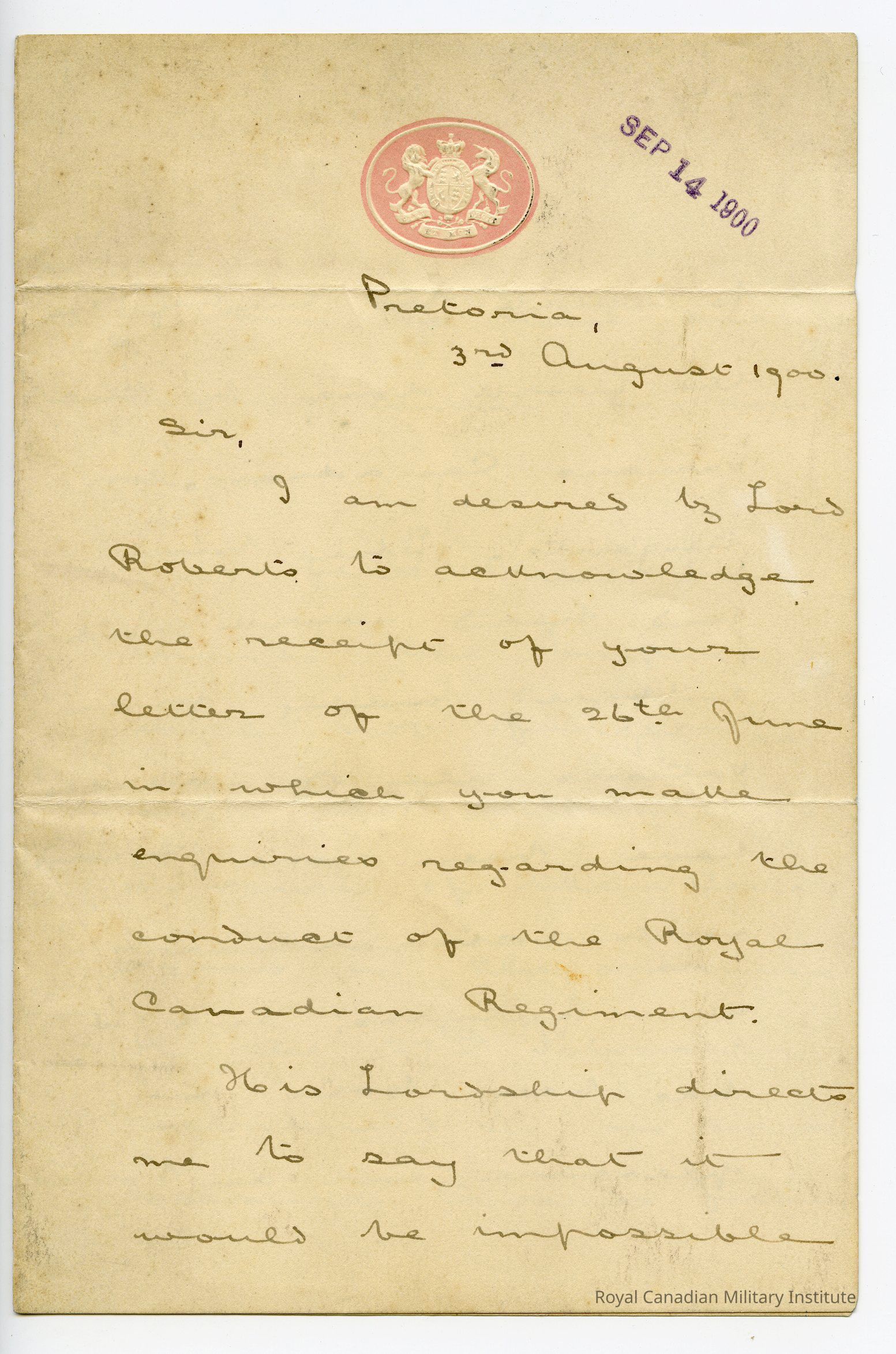 Letter "Lord Roberts on Canadian Contingent in South Africa, 14th September 1900."