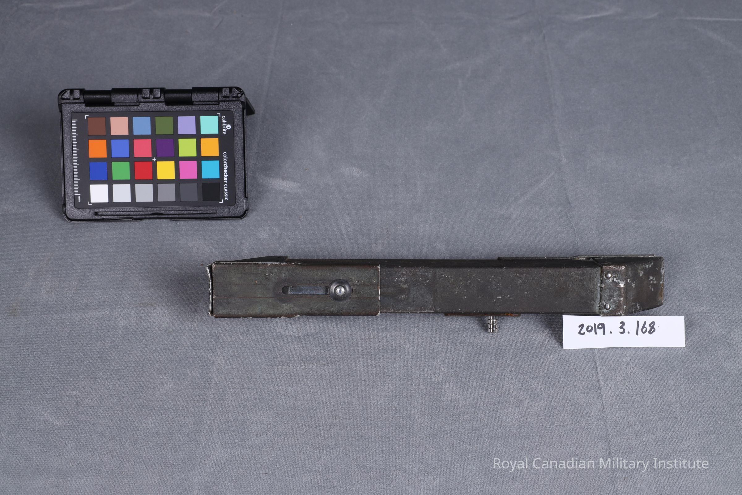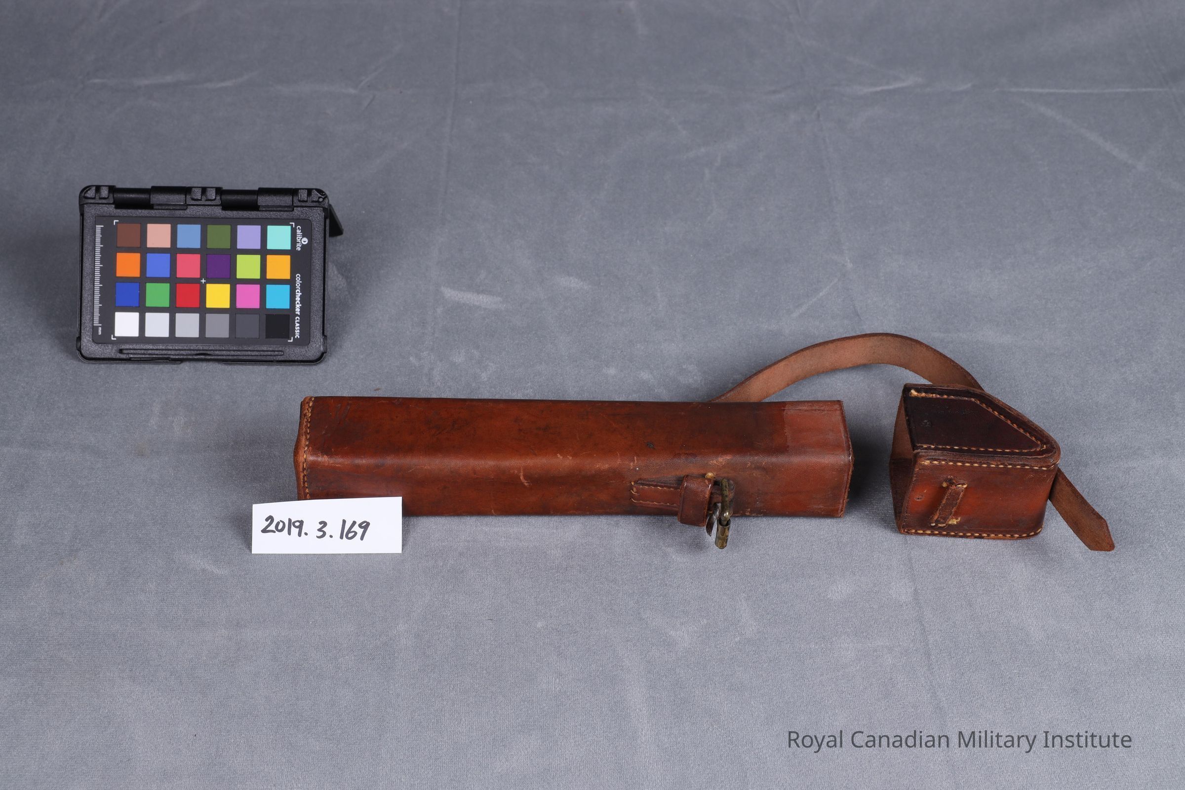 1916-1918 BEF/CEF trench periscope/case. A trench periscope with a leather case and strap. The trench periscope is black, appears to be made of wood construction, has two mirrors, one top, and one bottom, that can change the direction of the light. An image can often be seen without directly viewing it. The trench periscope could have an adjustable leg prop.Context