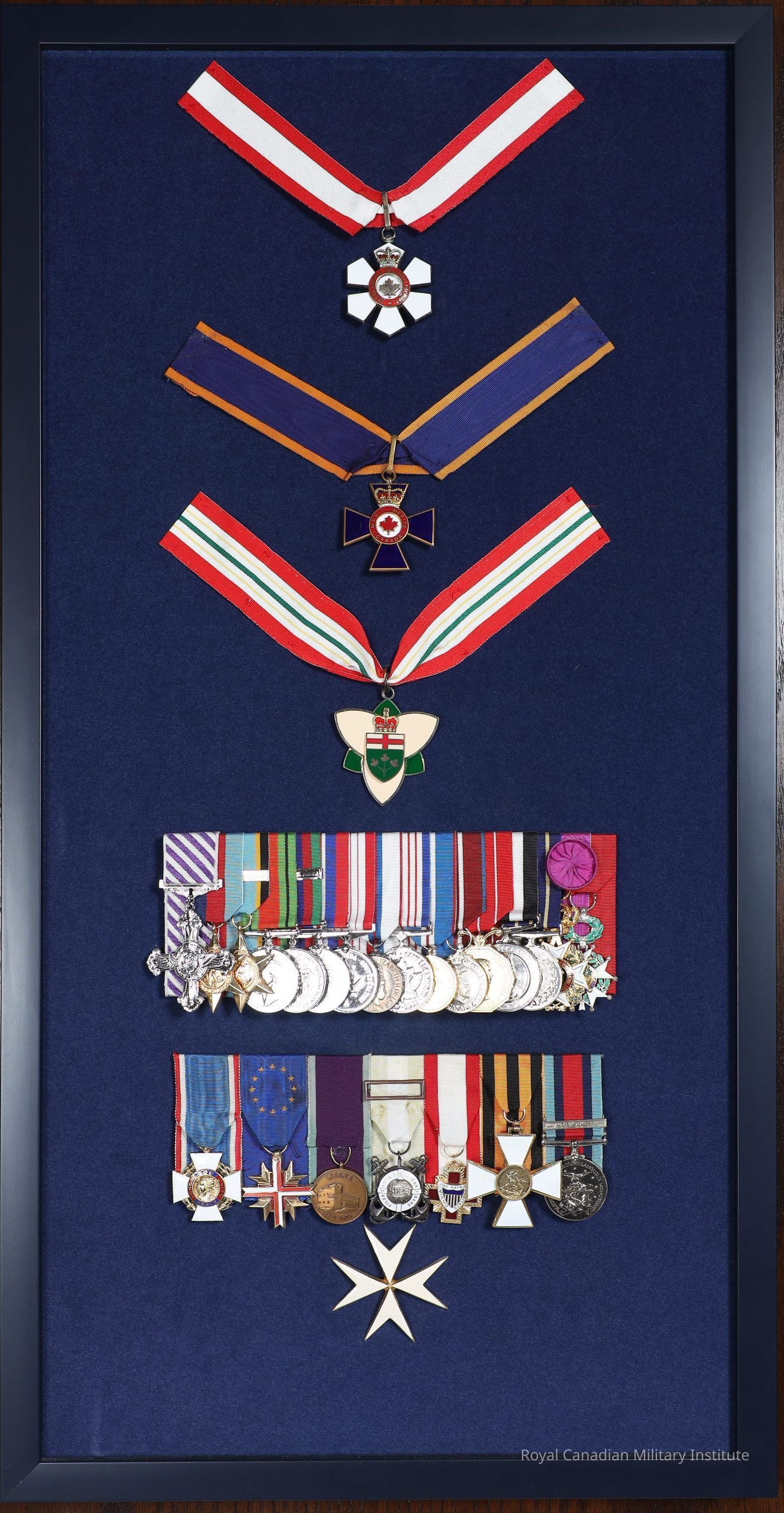 2012 Queen Elizabeth II 60th Jubilee Medal. Circular, silver coloured alloy (COPY). Obverse the crowned head of Queen Elizabeth II with title "ELIZABETH II DEI GRATIA REGINA CANADA" Reverse is central diamond-shaped field with Royal crown and cypher, diamond stippling outside this with maple leaves, dates "1952" and "2012", title "VIVAT REGINA" Suspender is fixed toe claw and ring. Ribbon is blue, red, blue, with two central white stripes, 3.2 x 8.5 cm.Made/Created