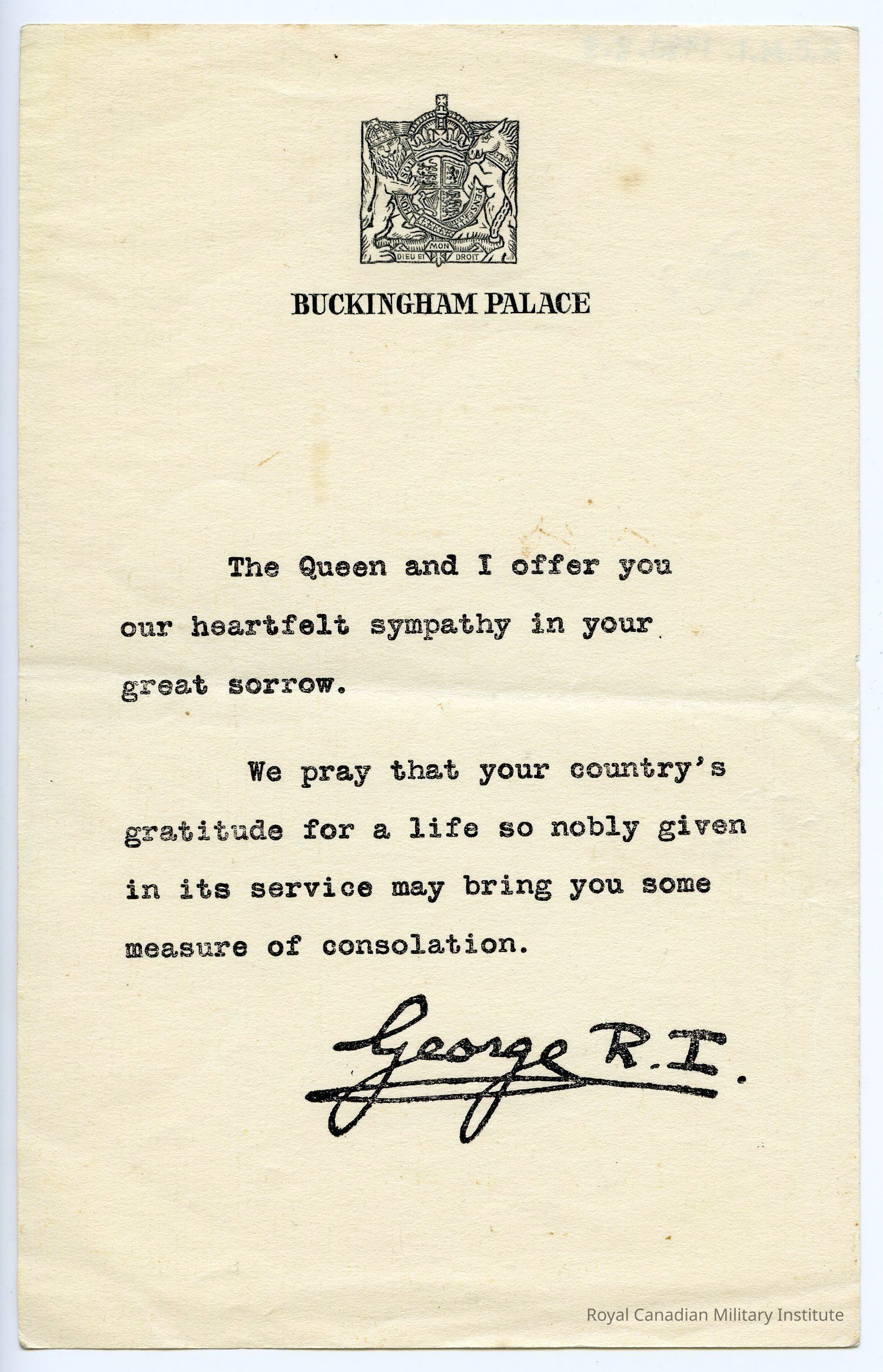 1944 King George VI letter to Deemer family.