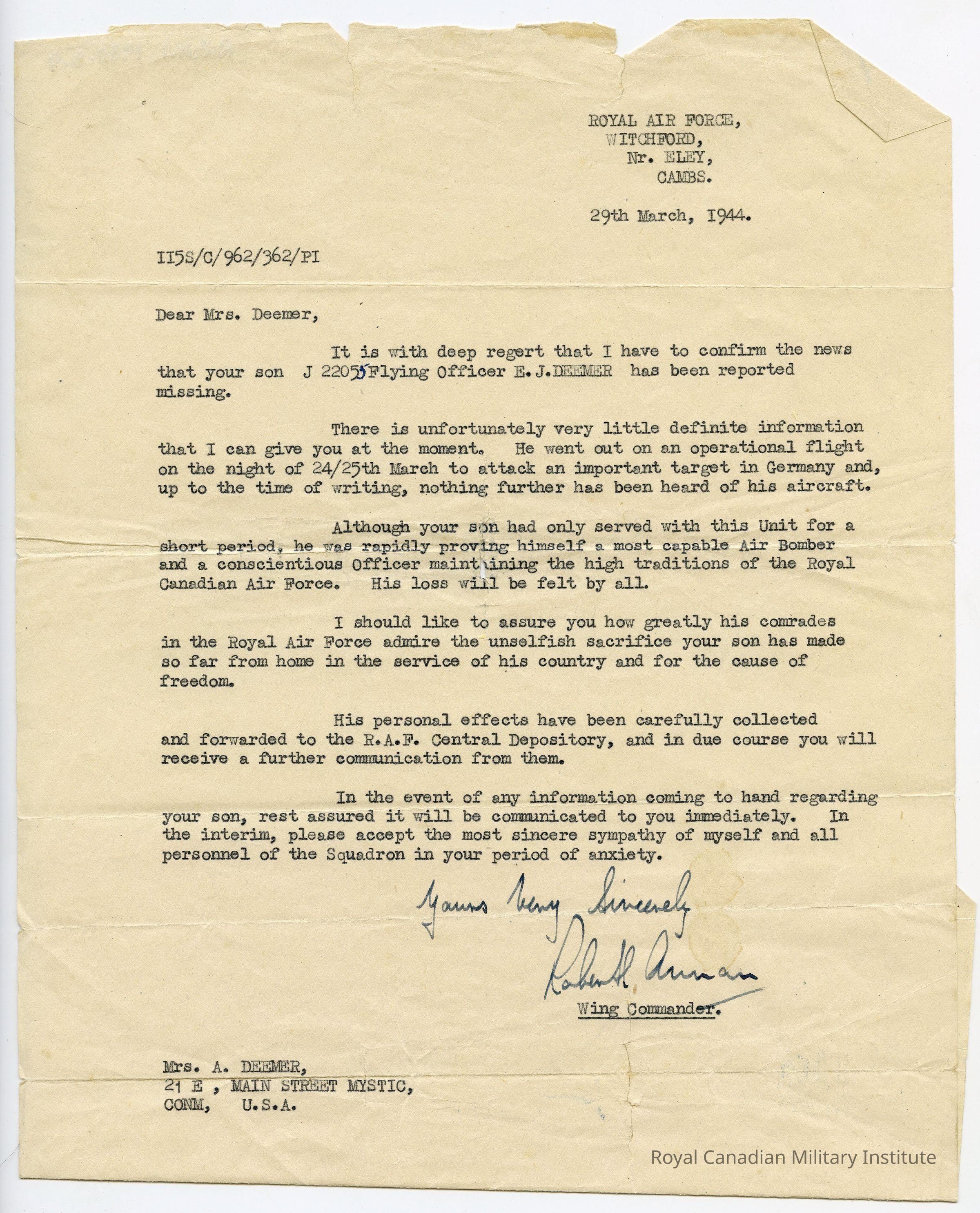 1944 Royal Canadian Air Force letter "Flying Officer Edward John Deemer Missing in Action 29 March 1944."