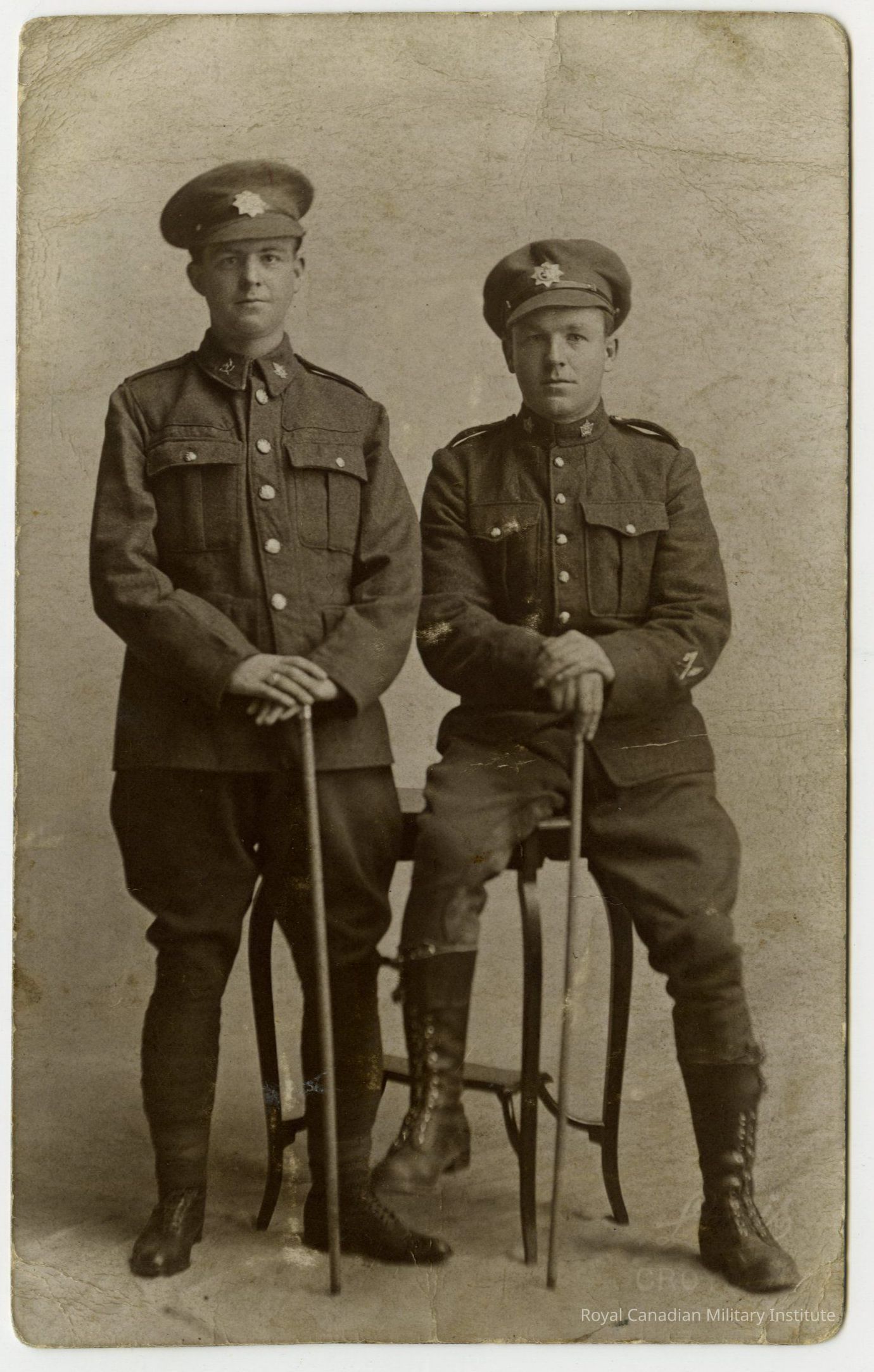 A Real Photo Postcard (RPPC) of two Royal Canadian Regiment soldiers after the battle of Vimy Ridge. Subjects are depicted in full military uniform, their hands clasped on top of their soldier's sticks. The soldier on the right is perched on a tall bench, his right leg dangling, while his left is on the ground. The soldier on the left is standing. Both are looking directly into camera. There is an illegible maker's mark in the bottom right corner.