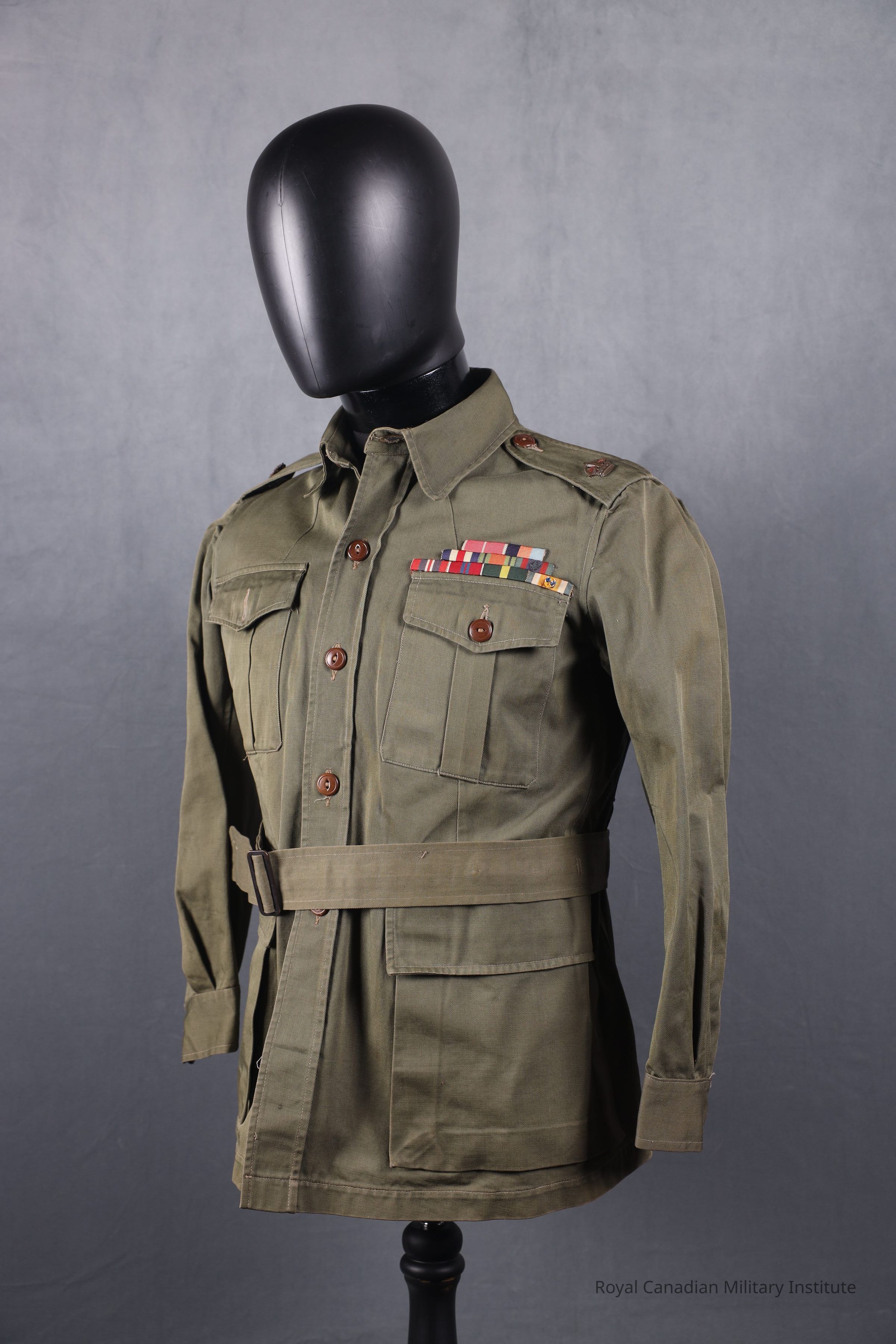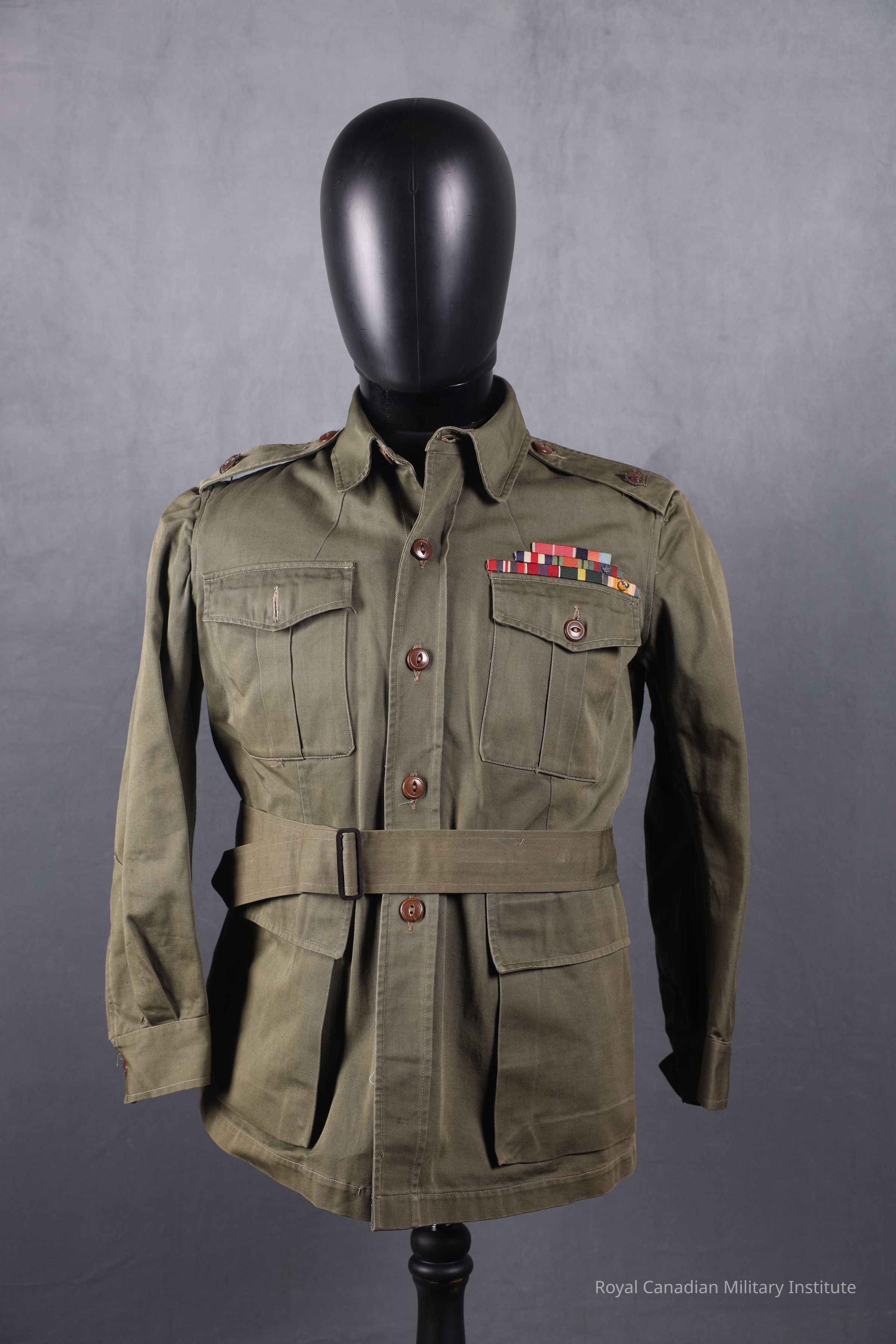 1950's-1970 Royal Canadian Army Service Corps Major's bush dress jacket made of khaki green cotton drill. The jacket is single breasted and closed with five brown plastic buttons (2 cm diameter). On each shoulder strap is a brown plastic button (2 cm diameter) and a bronze major's crown pin with red velvet (2.8 x 2.8 cm). The jacket has two pleated breast pockets closed with a buttoned (2 cm diameter) scalloped flap. On the hips are two patch pockets closes with flaps. Over the left breast pocket are nine ribbons denoting the following: Order of British Empire (military), 1939-45 Star, France and Germany Star, Defence Medal, Canada Volunteer Service Medal, War Medal 1939-45, Queen Elizabeth II Coronation 1963, Canadian efficiency decoration (ED), and Dutch Order of Nassau. Under each armpit is two ventilation eyelets (0.8 cm diameter) made of thread. The sleeve cuff has an adjustable closure and closes with a brown plastic button (2 cm diameter). There are two buttons on each sleeve cuff. On the side seam are two belt loops made of matching drill (6.5 x 1.5 cm).