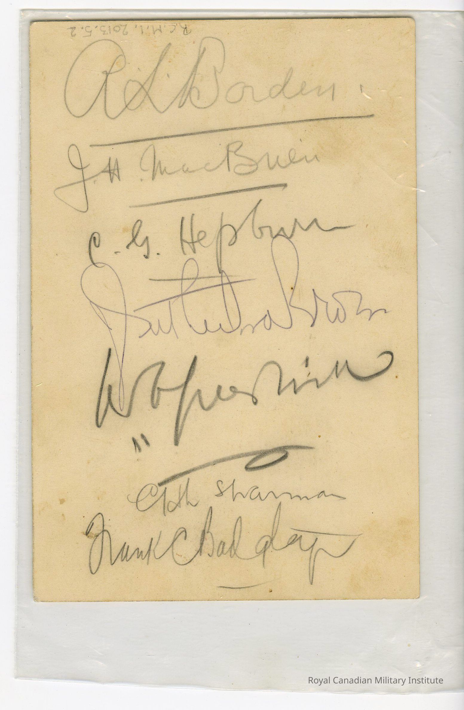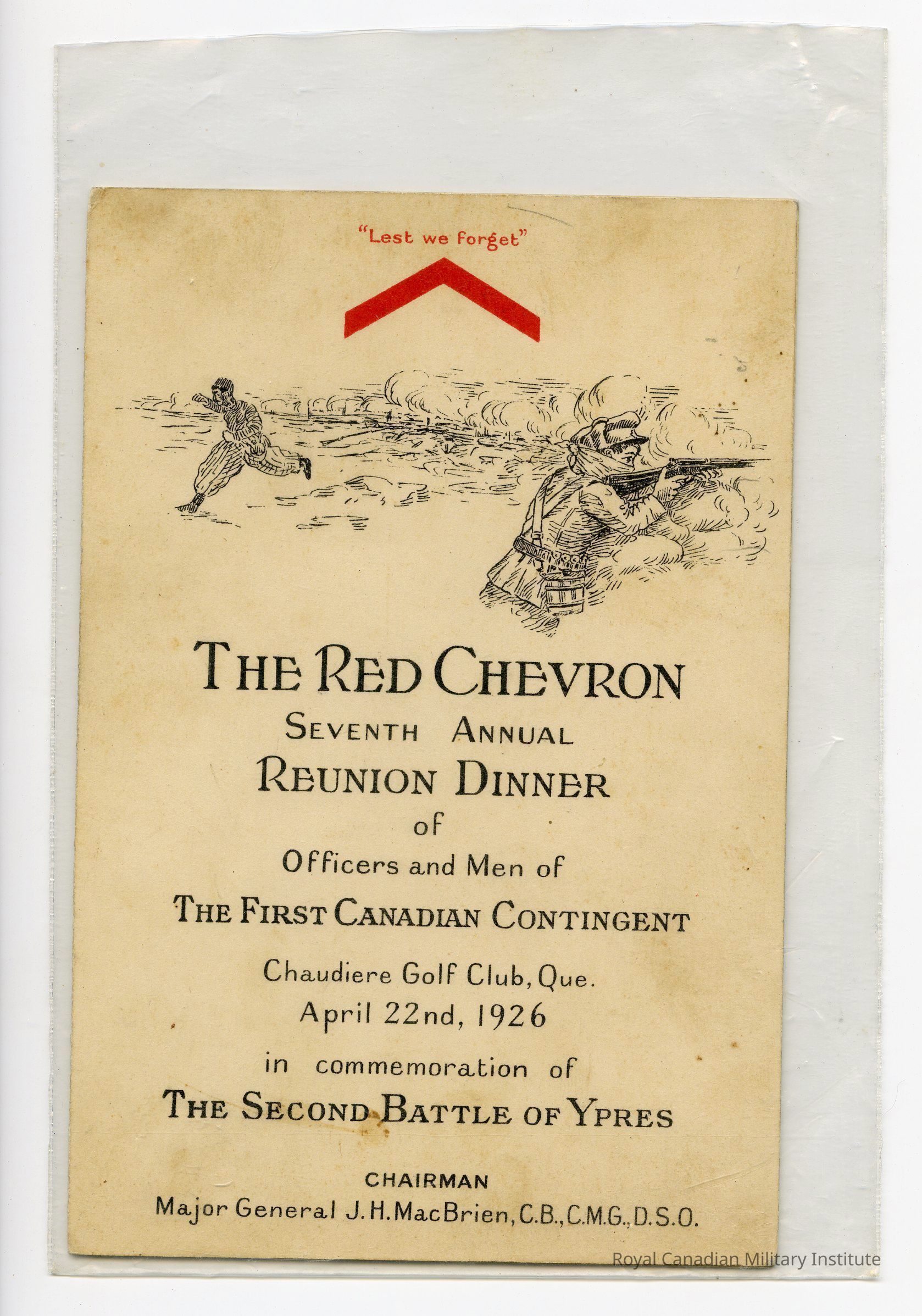 "The Red Chevron Seventh Annual Reunion Dinner of officers and men of The First Canadian Contingent, Chaudiere Golf Club, Que. April 22nd, 1926, in commemoration of The Second Battle of Ypres, Chairman Major General J.H. MacBrien, C.B.,C.M.G.,D.S.O."