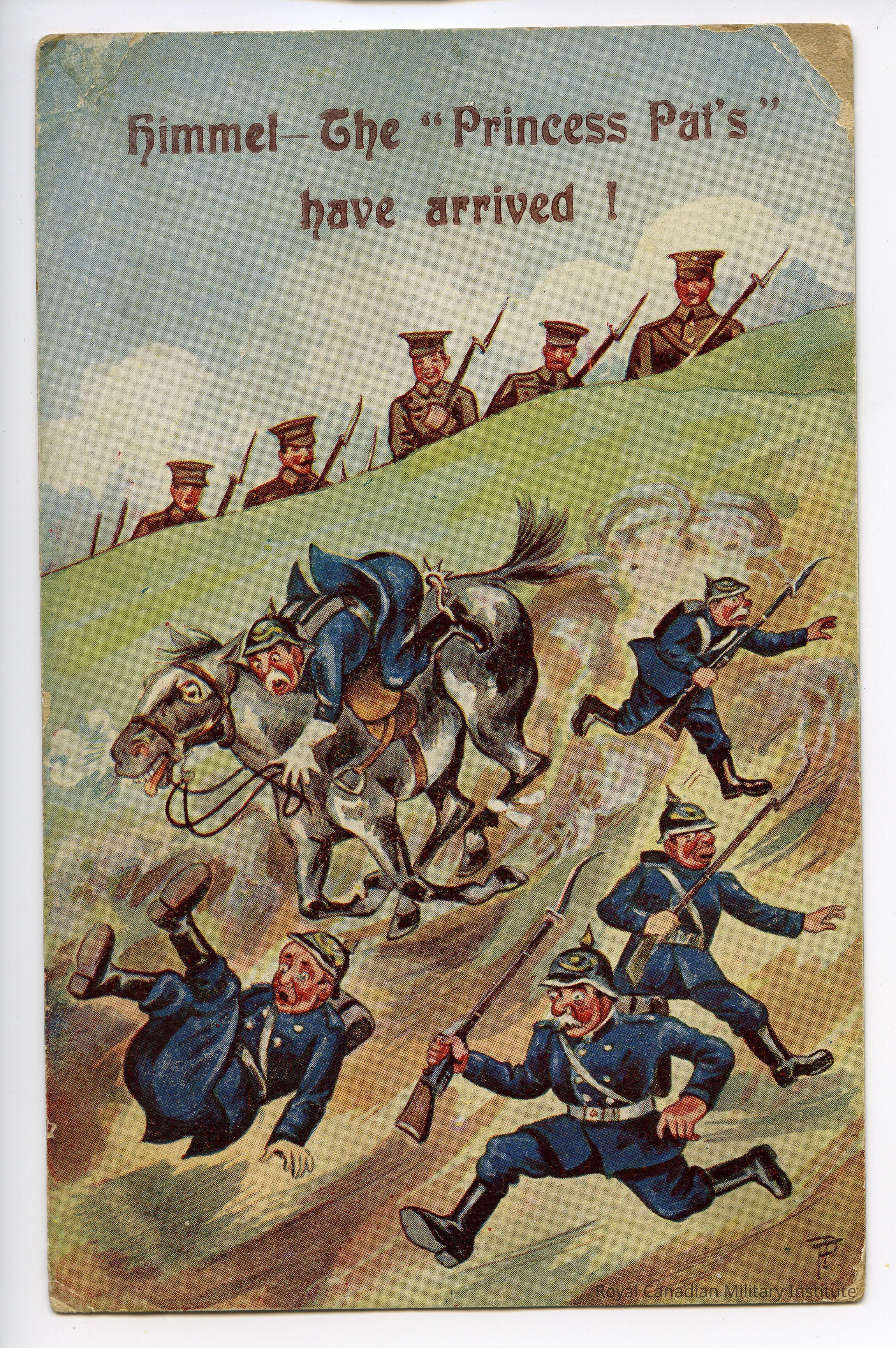 The postcard itself features 5 German soldiers on the run from 5 cheery looking Canadian (?) troops. The text reads "himmel - The "Princess Pat's" have arrived!". It was published by Solomon Brothers, Ltd. on New North Road, London. The series number is given as 1010. There is no stamp or postage on the postcard.