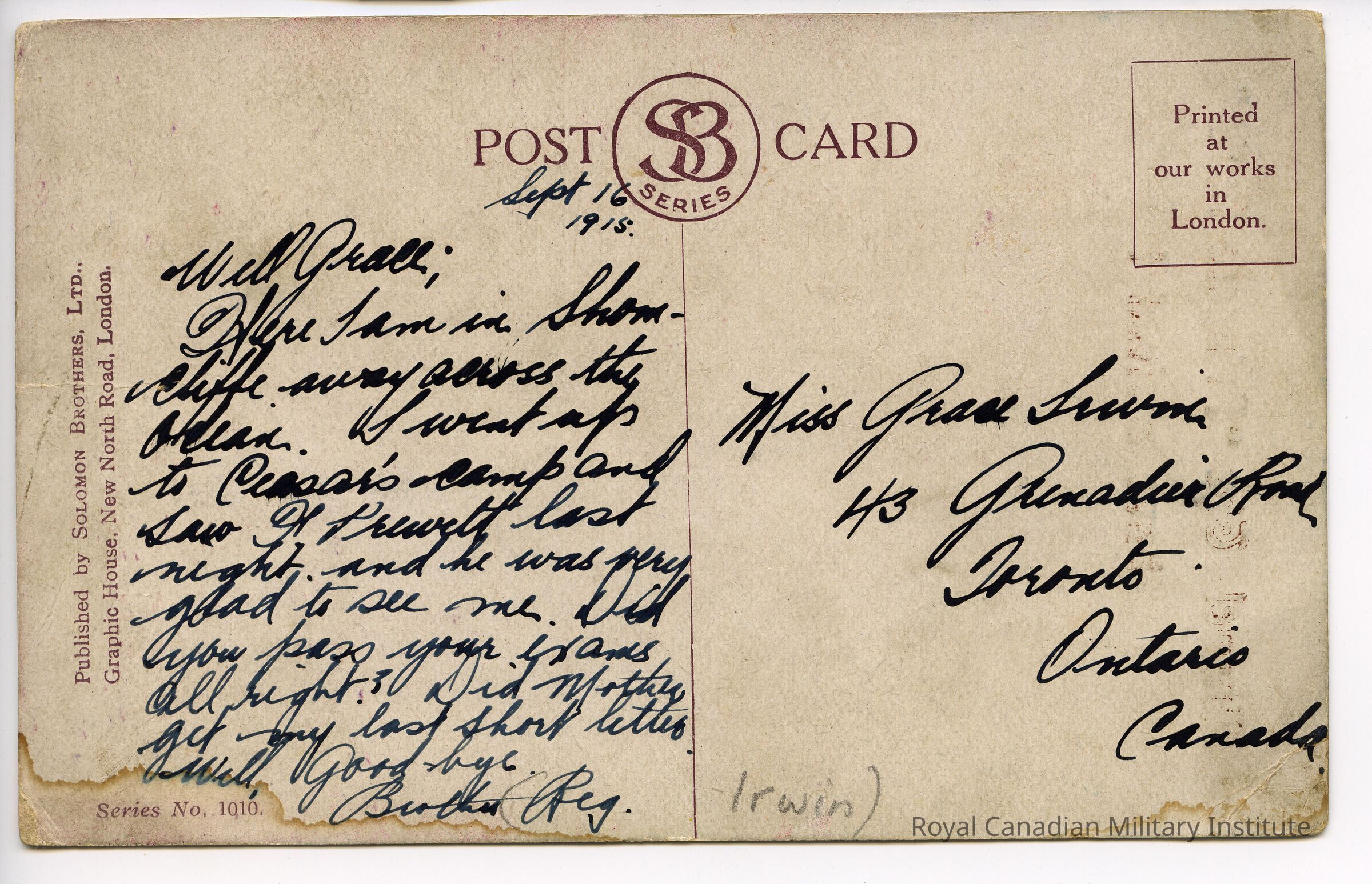 The postcard, dated September 16, 1915, reads "Well Grace; Here I am in Shorncliffe away across the ocean. I went up to Caesar's camp and saw F Prewelt (sp?) last night and he was very glad to see me. Di you pass your exams all right? Did Mother get my last short letter. Well, Good bye. Brother Reg". Next to Reg is "Irwin" written in pencil. The postcard is adressed to Miss Grace Irwin, 43 Grenadier (?) Road, Toronto Ontario Canada.