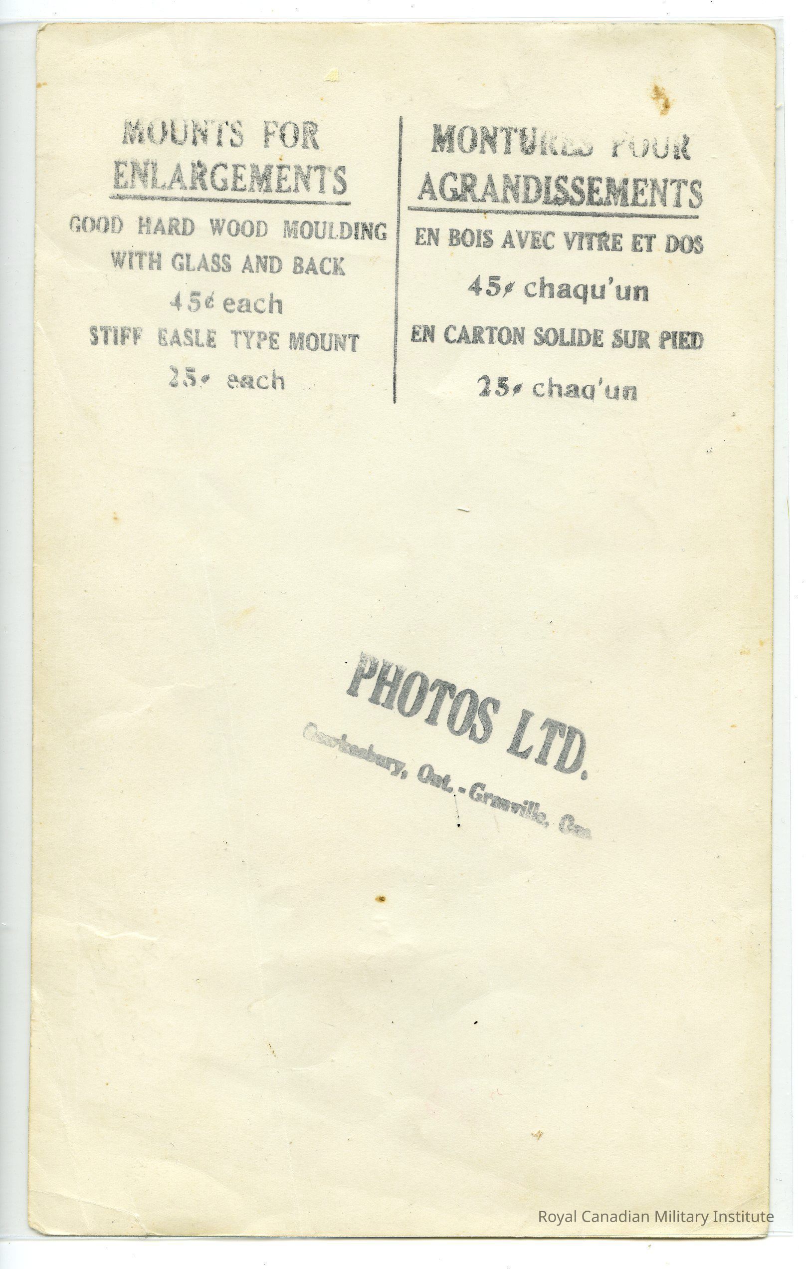 This photograph is of R.C.A.F. Air Gunner, Sergeant G.L. Renaud. The photo shows Seargent Renaud standing in winter clothing in front of a board walkway. The background is indistinct, but shows a line of windows and what appears to be a snow bank. On the back of the card is stamped, in English and French "MOUNTS FOR ENLARGEMENTS / GOOD HARD WOOD MOULDING / WITH GLASS AND BACK / 45 cents EACH / STFFED EASLE THPICAL MOJUNT / 25 CENTS." Below this is stamped "PHOTO LTD. Queensbury, Ont. - Granville Ont."Made/Created