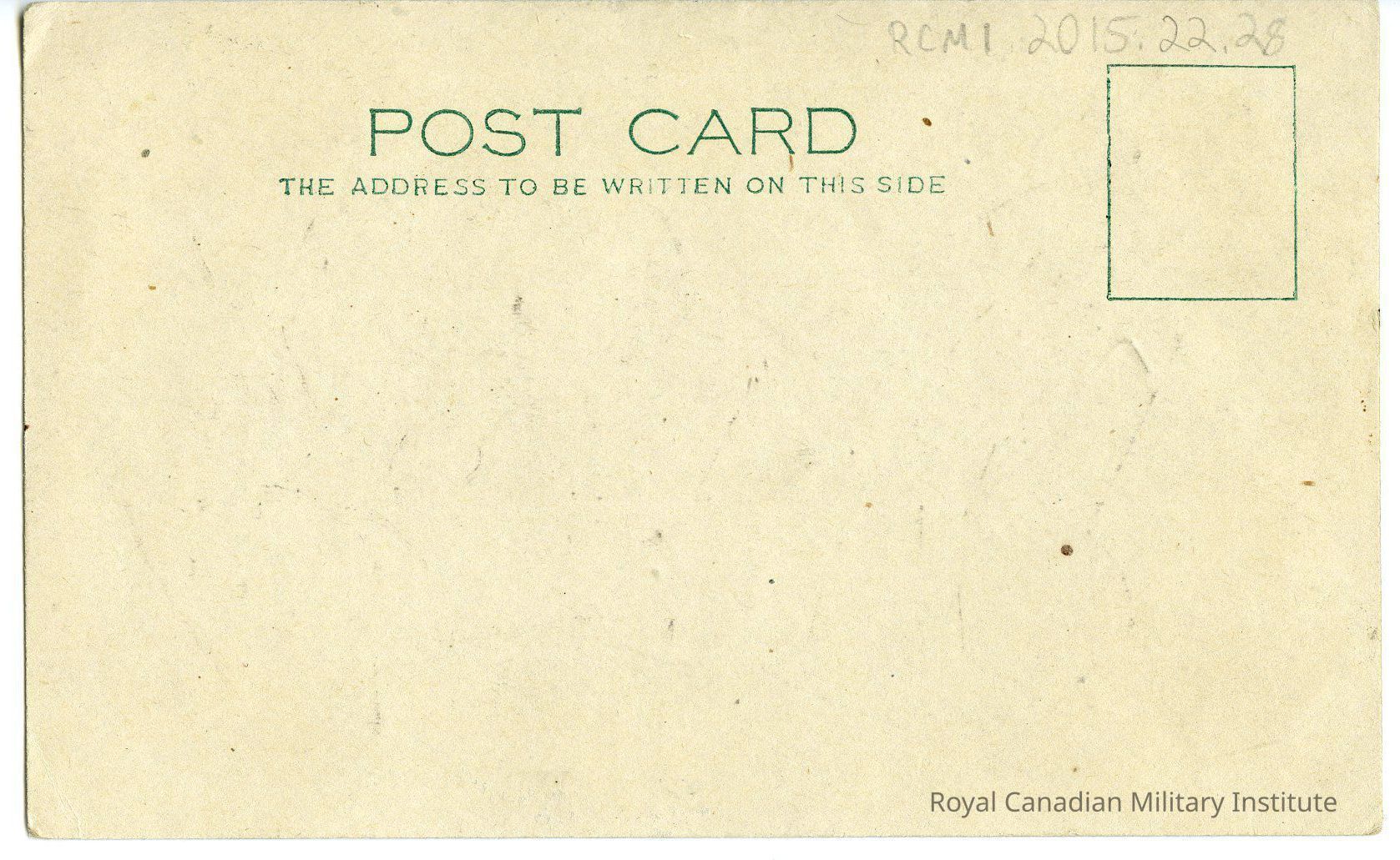 The object is a postcard Silhouette George Weber which dates from 1943-1944. On the front of the postcard is the silhouette of the officer printed horizontally. On the rear of the postcard, printed at the top of the page in blue ink is the following: "POST CARD / THE ADDRESS TO BE WRITTEN ON THIS SIDE." To the right of this title is the outline of a small blue rectangle which is meant to be the location to affix the stamp.