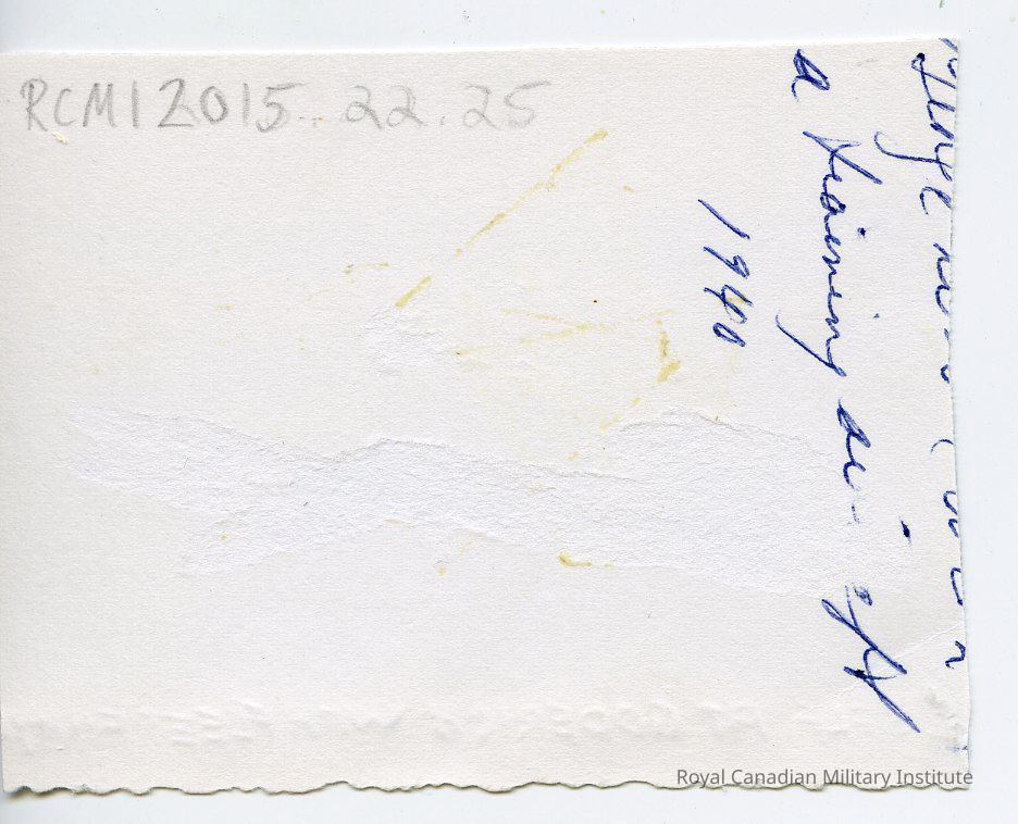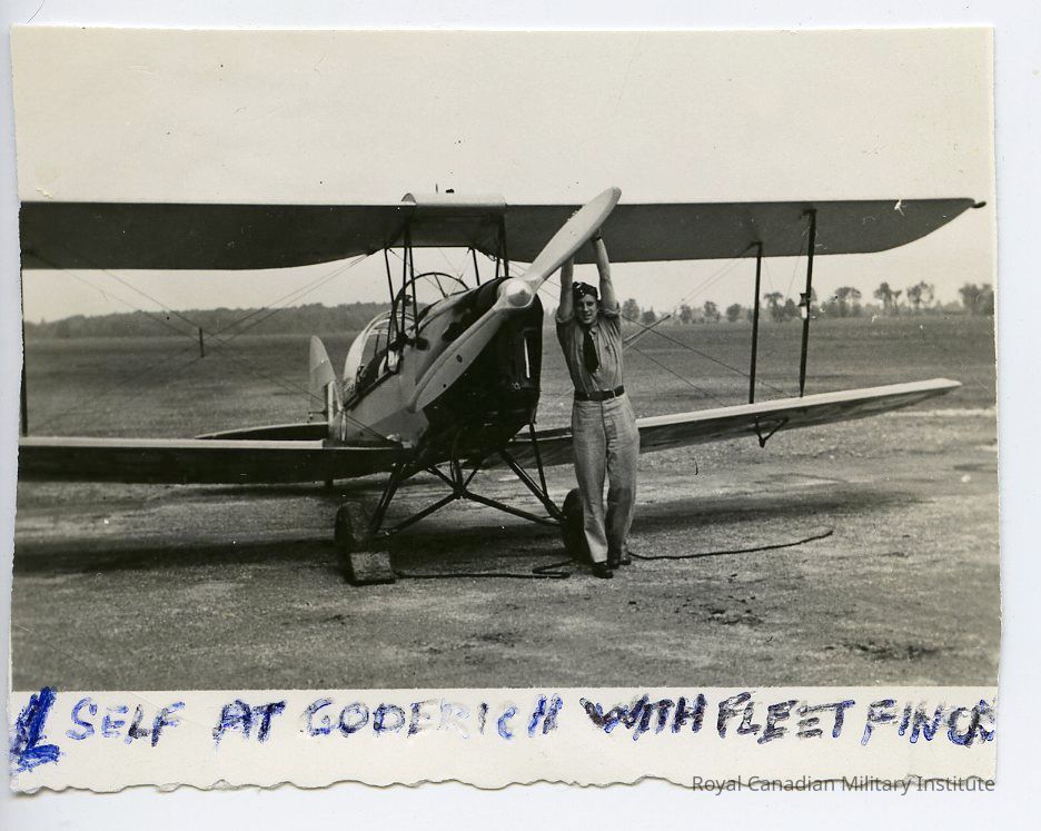 The object is a photograph of Aircraftsman George Weber at Goderich, Ontario, 1940. The photo shows a man standing with both of his arms streched above his head, touching the propeller of a biplane. The biplane is shown behind him. He and the plane are standing upon a large plain and in the distance on the right hand side of the photo are a line of trees. The photo is captioned in blue ink handwriting "1 SELF AT GODERICH WITH FLEET FINC(?)H." On the back there is three lines of handwriting. The first is illegible due to being partially cut off and the second is illegible partially due to a section of paper loss. On the third the year "1940" may be read.Made/Created