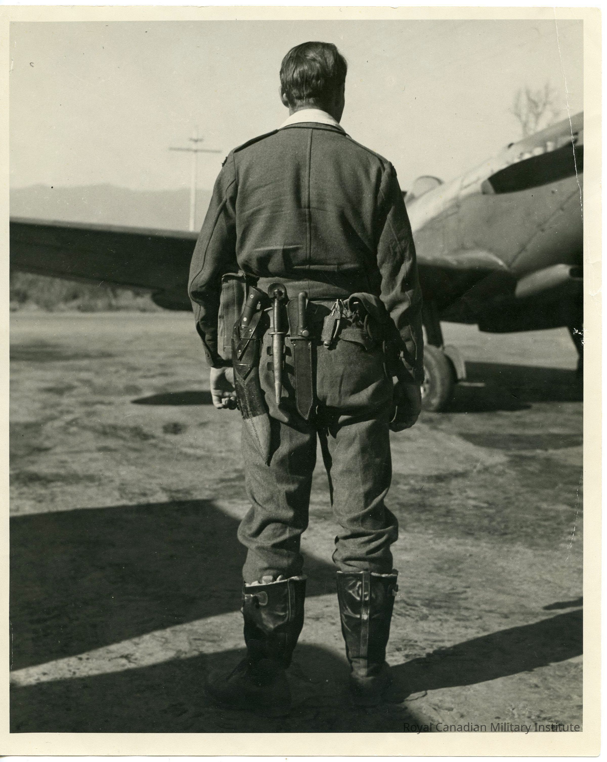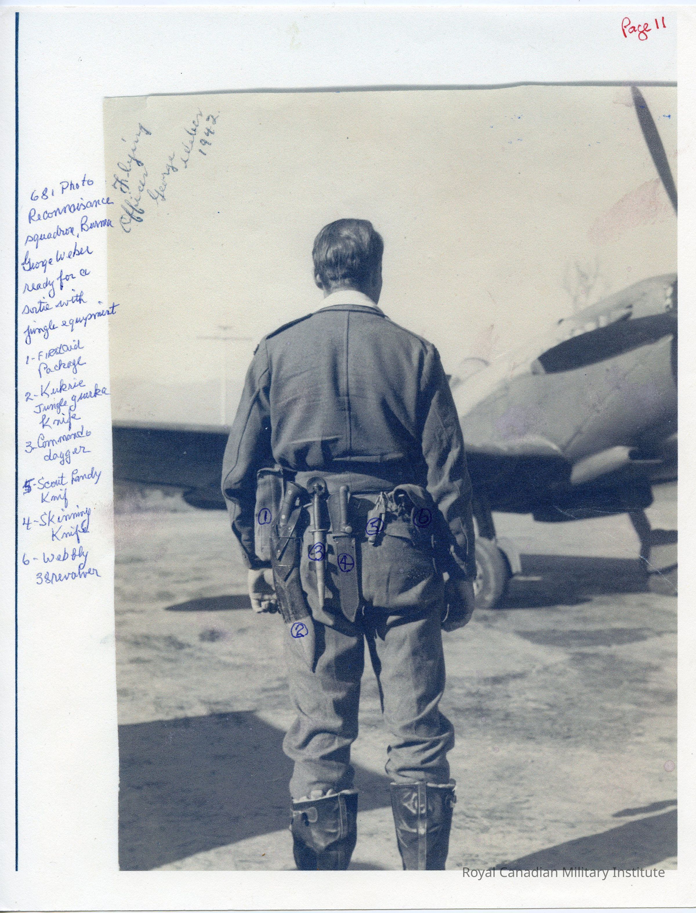 The object is a photograph of Flying Officer George Weber 681 Photo Reconnaissance Squadron, Burma in 1942. The photograph shows the rear of George Weber in front of a parked plane. In the distance there looks to be a power line tower. On the back of the photograph, the following phrase is written "PL41194." On an accompanying photocopy of the original photograph it is written in the upper left hand corner "Flying / Officer / George / Weber / 1942." Handwritten to the left the following is written in a colomn with accompanying numbers written on corresponding parts of his clothing. "681 Photo / Reconnaisance / squadron, Burma / George Weber / ready for a / sortie with / jungle equiptment / 1 - FIRST AID / Package / 2 - Kukrie / Jungle gurka / Knife / 3 - Commando / dagger / 5 - Scout handy / Knif / 4- Skinning / Knife / 6 - Webby / 38 revolver."Made/Created