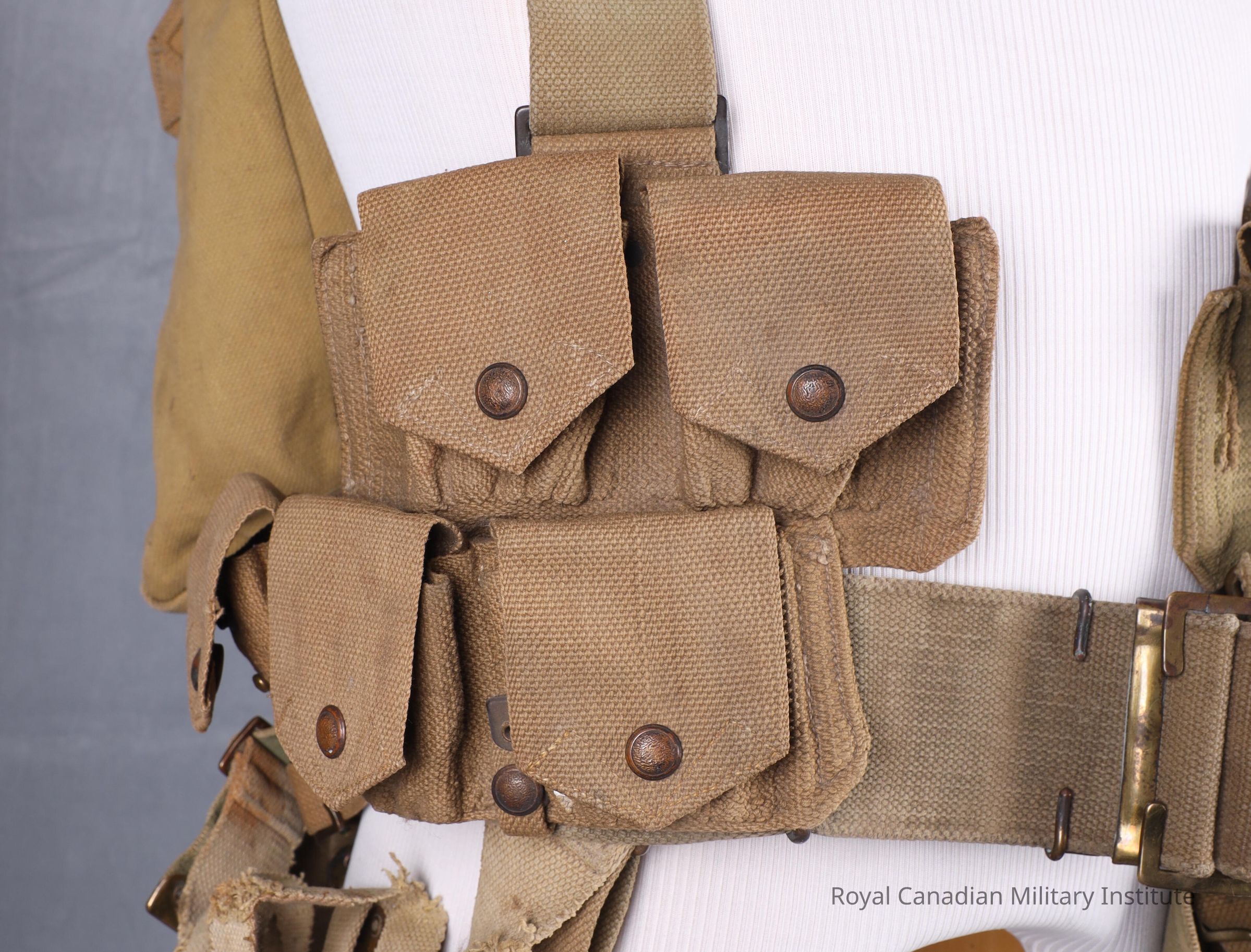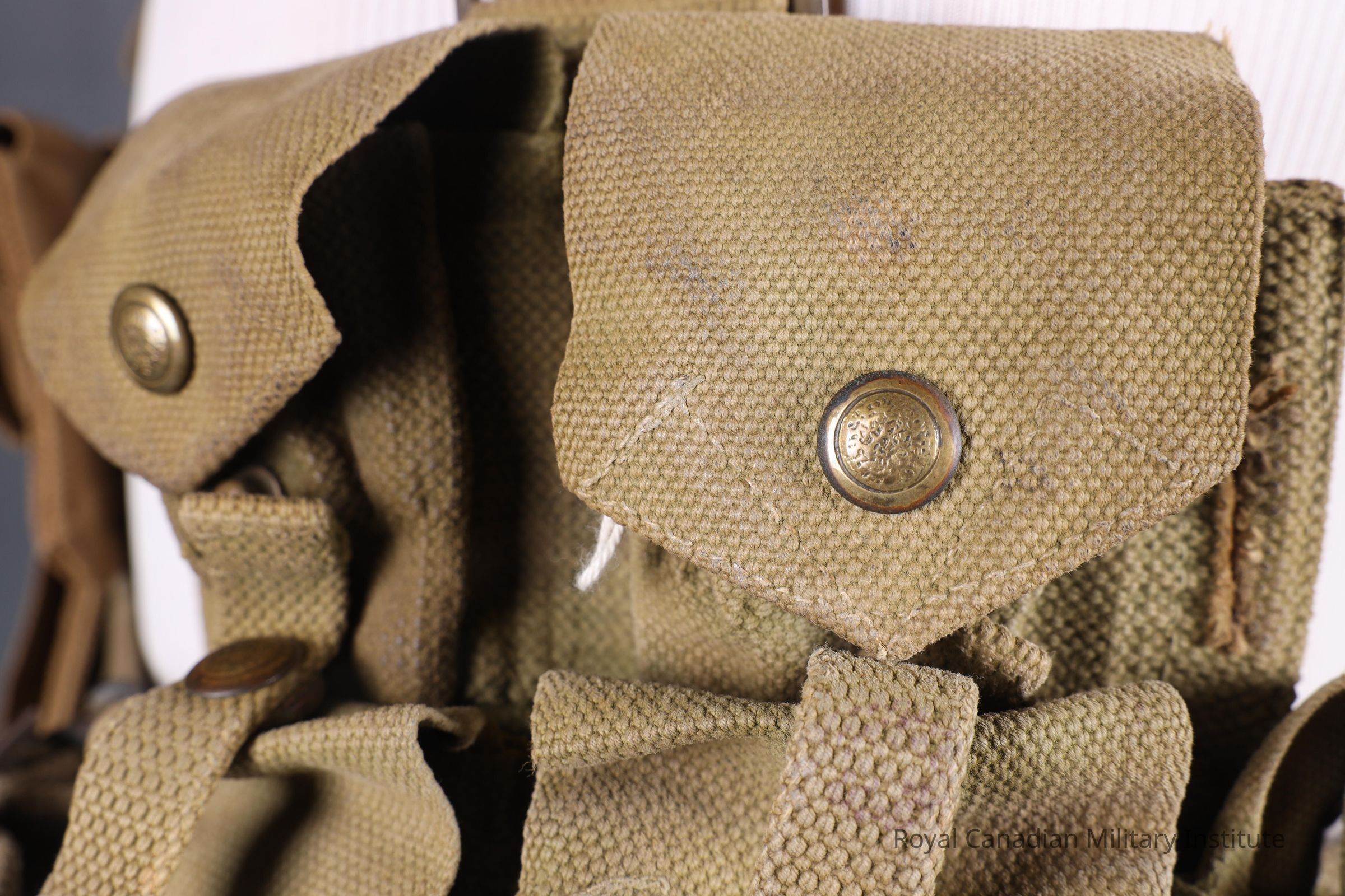 1918-1939 British Army P-08 Web Equipment ammunition pouch, RIGHT. Green khaki cotton webbing. Two-tiered pouch belt with two higher and three lower pouches. Each pouch has three compartments separated by a single thickness of woven material. Pointed flaps with copper plated brass snaps. Two heights of snap posts on each pouch. Buckles for attachment to other webbing components.Made/Created