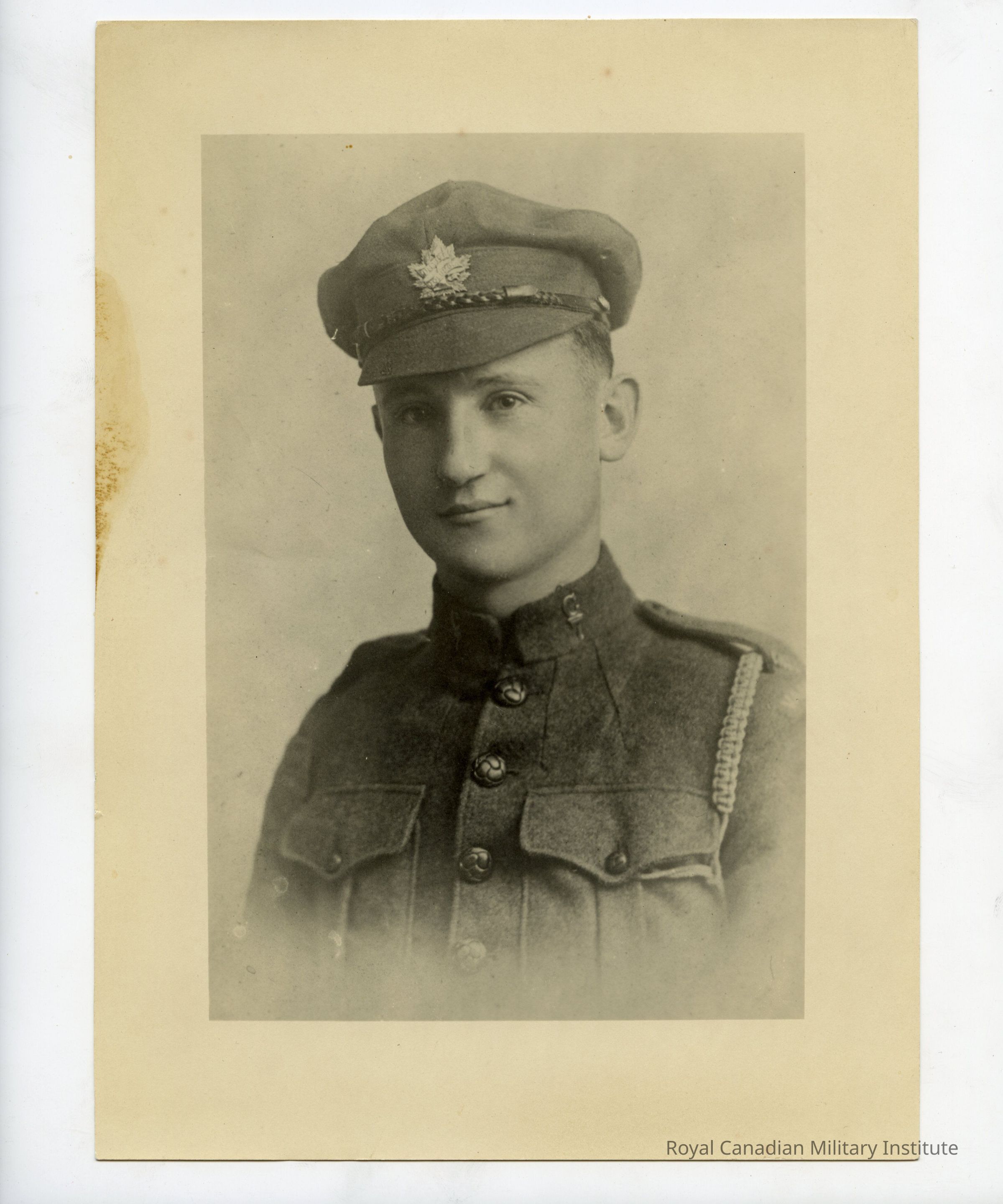 A larger unidentified studio portrait of a 7th Battalion soldier. Subject is photographed from the chest up, with a slight gradient near the bottom of the photo. He is wearing his full military uniform, including the cap. With a slight smile, he looks directly into the camera. This soldier wears C/7 collars and leather "football" buttons. There is a slight stain on the left side of the border of the portrait.