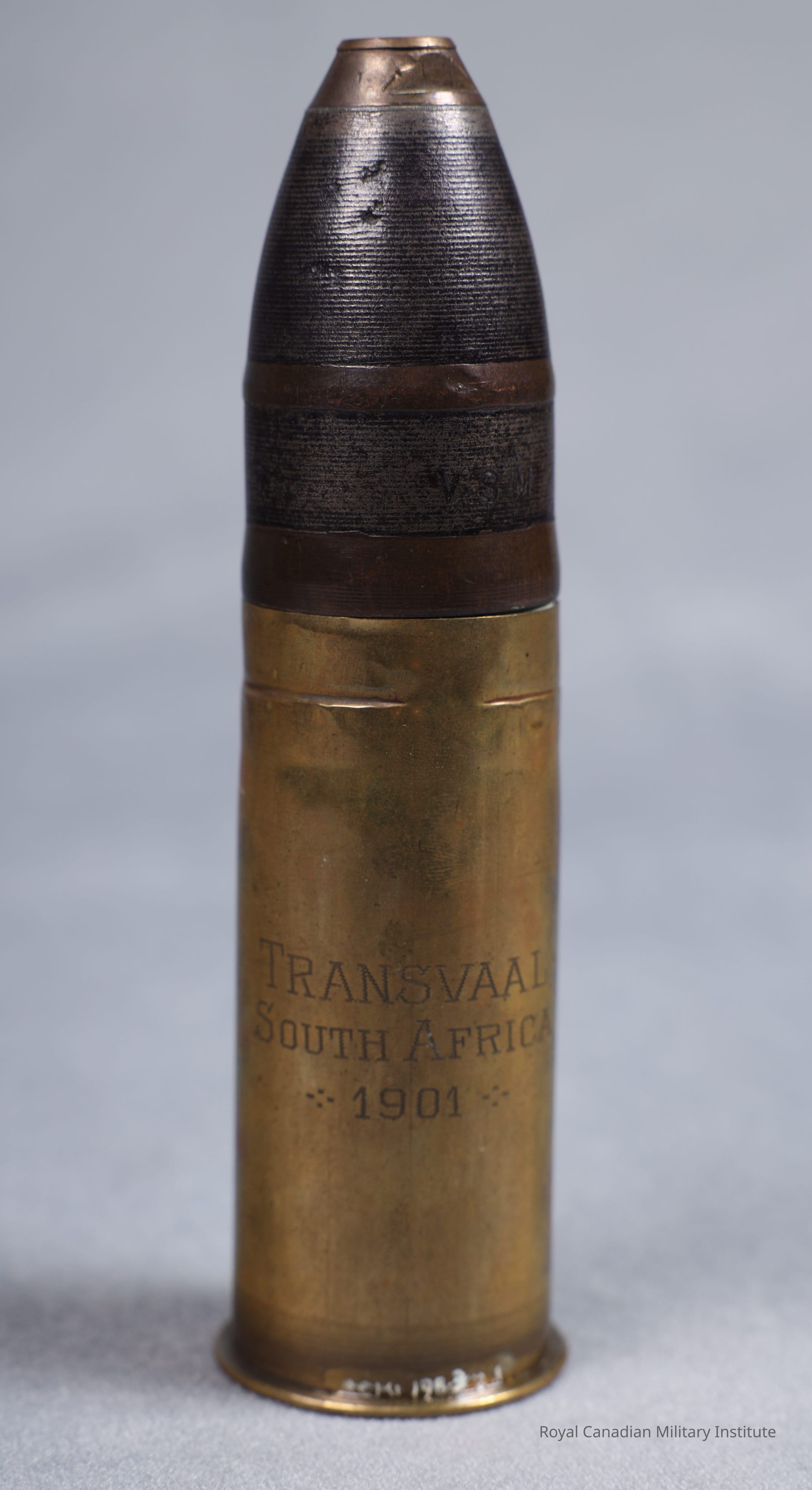 Accession number on casing rim. Stamped into loading plug: "V.S.M." Etched into projectile: "Transvaal. South Africa. 1901."Dimensions