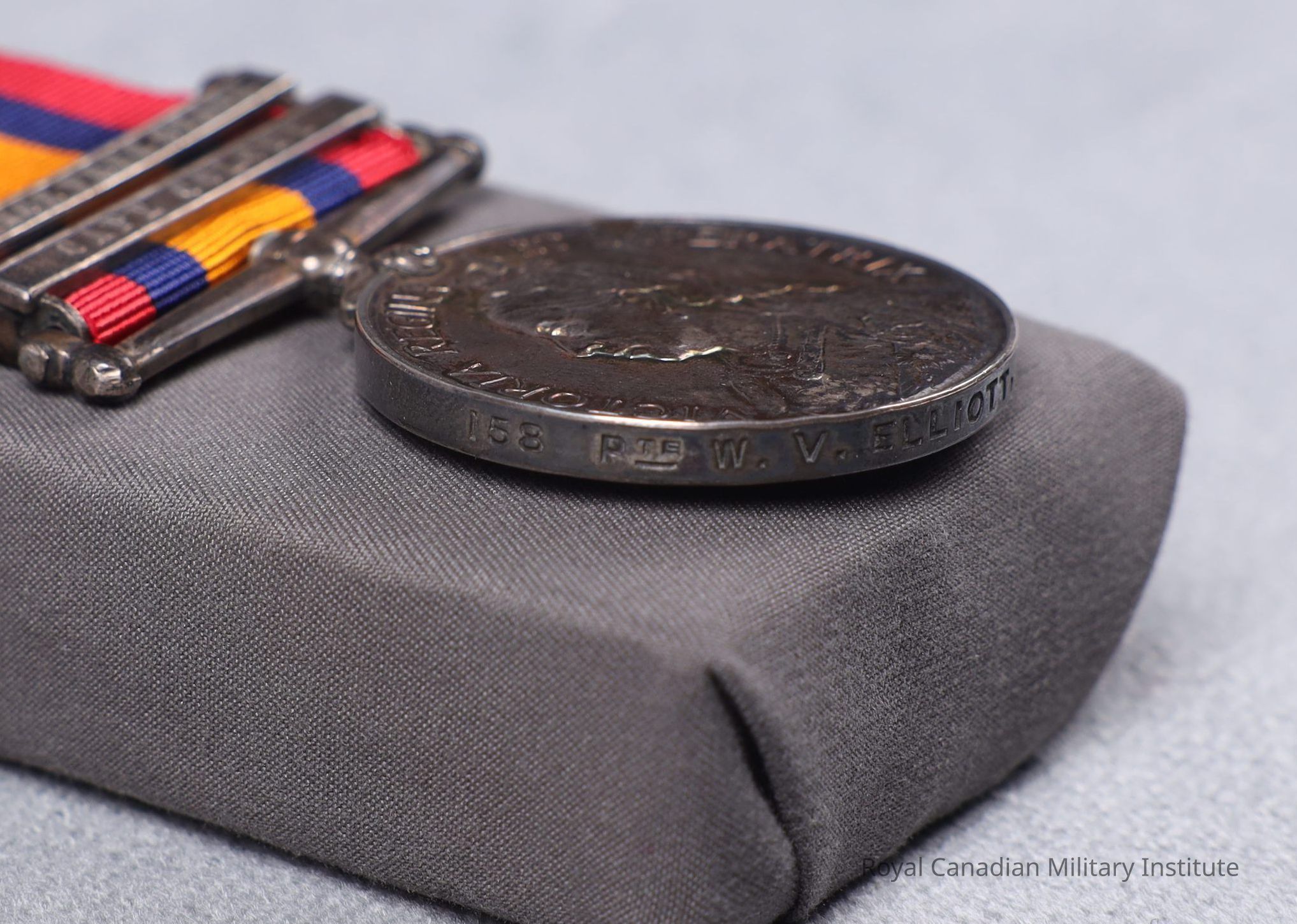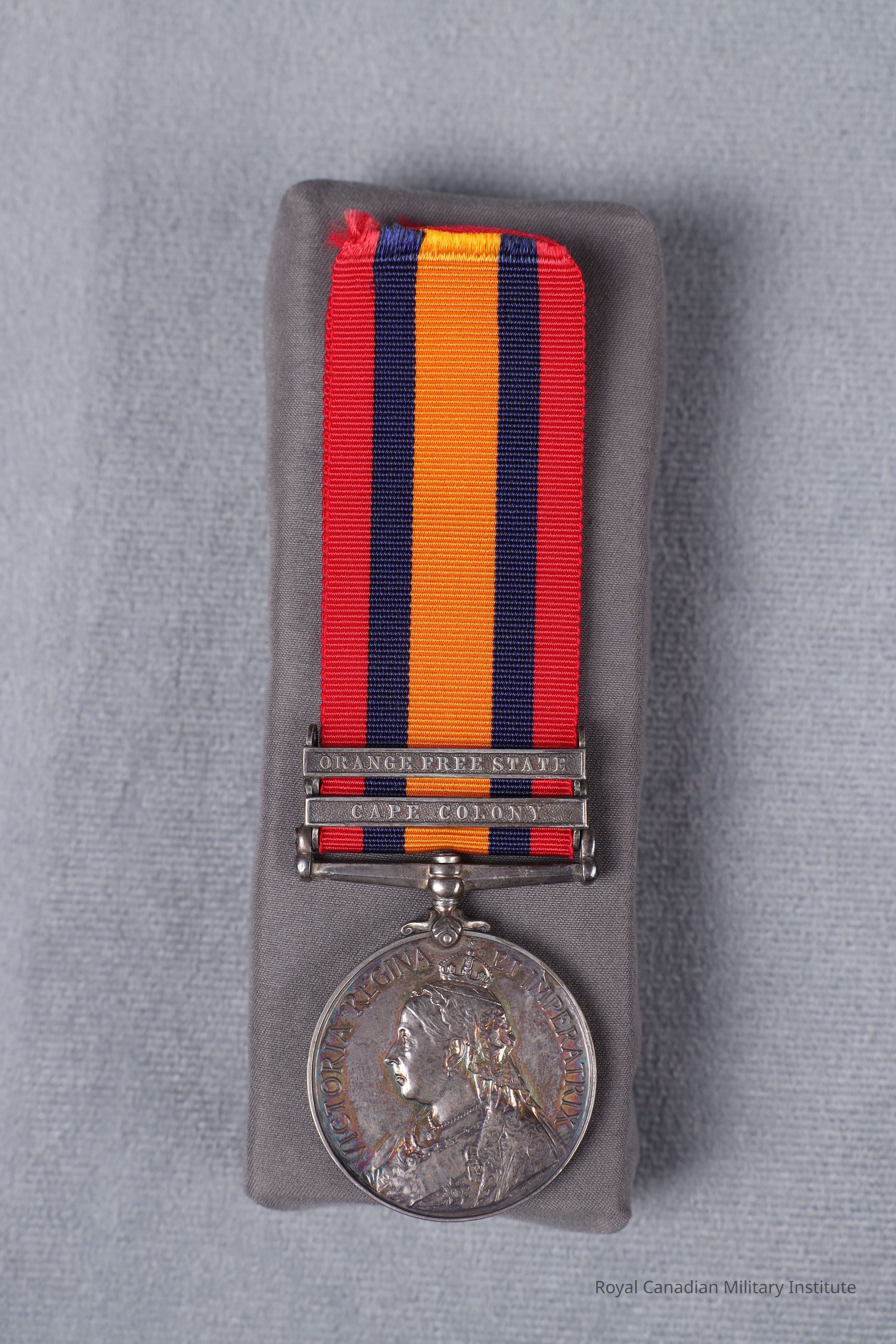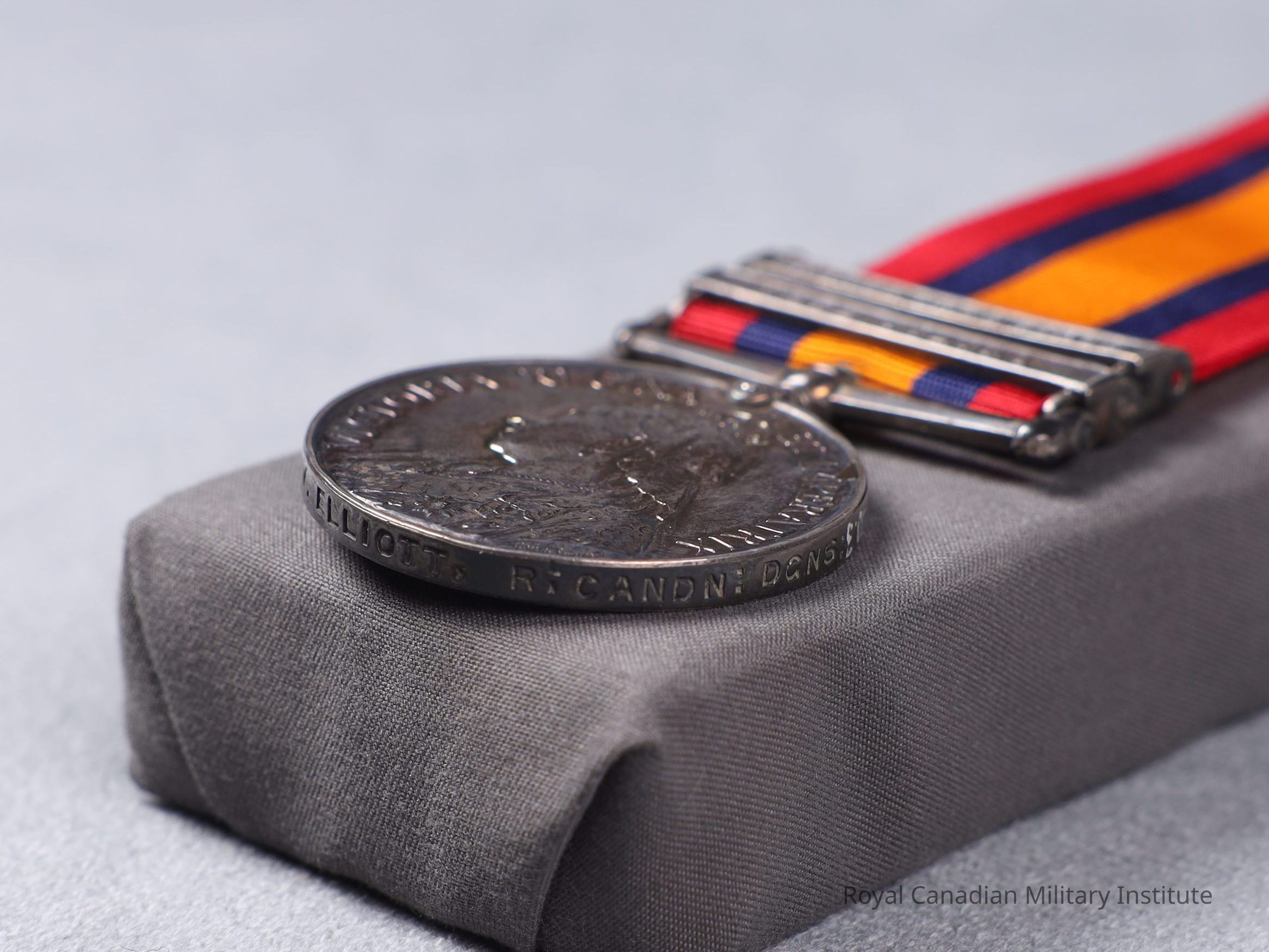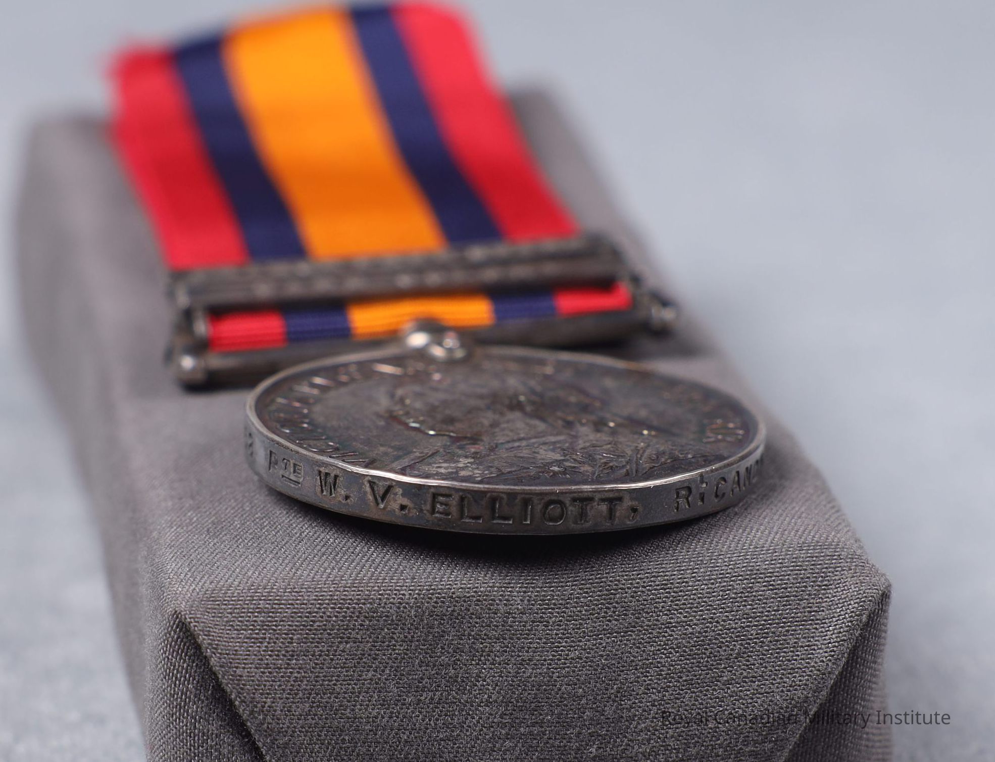 1899-1900 Queen's South Africa Medal, bars "Cape Colony", "Orange Free State", to 158 Private W.V. Elliott, Royal Canadian Dragoons. Circular, silver. Obverse crowned bust Queen Victoria facing left, circled title "Victoria Regina Et Imperatrix." Reverse a helmeted Britannia