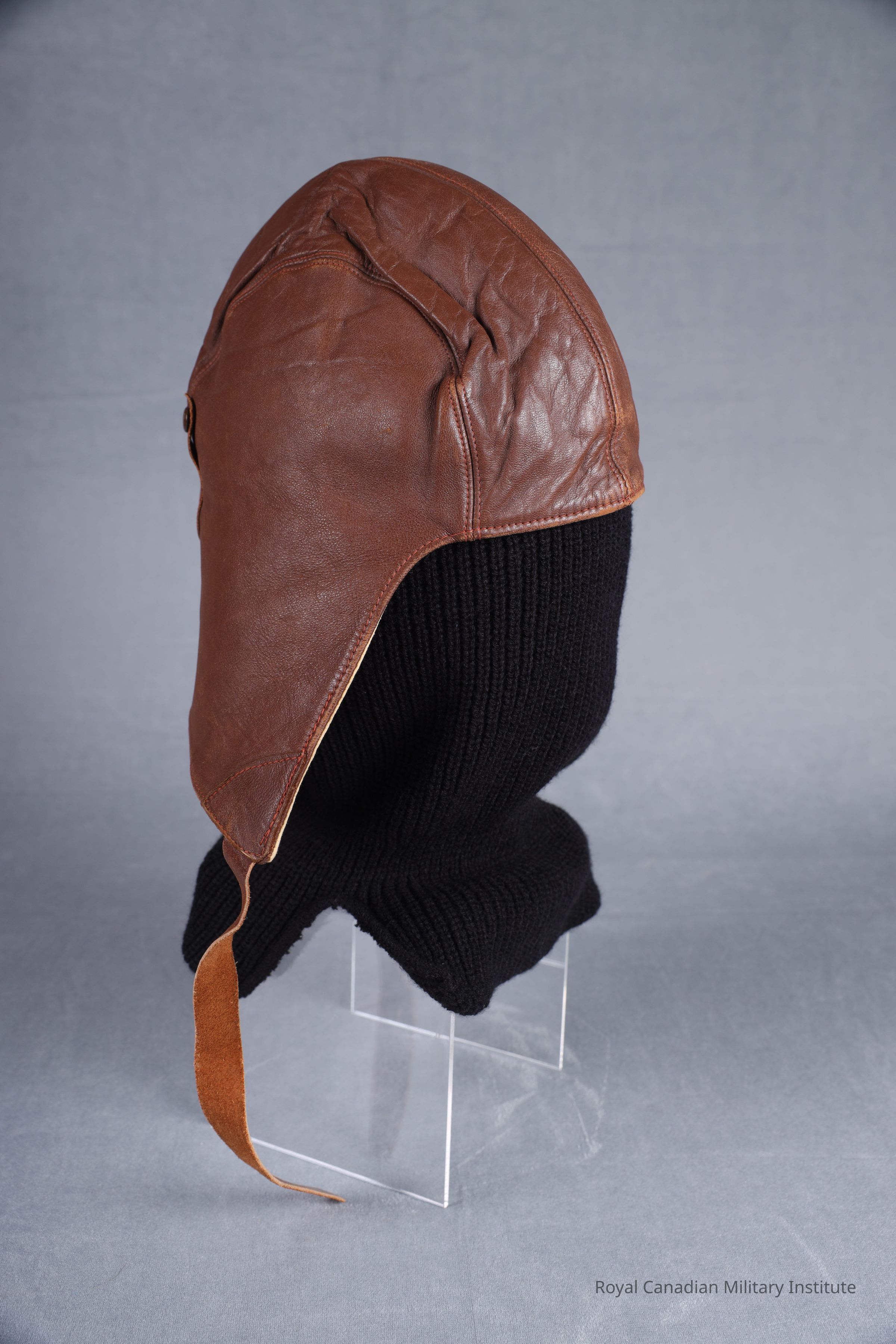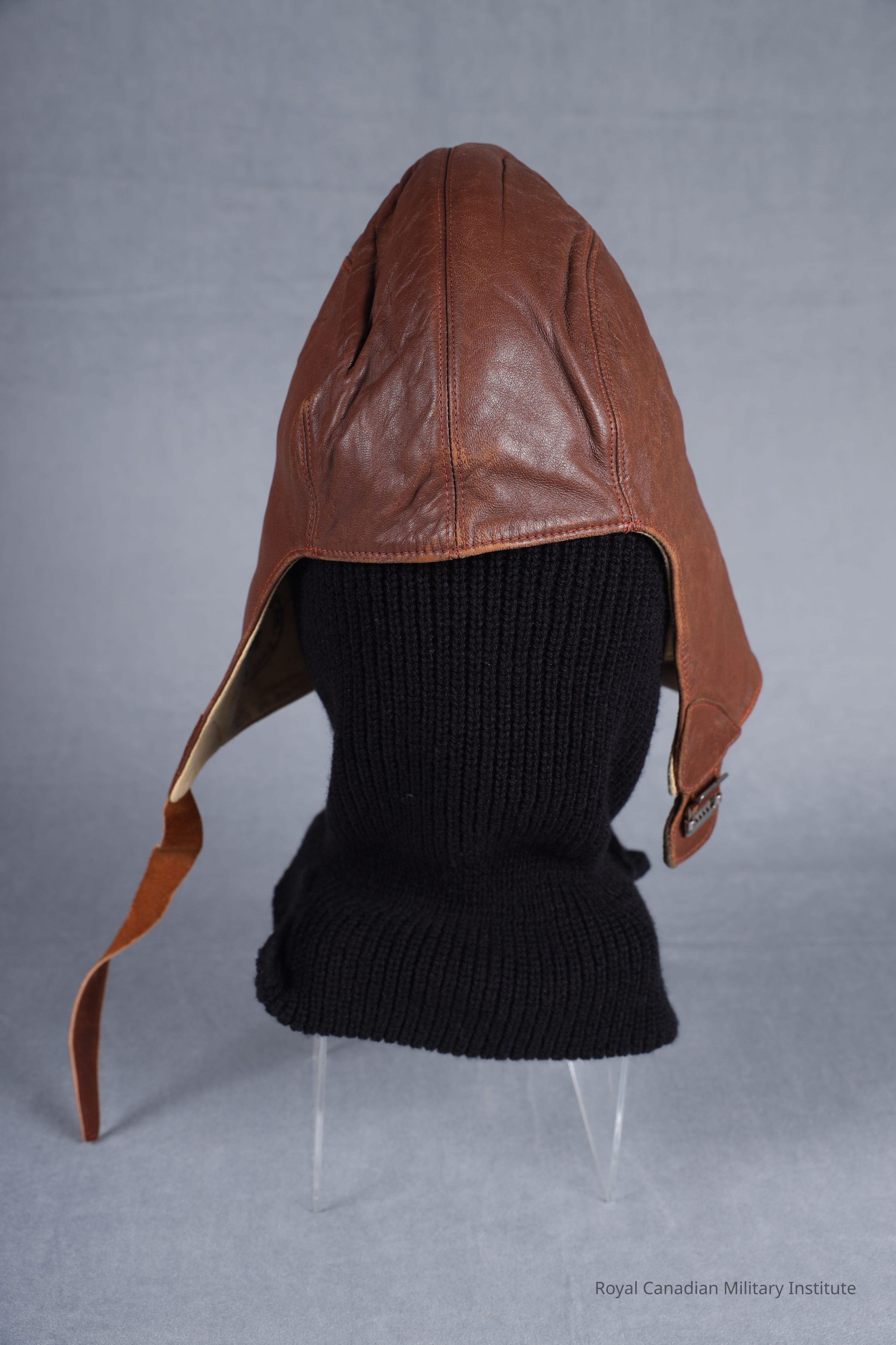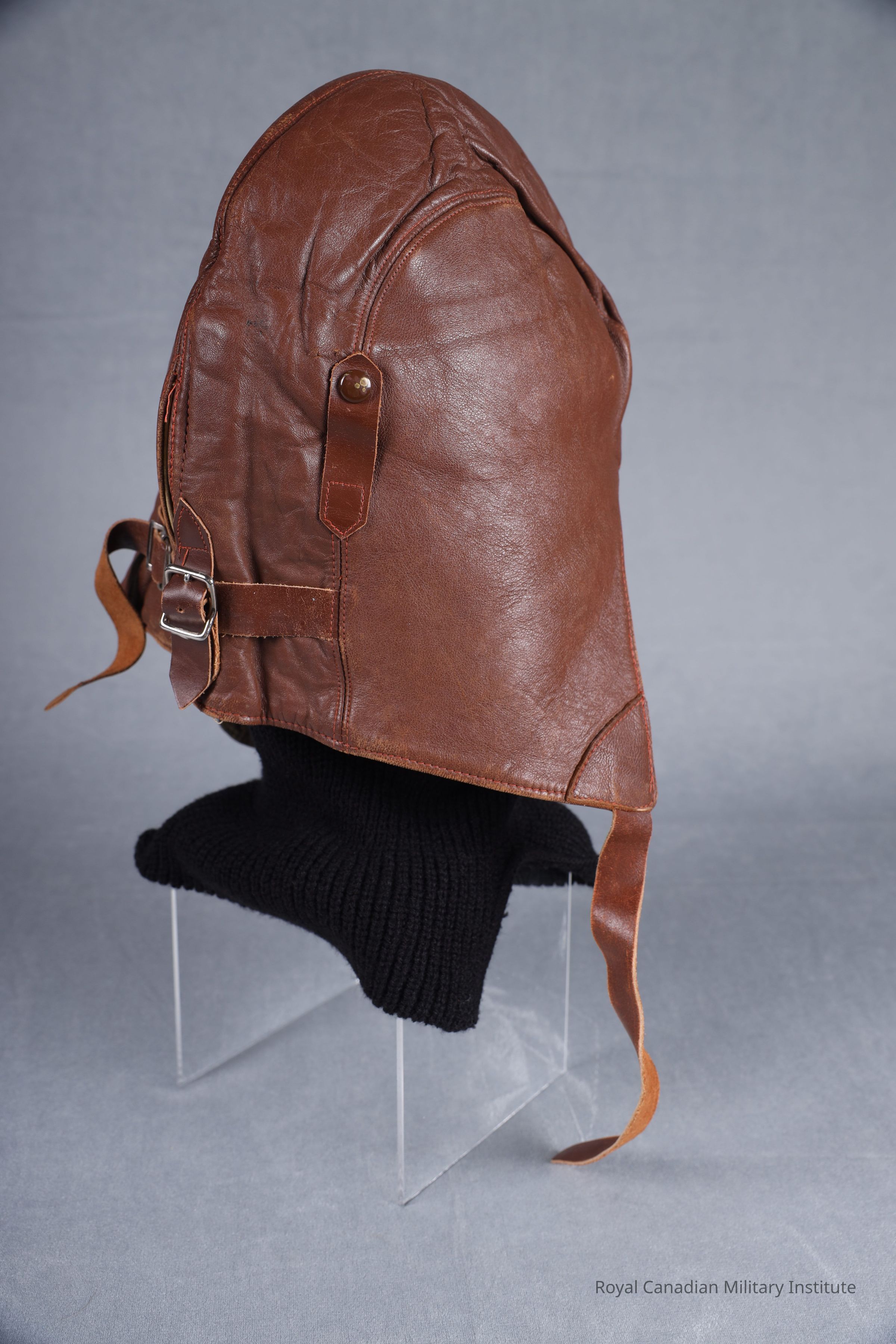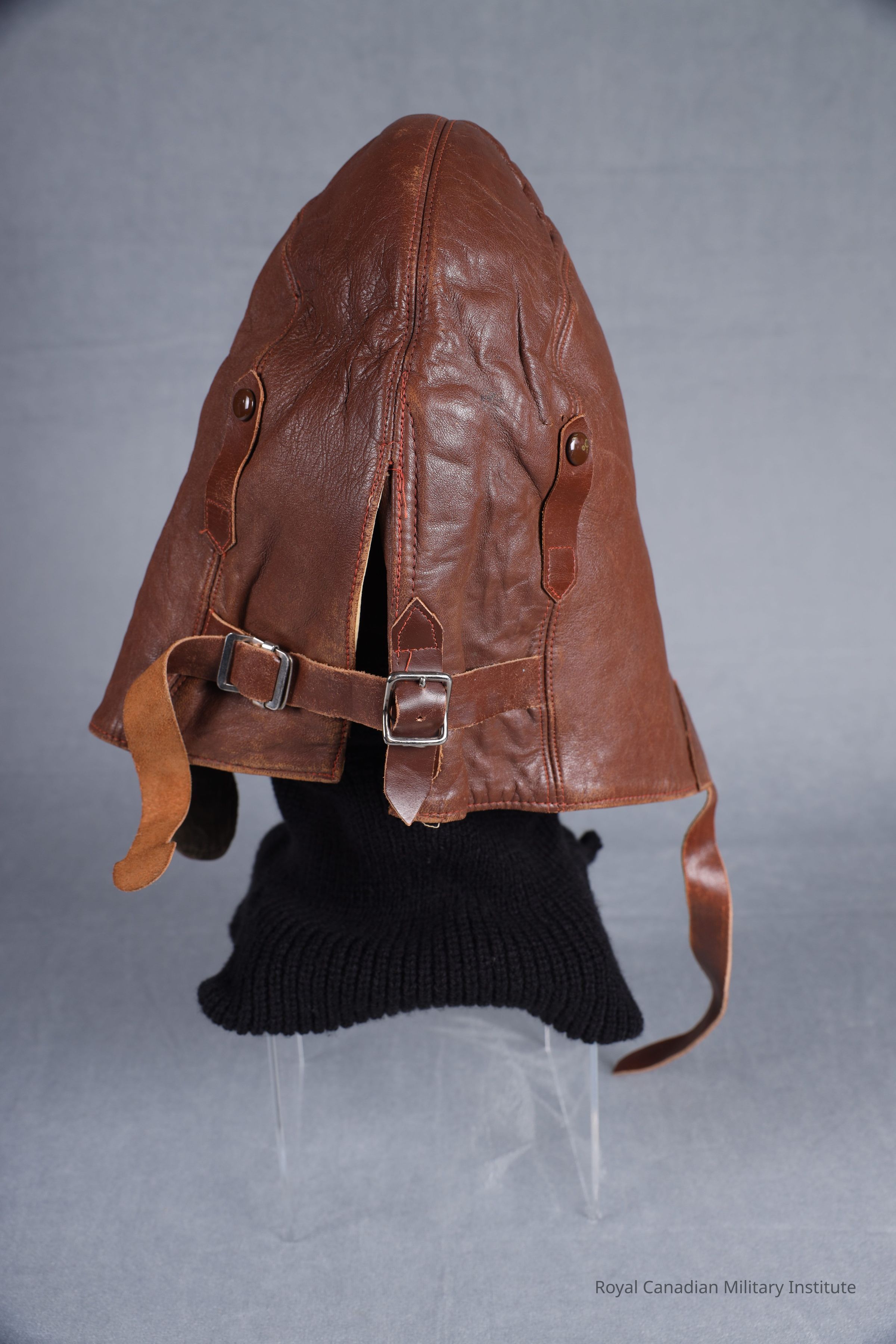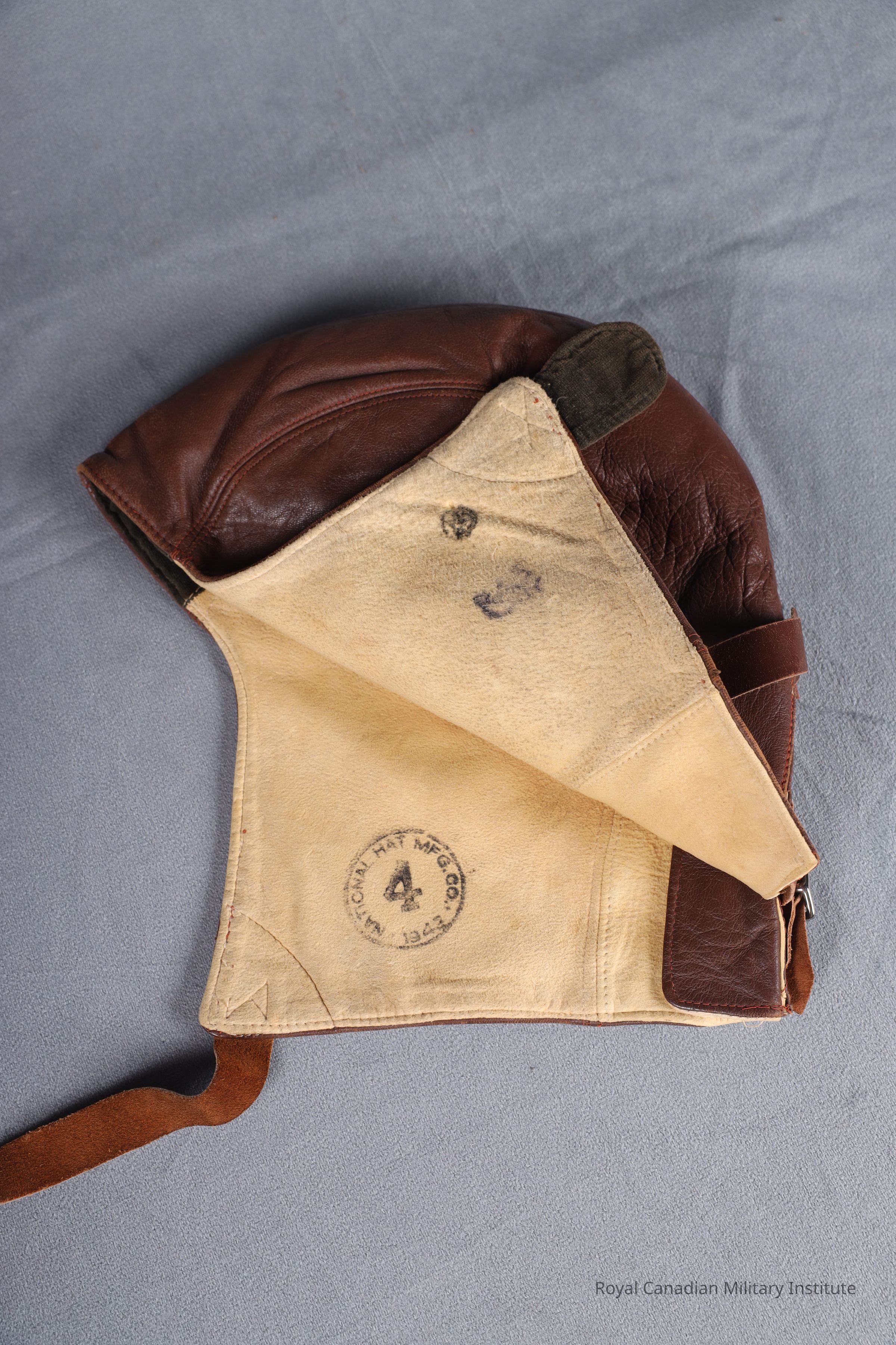 1943-1945 Royal Canadian Air Force Type "B" flying helmet. Bowl-shaped dark brown leather. At least six machine stitched outer panels, fittings of two snap-fastened vertical straps (for holding goggles), two rear straps for adjusting neck fit (steel buckles). Chinstrap with adjustble buckle. Four panels tan chamois leather for lining.Made/Created