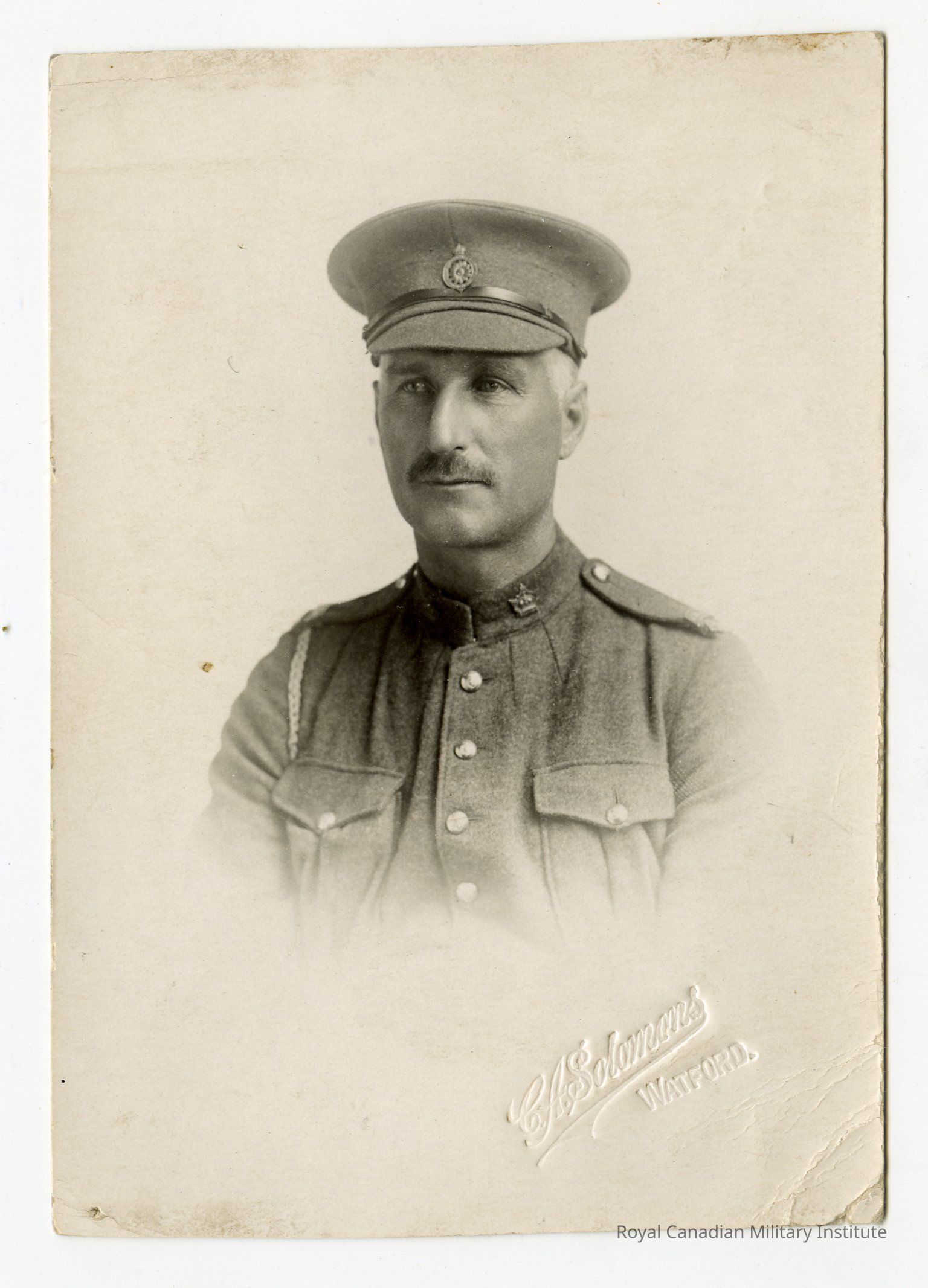 An unidentified Real Photo Postcard (RPPC) of a Princess Patricia's Canadian Light Infantry (PPCLI) private. His line of sight is slightly to the right of the camera. "C.A. Solomons / WATFORD." has been embossed onto the photo. Slight wrinkles and tears around the bottom right corner.