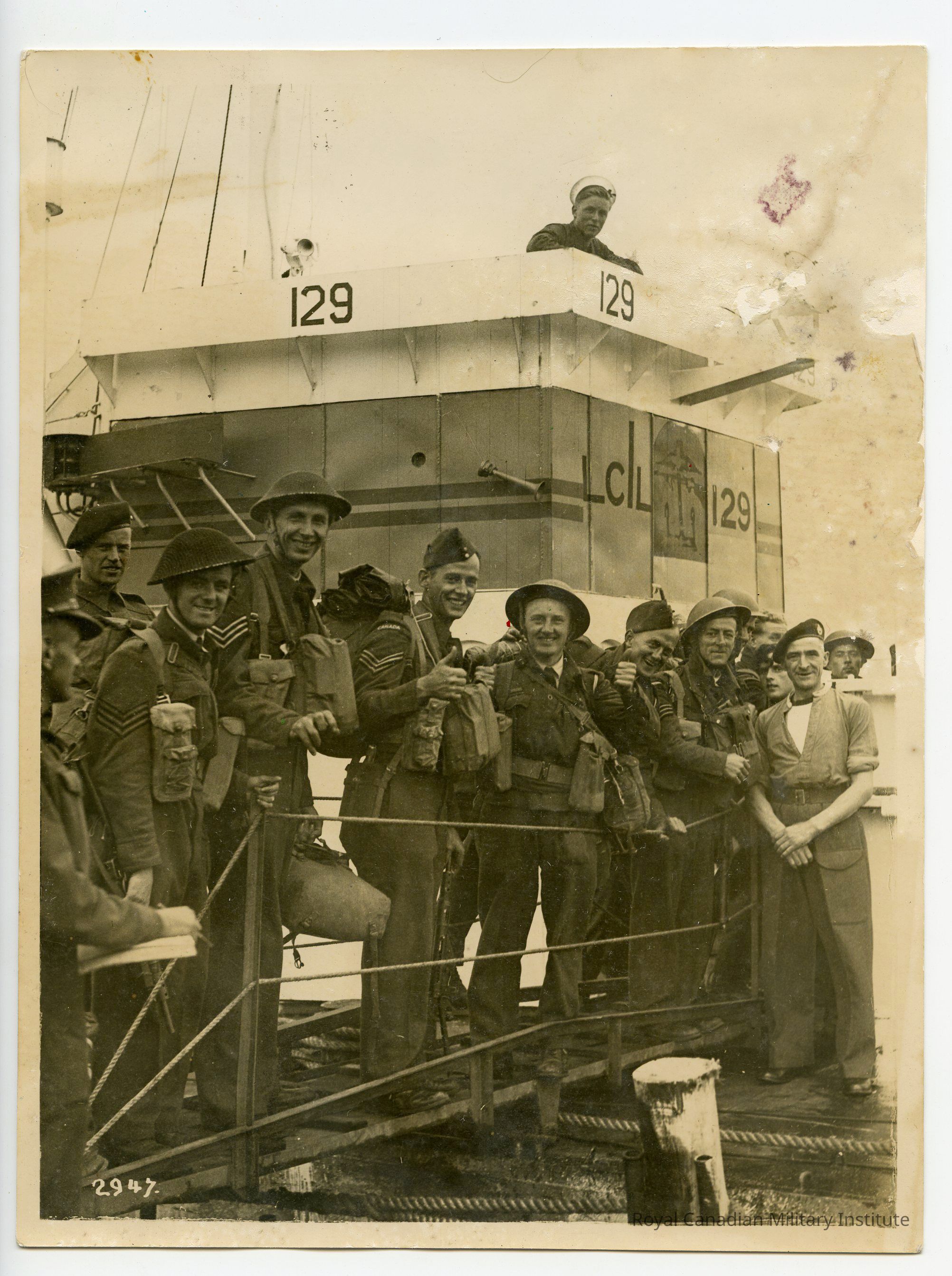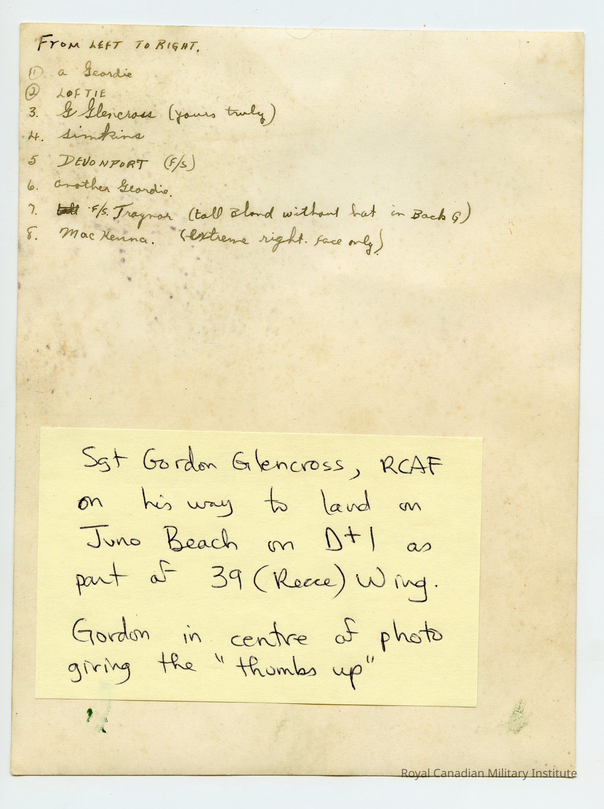 The photograph is of Sergeant Gordon J. Glencross of the R.C.A.F. on June 7th, 1944 on his way to land at Juno Beach the day after D-day as part of the 39 Rocce Wing. He is the one in the centre of the photograph giving "thumbs up".Made/Created