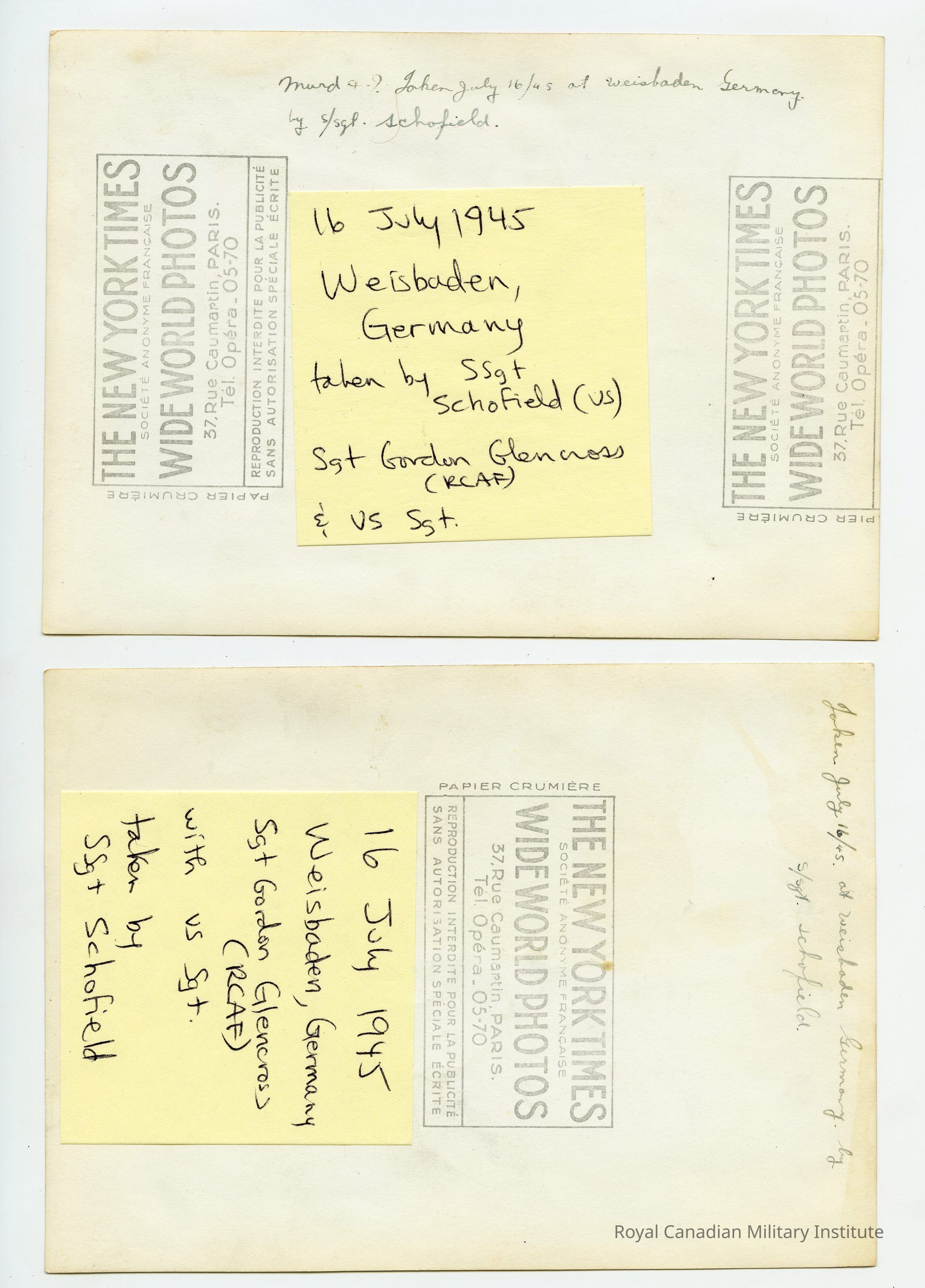 Two photographs of the same image. Taken on July 16 1945, Weisbaden, Germany. It was taken by S. Sergeant Schofield with Sergeant Gordon Glencross.