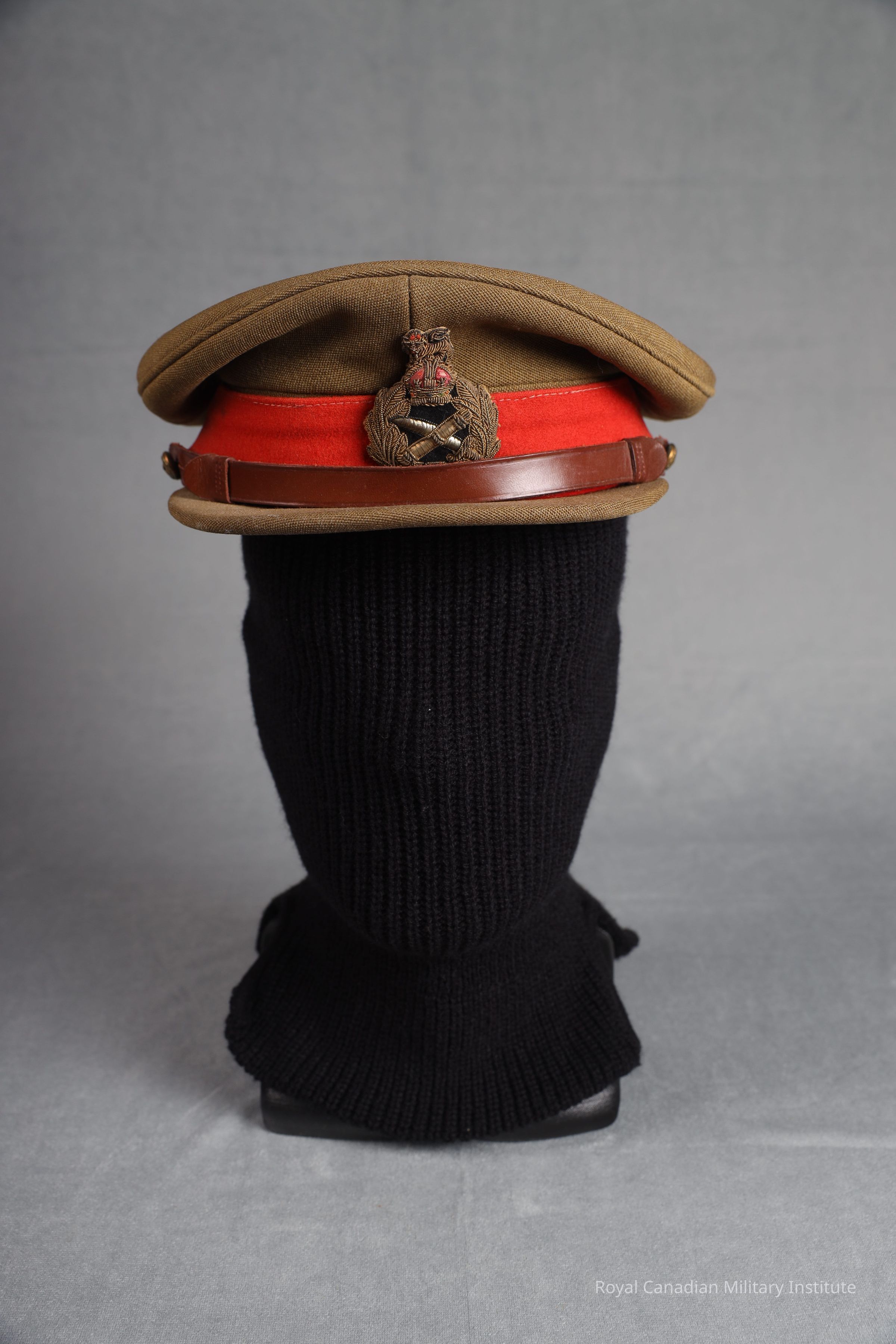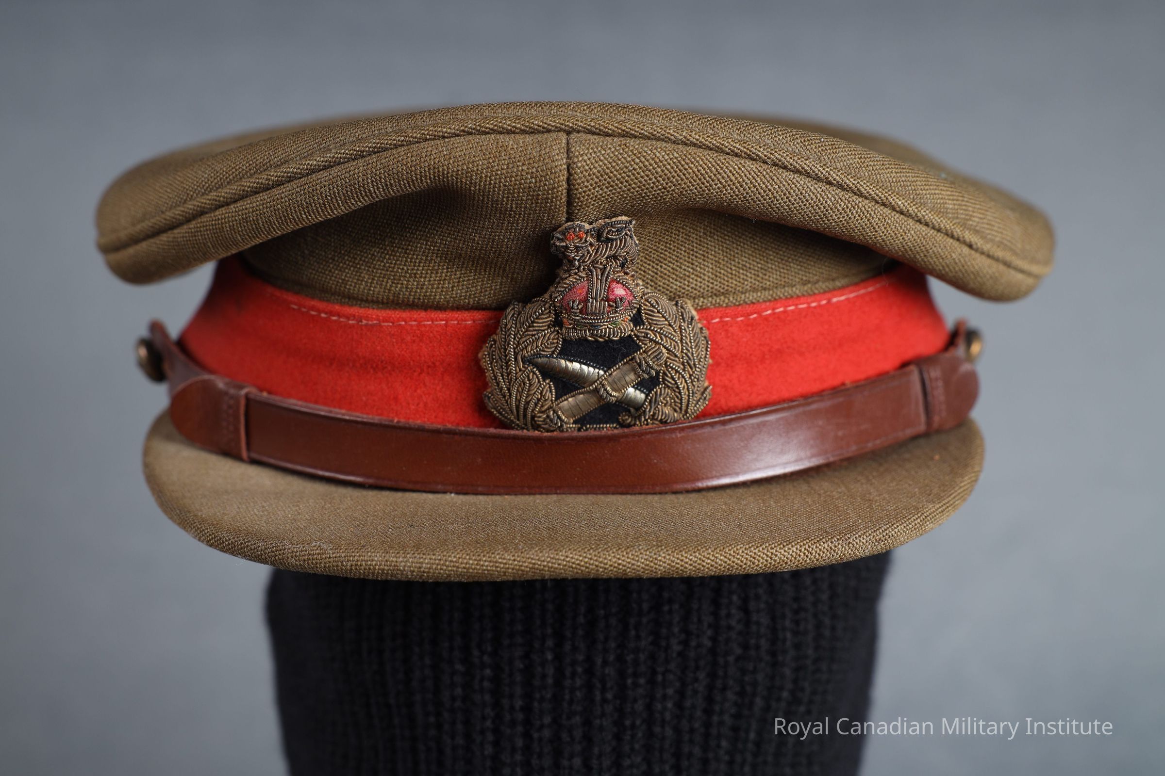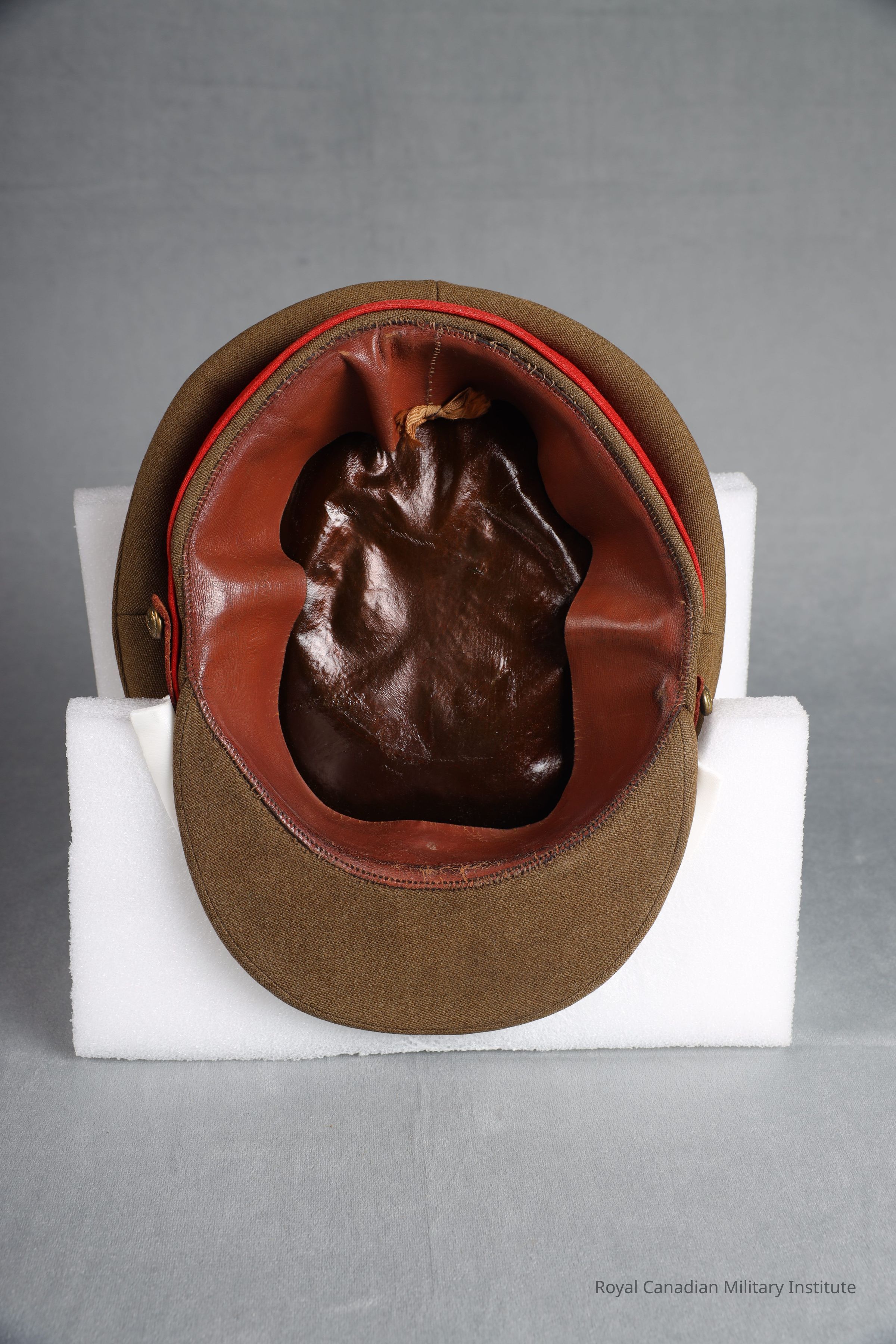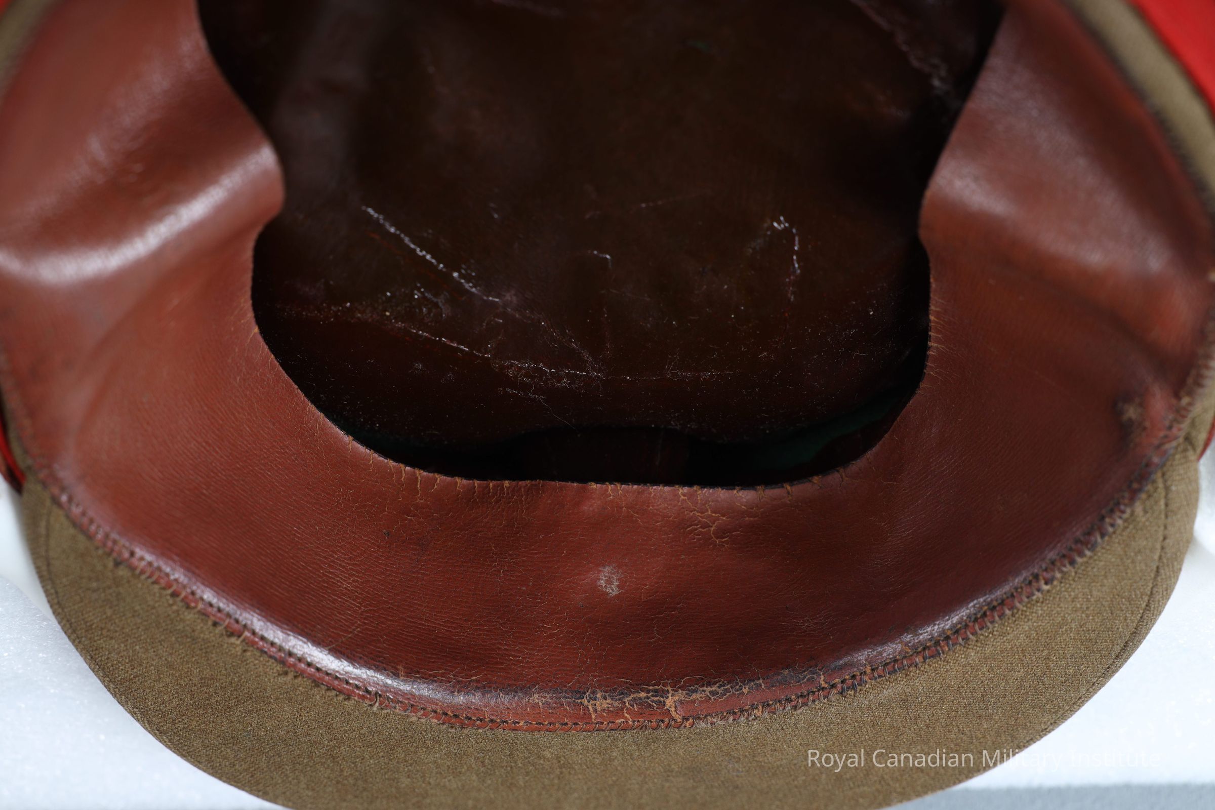 1944-1945 Canadian Army General Officer's service dress cap. Circular, peaked khaki wool. Machine-stitched construction. Crown is shaped down at sides. Red wool "General Officer's" cap band with sewn-in gold bullion wire/black velvet/red velvet Genral Officer's cap badge 5x6 cms, 2 cms. thick. Brown leather chinstrap 1.5 x 32 cms. with two 1.2 cm. diameter General Officer's pattern gilt metal buttons. Brown leather sweatband with inserted soft paper spacer at rear 5.2 x 23.5 cms.Made/Created