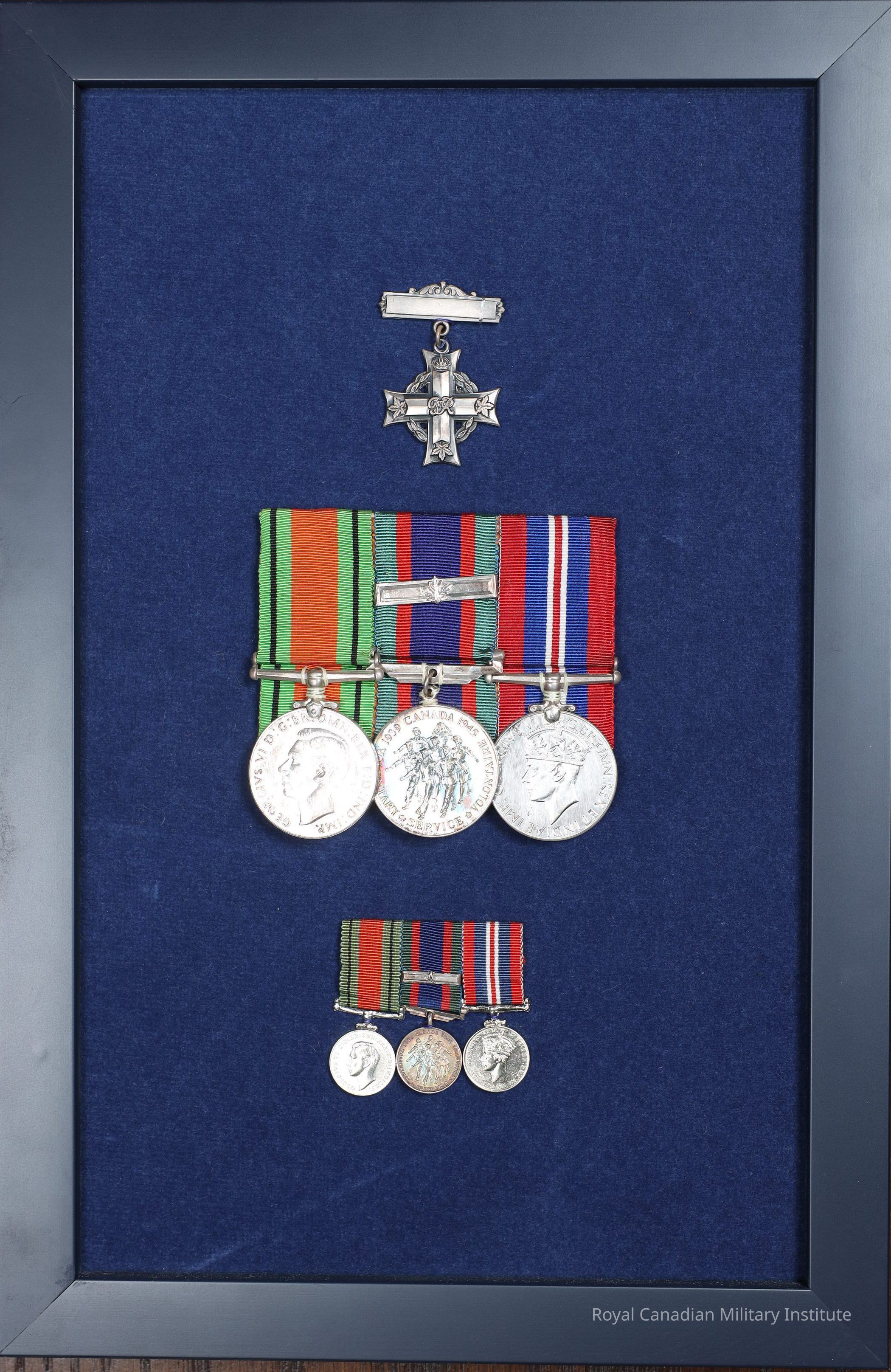 1939-1945 Defence Medal. Circular, sterling silver. Obverse King George VI head facing left, title "GEORGIVS VI D G BR OMN REX F D IND IMP" Reverse an oak tree stump, lion and unicorn, title "1939 1945 THE DEFENCE MEDAL" Suspender a toe claw and plain bar. Ribbon is green with two thin black stripes and one thick orange centre stripe.Made/Created