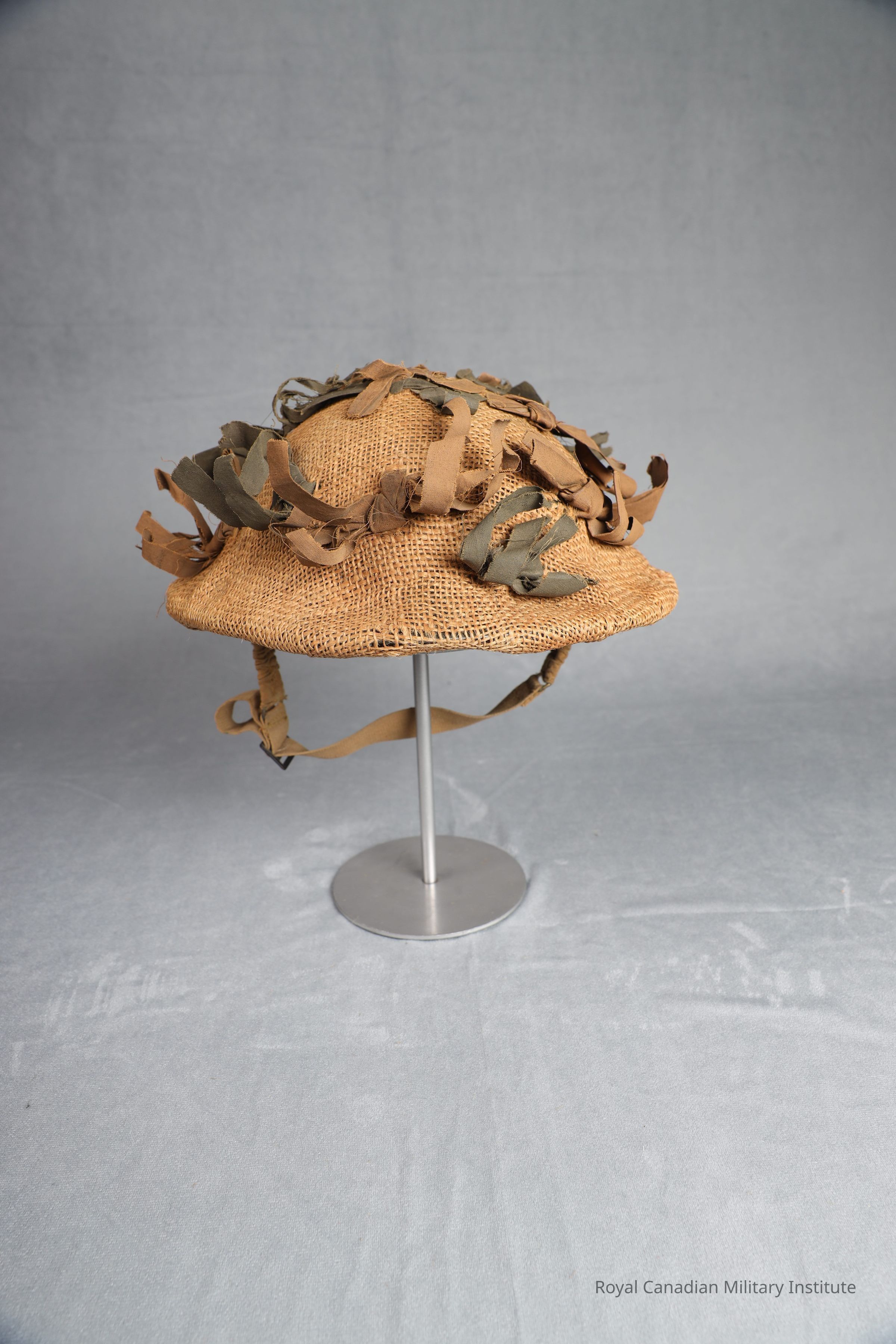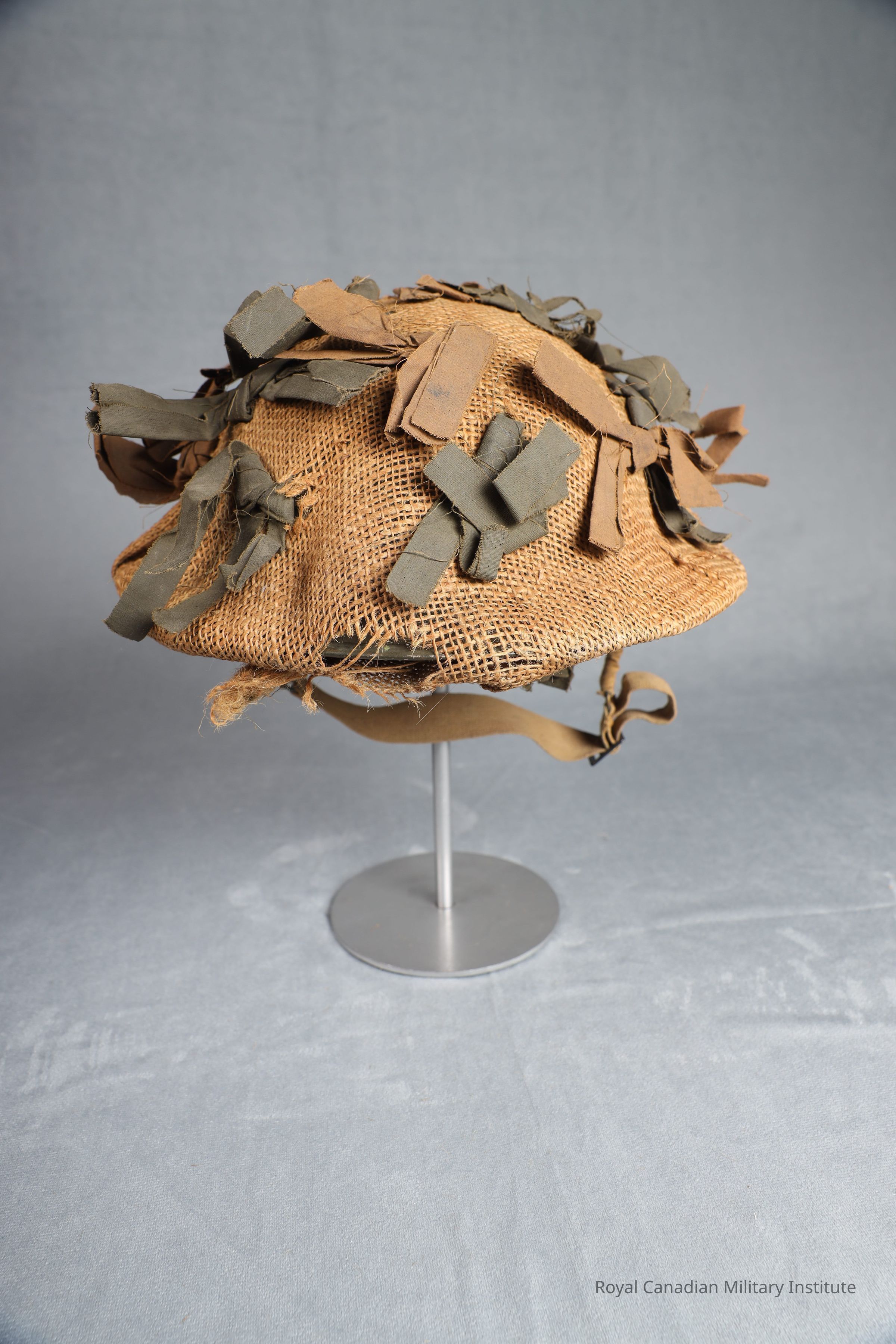 1940-1942 Canadian Army Mark II steel helmet with camo scrim. rimmed light bowl shape, with matte light olive-green finish. Camo scrim covers entirety of outer shell, comprised of light brown hessian net and knots of olive-green and brown leather straps. Underside features a rubberised canvas suspension system attached to the helmet by a screw bolt anf four-armed pad base. Elasticated web and cotton Chinstrap (3cm wide, 40cm long) fixed by bales on either side. No discernable maker's mark, but most likely manufactured by C.L./C. between 1940 and 1942.Made/Created