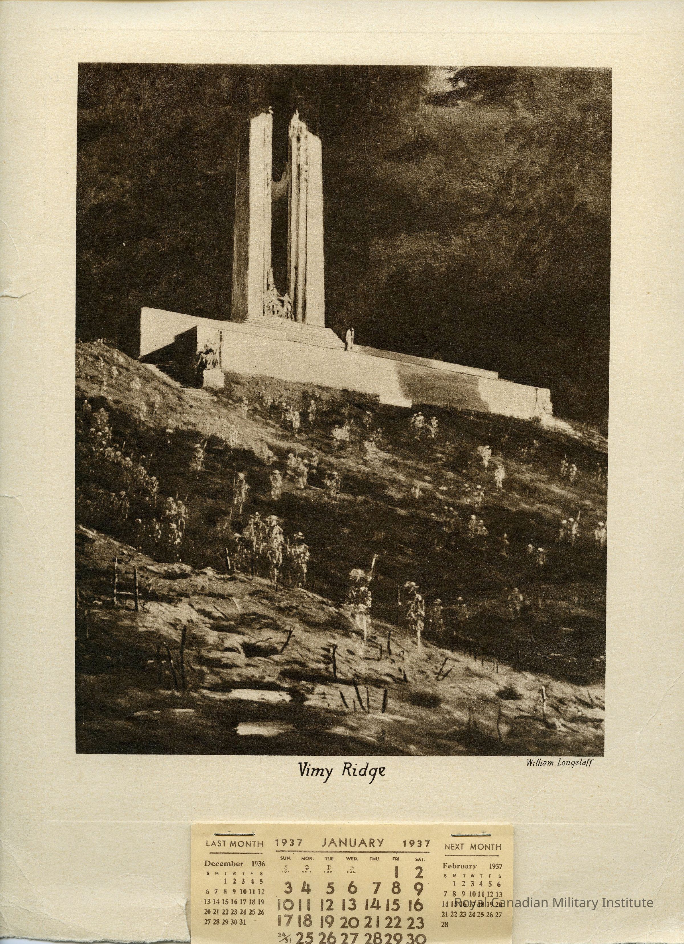 1937 Canadian civilian "Vimy Ridge" calendar. Rectangular, tan-white card stock, features16.5 x 21.5 cm sepia-toned William Longstaff print of "ghost Canadian soldiers" advancing up Vimy Ridge towards the new Vimy memorial. Below the image is stapled 12 rectangular tan/sepia calendar pages for january-December 1937, these are 4 x 10 cms. Calendar is holed at top for wall hanging.