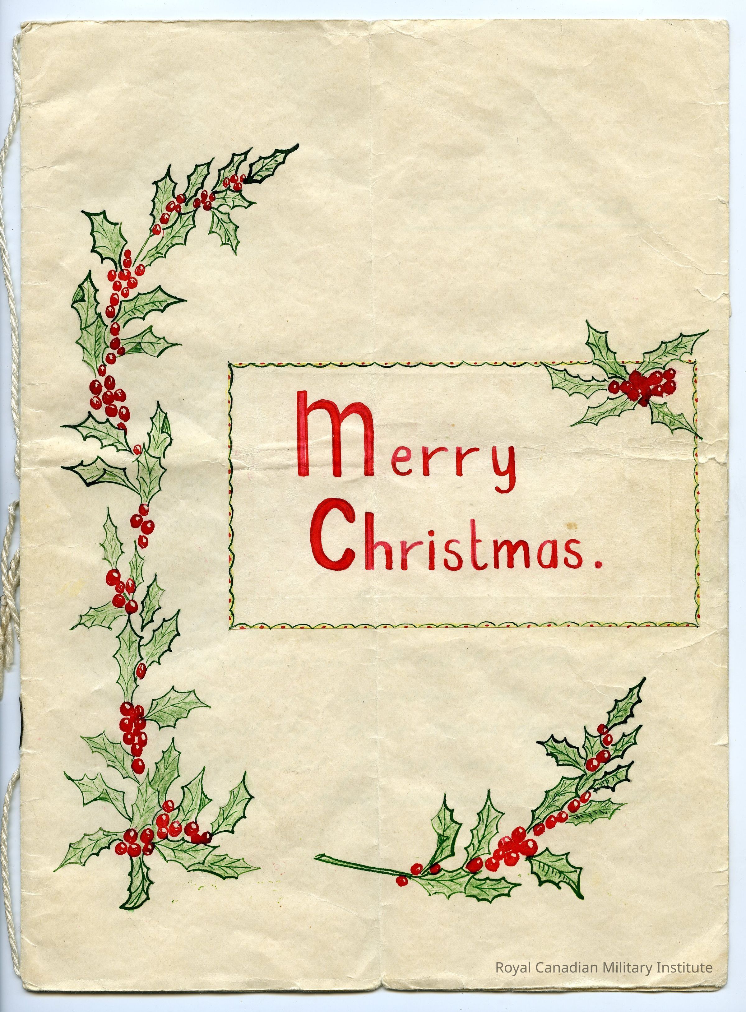 Front cover features hand-drawn sprigs of holly and berries/mistletoe. On the centre-right of the cover is a styalistically-drawn box, featuring the words "Merry Christmas".