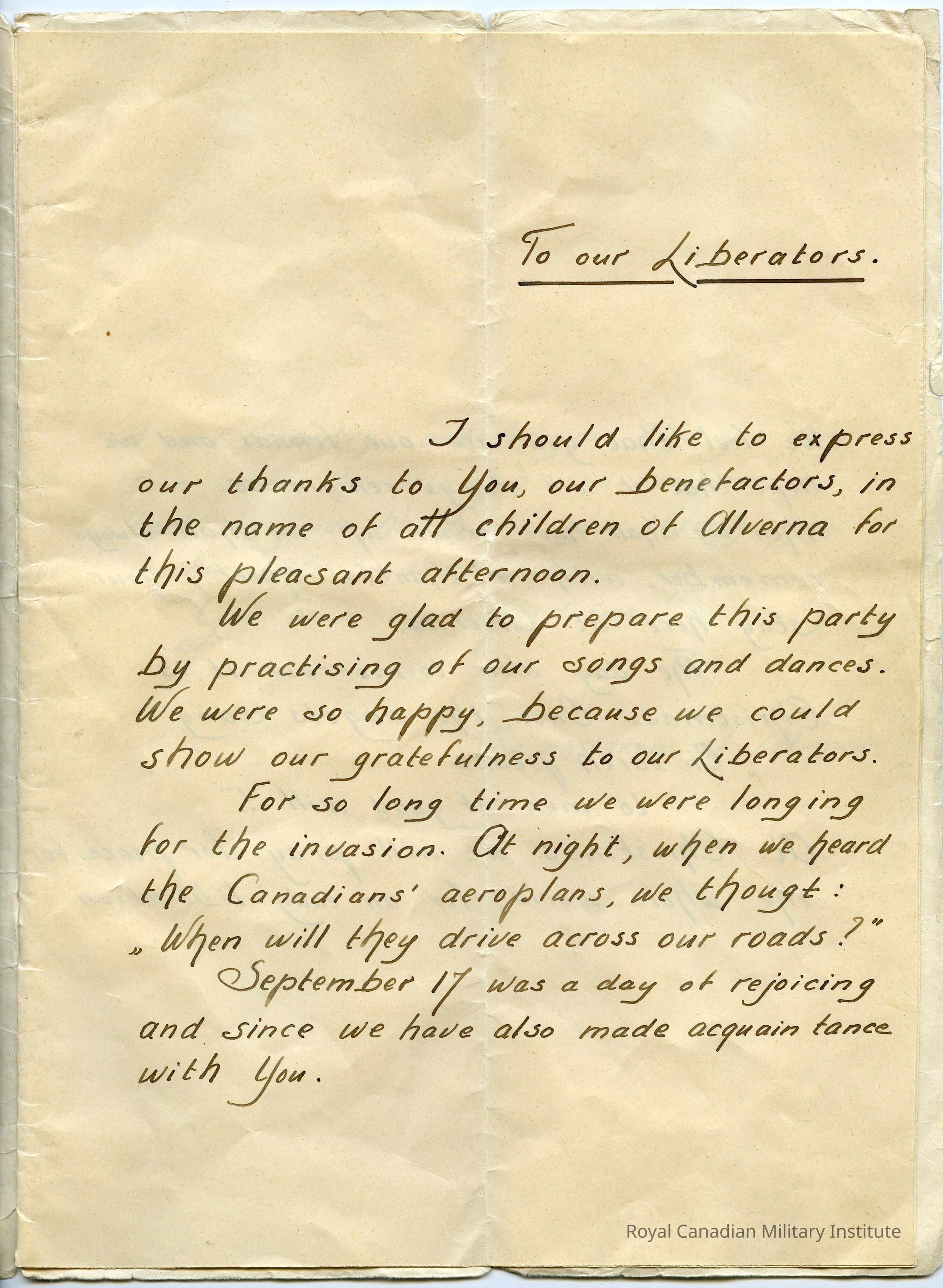 "To our Liberators./ I should like to express / our thanks to you, our benefactors, in / the name of all children of alverna for / this pleasant afternoon. / We were glad to prepare this party / by practising of our songs and dances. / We were so happy, because we could / show our gratefulness to our Liberators. / For so long time we were longing / for the invasion. At night, when we heard / the Canadians' aeroplanes, we thought: / 'When will they drive across our roads?' / September 17 was a day of rejoicing / and since we have also made acquaintance / with you."