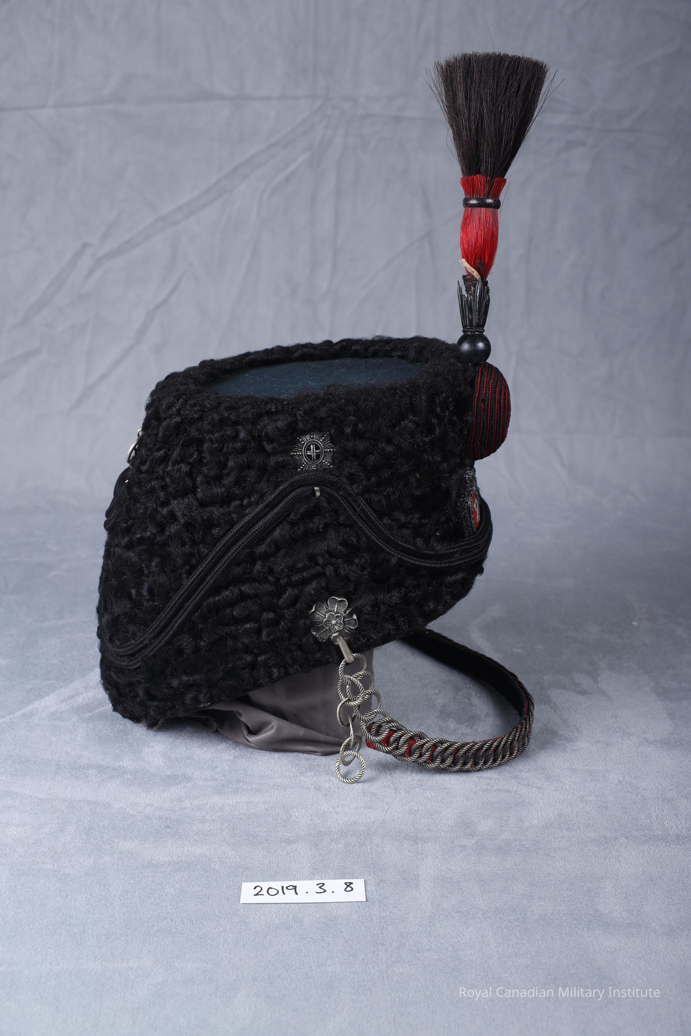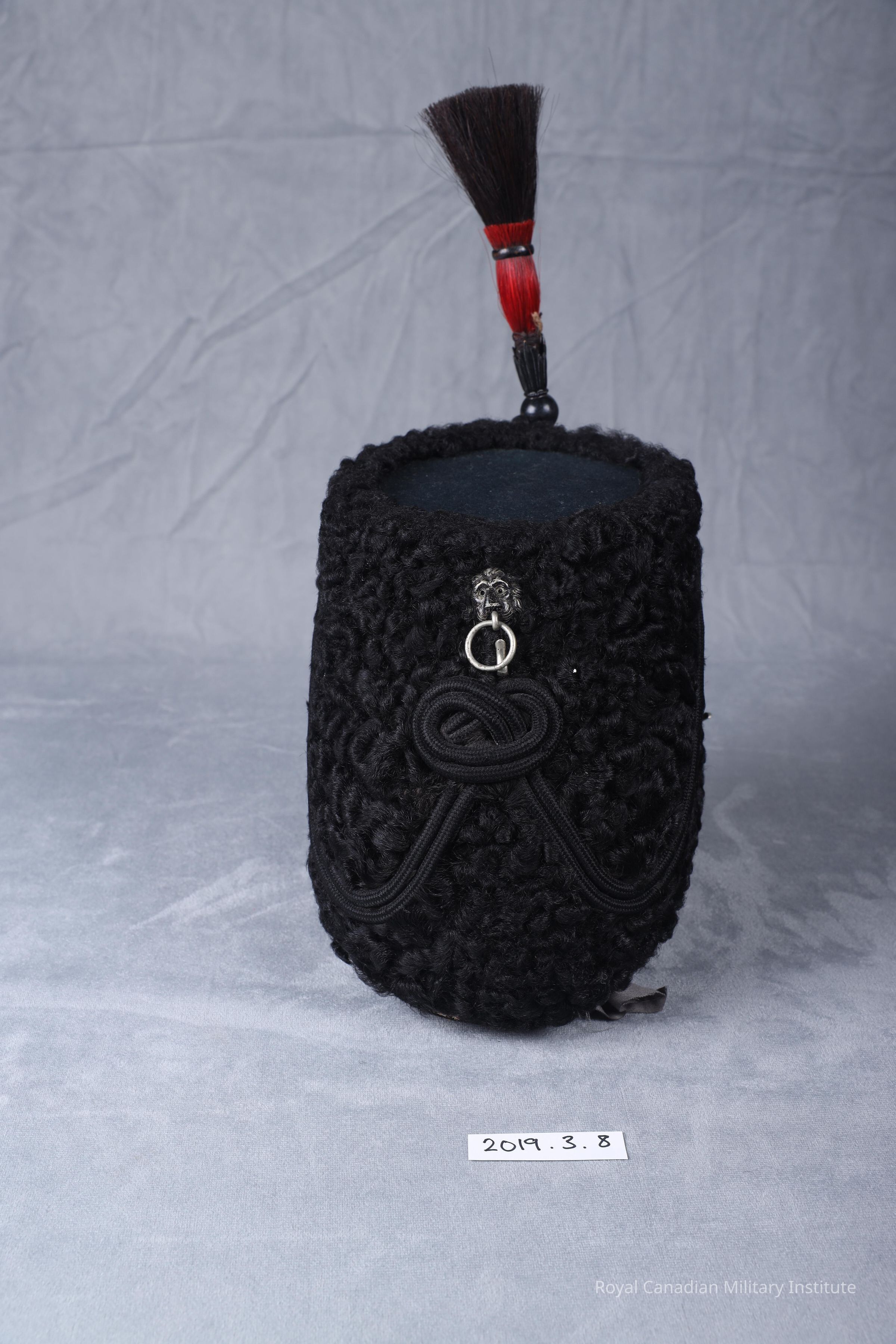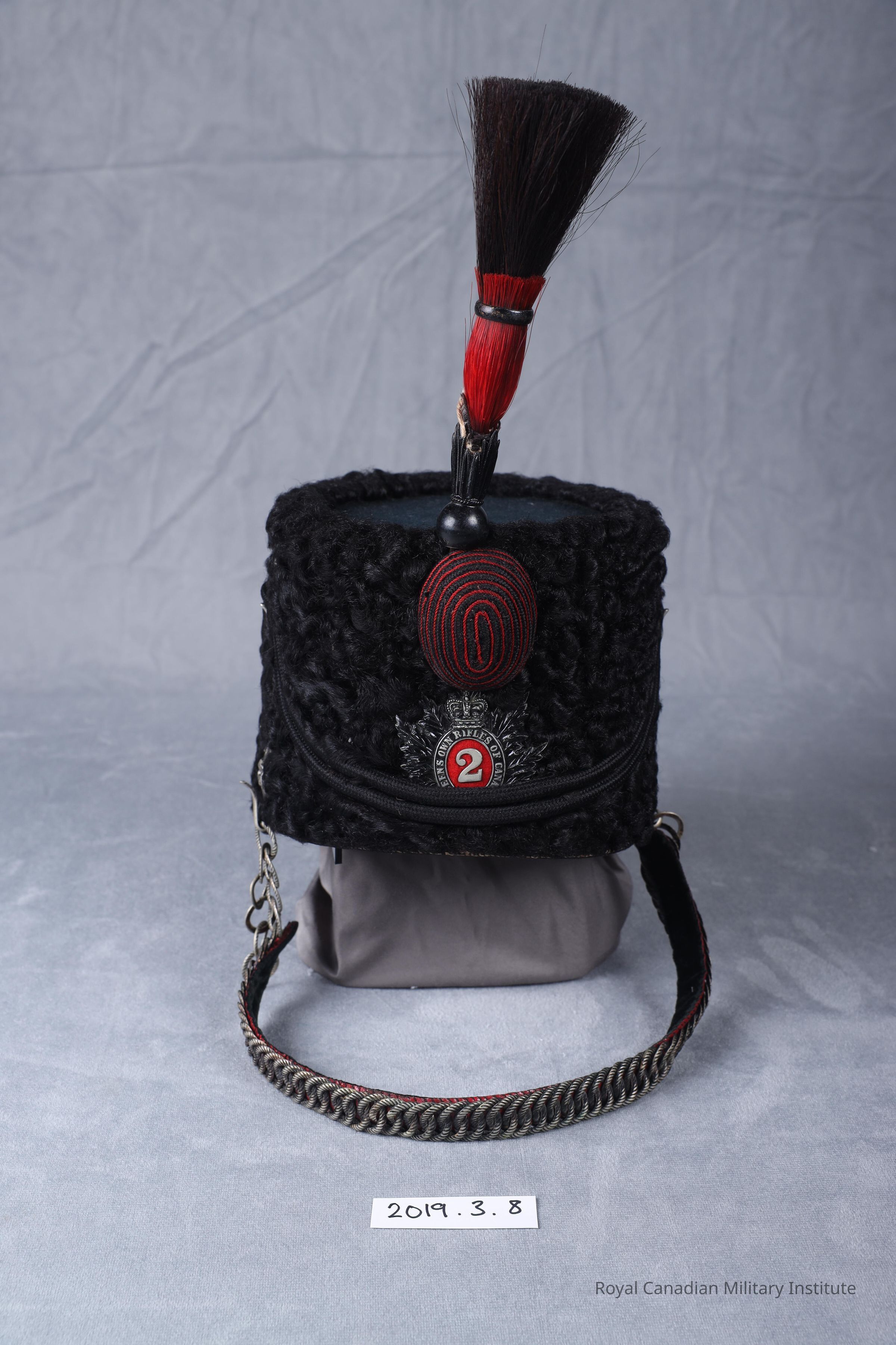 1890-1913 Queen's Own Rifles officer's busby made of black astrakhan fur and stiffened with cork. The top is covered with black felt. On the front is a black and sliver cap badge (5.5 cm x 5 cm) denoting the Queen's Own Rifles. The centre is made of red felt and is fronted with the number "2." Over the badge is an oval centrepiece ( 5.5 cm long x 4.5 cm wide) made of red and black cording. The plume (19 cm long from base) is made of black and red horsehair, stuck into a black ball base. On either side of the busby, towards the bottom rim is a silver rosette hook (4 cm long x 2.5 cm wide) to loop the chinstrap. Directly above this rosette, on the top rim is another silver hook (4 cm long x 2.5 cm wide) to secure the two row black cord around the body of the busby. On the back, the two row cord loops around itself. Over the loop is a silver lion hook and ring. The chinstrap (47 cm long x 1.6 cm wide) is silver chain backed onto a red material and black felt.